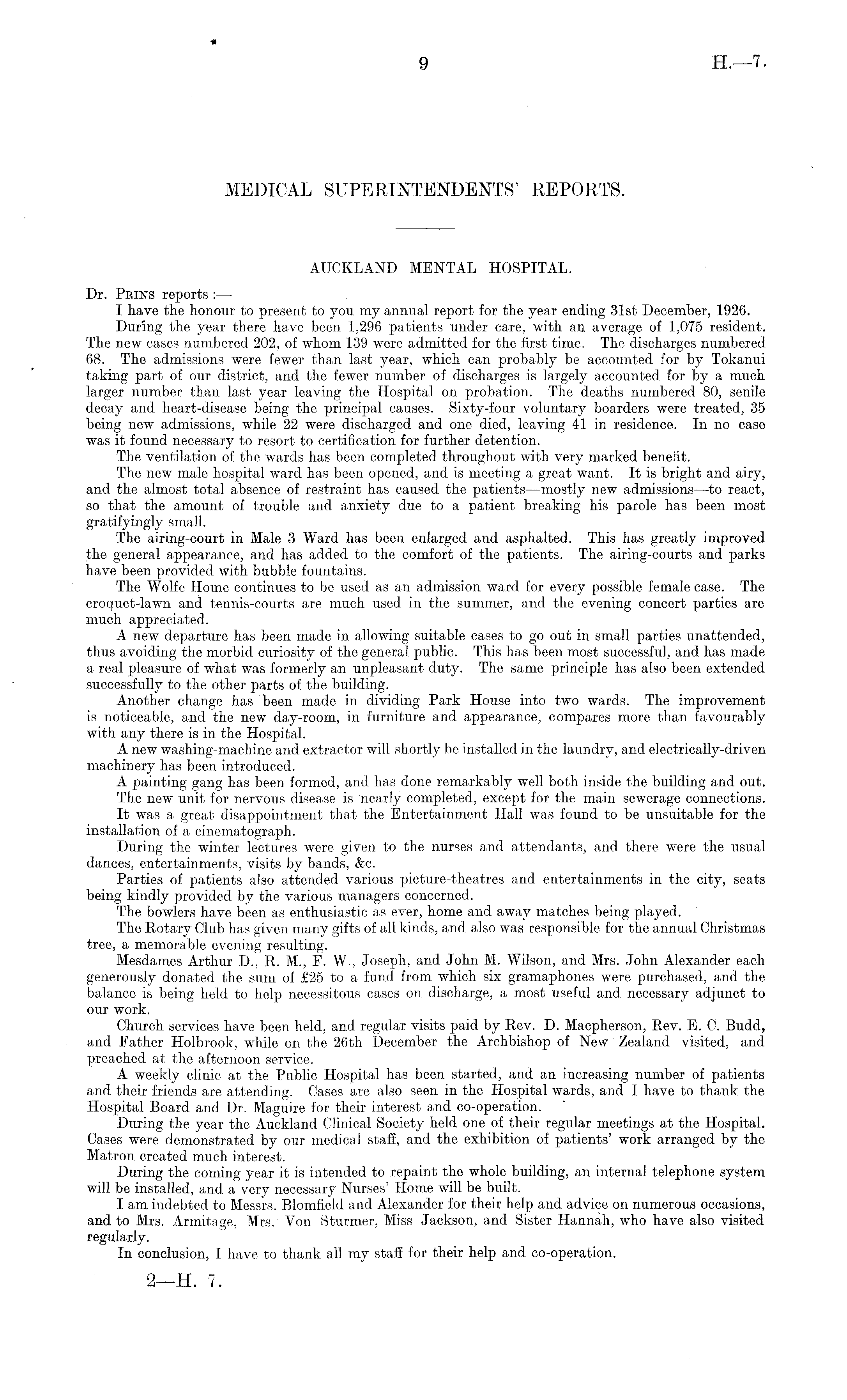 MEDICAL SUPERINTENDENTS' REPORTS. AUCKLAND MENTAL HOSPITAL. Dr. Prins reports : — I have the honour to present to you my annual report for the year ending 31st December, 1926. During the year there have been 1,296 patients under care, with an average of 1,075 resident. The new cases numbered 202, of whom 139 were admitted for the first time. The discharges numbered 68. The admissions were fewer than last year, which can probably be accounted for by Tokanui taking part of our district, and the fewer number of discharges is largely accounted for by a much larger number than last year leaving the Hospital on probation. The deaths numbered 80, senile decay and heart-disease being the principal causes. Sixty-four voluntary boarders were treated, 35 being new admissions, while 22 were discharged and one died, leaving 41 in residence. In no case was it found necessary to resort to certification for further detention. The ventilation of the wards has been completed throughout with very marked benefit. The new male hospital ward has been opened, and is meeting a great want. It is bright and airy, and the almost total absence of restraint has caused the patients—mostly new admissions—to react, so that the amount of trouble and anxiety due to a patient breaking his parole has been most gratifyingly small. The airing-court in Male 3 Ward has been enlarged and asphalted. This has greatly improved the general appearance, and has added to the comfort of the patients. The airing-courts and parks have been provided with bubble fountains. The Wolfe Home continues to be used as an admission ward for every possible female case. The croquet-lawn and tennis-courts are much used in the summer, and the evening concert parties are much appreciated. A new departure has been made in allowing suitable cases to go out in small parties unattended, thus avoiding the morbid curiosity of the general public. This has been most successful, and has made a real pleasure of what was formerly an unpleasant duty. The same principle has also been extended successfully to the other parts of the building. Another change has been made in dividing Park House into two wards. The improvement is noticeable, and the new day-room, in furniture and appearance, compares more than favourably with any there is in the Hospital. A new washing-machine and extractor will shortly be installed in the laundry, and electrically-driven machinery has been introduced. A painting gang has been formed, and has done remarkably well both inside the building and out. The new unit for nervous disease is nearly completed, except for the main sewerage connections. It was a great disappointment that the Entertainment Hall was found to be unsuitable for the installation of a cinematograph. During the winter lectures were given to the nurses and attendants, and there were the usual dances, entertainments, visits by bands, &c. Parties of patients also attended various picture-theatres and entertainments in the city, seats being kindly provided by the various managers concerned. The bowlers have been as enthusiastic as ever, home and away matches being played. The Rotary Club has given many gifts of all kinds, and also was responsible for the annual Christmas tree, a memorable evening resulting. Mesdames Arthur D., R. M., F. W., Joseph, and John M. Wilson, and Mrs. John Alexander each generously donated the sum of £25 to a fund from which six gramaphones were purchased, and the balance is being held to help necessitous cases on discharge, a most useful and necessary adjunct to our work. Church services have been held, and regular visits paid by Rev. D. Macpherson, Rev. E. C. Budd, and Father Holbrook, while on the 26th December the Archbishop of New Zealand visited, and preached at the afternoon service. A weekly clinic at the Public Hospital has been started, and an increasing number of patients and their friends are attending. Cases are also seen in the Hospital wards, and I have to thank the Hospital Board and Dr. Maguire for their interest and co-operation. During the year the Auckland Clinical Society held one of their regular meetings at the Hospital. Cases were demonstrated by our medical staff, and the exhibition of patients' work arranged by the Matron created much interest. During the coming year it is intended to repaint the whole building, an internal telephone system will be installed, and a very necessary Nurses' Home will be built. I am indebted to Messrs. Blomfield and Alexander for their help and advice on numerous occasions, and to Mrs. Armitage, Mrs. Von Sturmer, Miss Jackson, and Sister Hannah, who have also visited regularly. In conclusion, I have to thank all my staff for their help and co-operation.