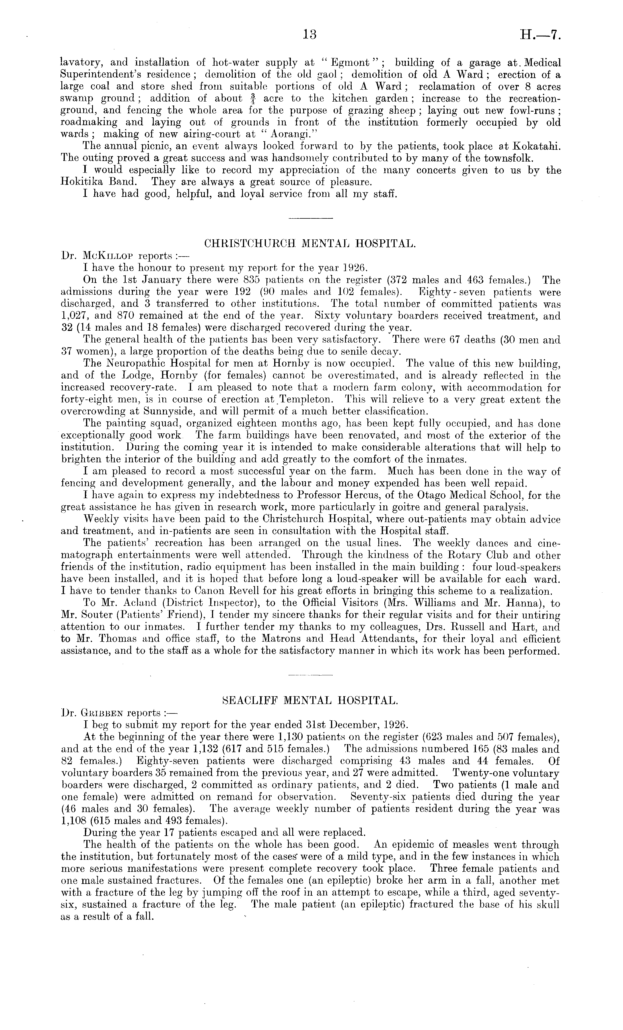 CHRISTCHURCH MENTAL HOSPITAL. Dr. MgKillop reports I have the honour to present my report for the year 1926. On the Ist January there were 835 patients on the register (372 males and 463 females.) The admissions during the year were 192 (90 males and 102 females). Eighty-seven patients were discharged, and 3 transferred to other institutions. The total number of committed patients was 1,027, and 870 remained at the end of the year. Sixty voluntary boarders received treatment, and 32 (14 males and 18 females) were discharged recovered during the year. The general health of the patients has been very satisfactory. There were 67 deaths (30 men and 37 women), a large proportion of the deaths being due to senile decay. The Neuropathic Hospital for men at Hornby is now occupied. The value of this new building, and of the Lodge, Hornby (for females) cannot be overestimated, and is already reflected in the increased recovery-rate. lam pleased to note that a modern farm colony, with accommodation for forty-eight men, is in course of erection at.Templeton. This will relieve to a very great extent the overcrowding at Sunnyside, and will permit of a much better classification. The painting squad, organized eighteen months ago, has been kept fully occupied, and has done exceptionally good work The farm buildings have been renovated, and most of the exterior of the institution. During the coming year it is intended to make considerable alterations that will help to brighten the interior of the building and add greatly to the comfort of the inmates. lam pleased to record a most successful year on the farm. Much has been done in the way of fencing and development generally, and the labour and money expended has been well repaid. I have again to express my indebtedness to Professor Hercus, of the Otago Medical School, for the great assistance he has given in research work, more particularly in goitre and general paralysis. Weekly visits have been paid to the Christchurch Hospital, where out-patients may obtain advice and treatment, and in-patients are seen in consultation with the Hospital staff. The patients' recreation has been arranged on the usual lines. The weekly dances and cinematograph entertainments were well attended. Through the kindness of the Rotary Club and other friends of the institution, radio equipment has been installed in the main building : four loud-speakers have been installed, and it is hoped that before long a loud-speaker will be available for each ward. I have to tender thanks to Canon Revell for his great efforts in bringing this scheme to a realization. To Mr. Acland (District Inspector), to the Official Visitors (Mrs. Williams and Mr. Hanna), to Mr. Souter (Patients' Friend), I tender my sincere thanks for their regular visits and for their untiring attention to our inmates. I further tender my thanks to my colleagues, Drs. Russell and Hart, and to Mr. Thomas and office staff, to the Matrons and Head Attendants, for their loyal and efficient assistance, and to the staff as a whole for the satisfactory manner in which its work has been performed. SEACLIFF MENTAL HOSPITAL. Dr. Gribben reports : — I beg to submit my report for the year ended 31st December, 1926. At the beginning of the year there were 1,130 patients on the register (623 males and 507 females), and at the end of the year 1,132 (617 and 515 females.) The admissions numbered 165 (83 males and 82 females.) Eighty-seven patients were discharged comprising 43 males and 44 females. Of voluntary boarders 35 remained from the previous year, and 27 were admitted. Twenty-one voluntary boarders were discharged, 2 committed as ordinary patients, and 2 died. Two patients (1 male and one female) were admitted on remand for observation. Seventy-six patients died during the year (46 males and 30 females). The average weekly number of patients resident during the year was 1,108 (615 males and 493 females). During the year 17 patients escaped and all were replaced. The health of the patients on the whole has been good. An epidemic of measles went through the institution, but fortunately most of the were of a mild type, and in the few instances in which more serious manifestations were present complete recovery took place. Three female patients and one male sustained fractures. Of the females one (an epileptic) broke her arm in a fall, another met with a fracture of the leg by jumping off the roof in an attempt to escape, while a third, aged seventysix, sustained a fracture of the leg. The male patient (an epileptic) fractured the base of his skull as a result of a fall.