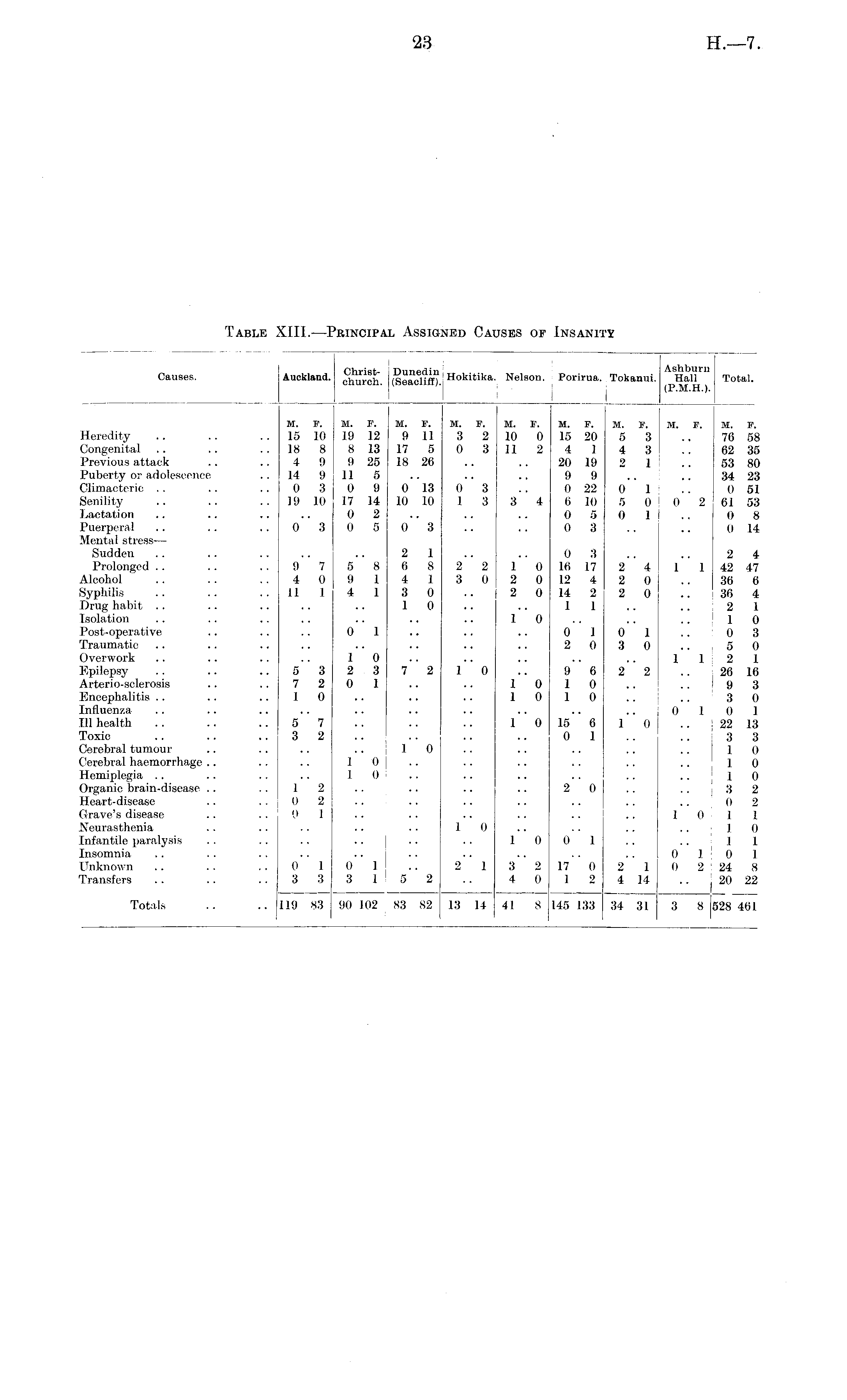 CVhriRt- DnnAfHn Ashburn Causes. Auckland, c h urc h i (Seacliff) Hokitika. Nelson. Porirua. Tokanui. Hall Total. I I I I I M. F. M. F. M. F. M. F. M. F. M. F. M. F. M. F. M. F. Heredity .. .. .. 15 10 19 12 9 11 3 2 10 0 15 20 5 3 .. 76 58 Congenital .. .. 18 8 8 13 17 5 0 3 11 2 4 1 4 3 .. 62 35 Previous attack .. 4 9 9 25 18 26 .. .. 20 19 2 1 .. 53 80 Puberty or adolescence 14 9 11 5 .. .. .. 9 9 .. .. 34 23 Climacteric .. .. 03 09 0 13 03 .. 0 22 01 .. 0 51 Senility .. .. .. 19 10 17 14 10 10 1 3 3 4 6 10 5 0 0 2 61 53 Lactation .. .. .. .. 02 .. .. .. 0 5 01 .. 08 Puerperal .. .. ..0 3 0 5 0 3 .. .. 0 3 .. .. 0 14 Mental stress — Sudden .. .. .. .. .. 21 .. .. 03 .. .. 24 Prolonged .. .. .. 97 58 68 22 10 16 17 24 11 42 47 Alcohol .. .. 40 91 41 30 20 12 4 20 .. 36 6 Syphilis .. .. ..11 1 4 1 30 .. 20142 20 36 4 Drug habit .. .. .. .. .. 10 .. .. 11 .. .. 21 Isolation .. .. .. .. .. .. .. 10 .. .. ..10 Post-operative .. .. .. 01 .. .. .. 0J01 .. 03 Traumatic .. .. .. .. .. .. .. .. 20 3 0 .. 50 Overwork .. .. .. .. 10 .. .. .. .. .. 1121 Epilepsy .. .. ..53 23 72 10 .. 9 6 22 26 16 Arterio-sclerosis .. ..7201 .. .. 10 10 .. ..'93 Encephalitis .. .. ..10 .. .. .. 1010 .. .. 30 Influenza .. .. .. .. .. . .. .. .. .. .. 0 10 1 111 health .. .. ..5 7 .. .. .. 1 0 15 6 1 0 j 22 13 Toxic .. .. ..32 .. .. .. .. 01 .. .. 33 Cerebral tumour .. .. .. 1 0 .. .. .. .. j 1 0 Cerebral haemorrhage .. .. .. 1 0 .. .. .. .. ..10 Hemiplegia .. .. .. .. 10 .. .. .. .. .. ..jlO Organic brain-disease .. .. 12 .. .. .. .. 20 .. ..;32 Heart-disease .. .. 02 .... .. .. .. .. .. ' 0 2 Grave's disease .. .. 01 .. .. .. .. .. .. 1 0 1 1 Neurasthenia .. .. .. .. .. 10 .. .. .. ..10 Infantile paralysis .. .. .. .. 1001 .. ..ill Insomnia .. .. .. .. j .. .. .. .. 0 1 • 0 1 Unknown .. .. .. 01 01; .. 21 32 17 0 21 02: 24 8 Transfers .. .. .. 33 3152 .. 40 12 4 14 .. 20 22 Totals .. .. 119 83 90 102 83 82 13 14 41 8 145 133 34 31 3 8 528 461