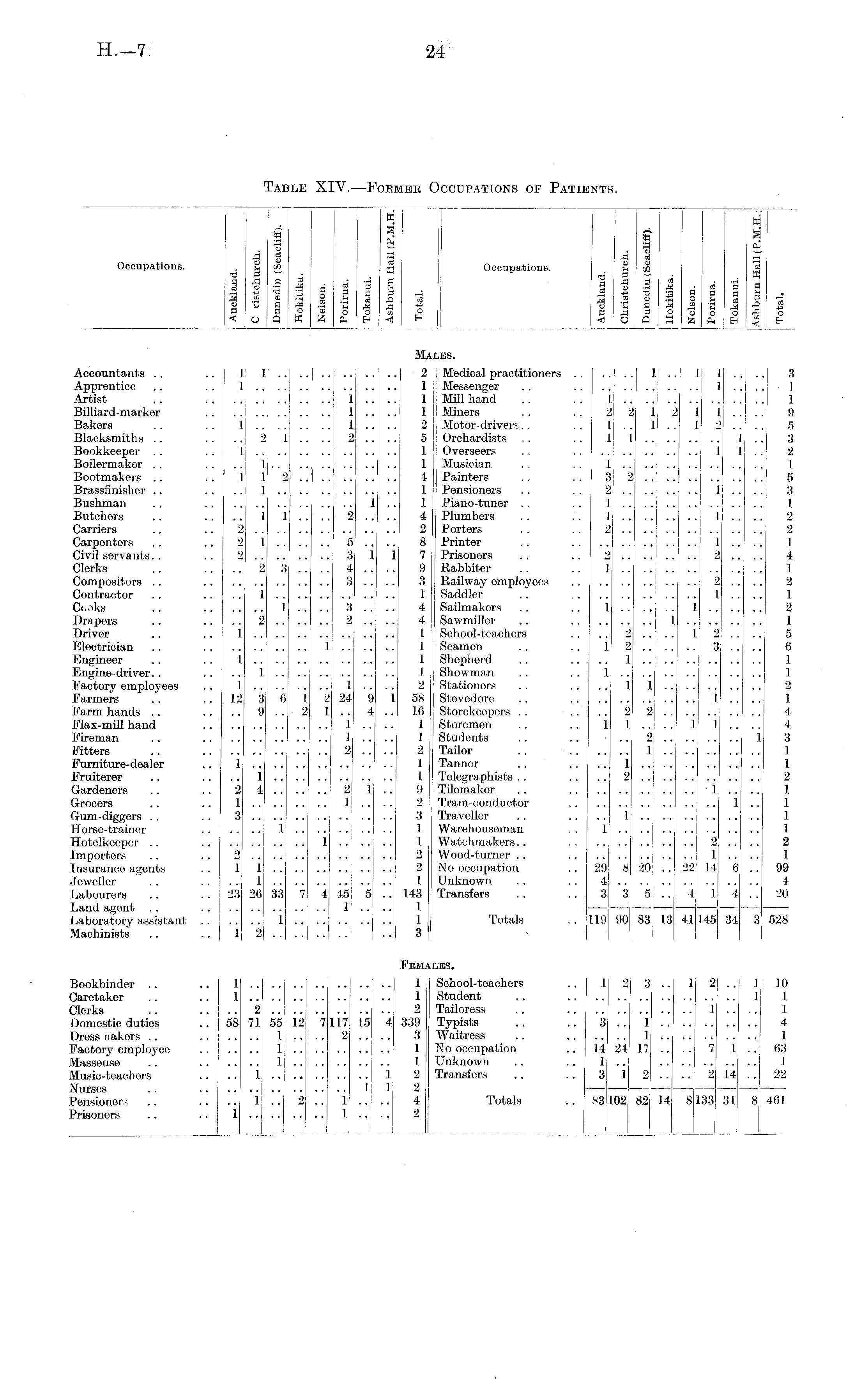3 ~ ~ £ w f. £• S s So: rd gj s d Occupations. . 2 ® m Occupations. 2 m 3 ! ! I I p g -3 s 1 ! a i , « -3 ? 3 ! 1 | 1 I I I I Ills! | I I i ® PS^SOqoO^O ■«fOQWS5Ci<E-i<iB -"SOQMlaPMB^B Males. Accountants .. .. Ill I ■ 2 \ Medical practitioners I .. 1 1 .. .. 3 Apprentice .. .. 1 j 1 Messenger .. 1 .. . . I Artist .. 1 .. .. 1 Mill hand . . . . 1 1 Billiard-marker .. ..j 1 .. .. 1 ! Miners .. .. 22 1, 211.... 9 Bakers .. .. lj .. 1 .. .. 2 Motor-drivers.. .. 1 .. l! .. 1 2 .. .. 5 Blacksmiths .. .. .. ] 2 1 2 .... 5 j Orchardists .. .. 1 1 1.. 3 Bookkeeper .. .. 1 1 Overseers .. 1 1 .. 2 Boilermaker .. .. .. 1 1 Musician .. .. 1 ! .. 1 Bootmakers .. .. 1 1 2 4 j Painters . . .. 3 2 5 Brassfinisher .. .. .. 1 1 Pensioners .. .. 2 1 .. .. 3 Bushman .. 1 .. 1 I Piano-tuner . . . . ] 1 Butchers .. .. .. 1 1.... 2.... 4 Plumbers .. .. I 1 .. .. 2 Carriers .. .. 2 2 Porters .. .. 2 2 Carpenters .. .. 2 1 5 .... 8 Printer .. ; .. .. 1 .. .. ] Civil servants.. .. 2 3 1 1 7 Prisoners .. .. 2 1 2 .... 4 Clerks .. .. .. 2 3.... 4.... 9 Rabbiter .. . . 1 ! 1 Compositors .. 3 .. .. 3 Railway employees i .. .. 2 .. .. 2 Contractor . . .. .. 1 1 Saddler .. 1 . . .. 1 Cooks .. 1.... 3.... 4 Sailmakers .. .. 1 .. .. j .. 1 2 Drapers .. .. .. 2 2 .... 4 Sawmiller .. I 1 1 Driver .. .. 1 1 School-teachers .. .. 2 .... 1 2.. .. 5 Electrician .. I 1 Seamen .. . . 1 2 ...... 3 .. .. 6 Engineer .. . . 1 1 Shepherd .. .. .. 1 1 Engine-driver.. .. .. ] 1 Showman .. .. 1 .. .., 1 Factory employees .. 1 1 .. .. 2 Stationers .. . . .. 1 1 2 Farmers . . .. 12 3 6 1 2 24 9 1 58 Stevedore .. 1 .. .. 1 Farm hands .. .. .. 9 .. 2 1 .. 4 .. 16 Storekeepers . . .. .. 2 2| 4 Flax-mill hand 1 .. .. 1 Storemen .. .. 1 1 .. I .. 1 1.... 4 Fireman .. 1 .. .. 1 Students . . .. .. 2 I 3 Fitters .. 2 .... 2 Tailor .. 1 1 Furniture-dealer .. 1 1 1 Tanner . . .. .. 1 1 Fruiterer .. .. .. 1 1 Telegraphists .. . . .. 2 .. 2 Gardeners .. .. 2 4 2 1.. 9 Tilemaker .. II.... 1 Grocers .. .. 1 1.... 2 Tram-conductor ] .. 1 Gum-diggers .. . . 3 .. .. 1 .. .. 3 Traveller .. .. .. 1 .. 1 Horse-trainer .... ..' 1 1 Warehouseman .. 1 I Hotelkeeper .. .! .. 1 I Watchmakers.. .. 2 .. .. 2 Importers .. .. 2 .. 2 Wood-turner .. .. 1 .. .. 1 Insurance agents .. 1 I .. I ] 2 No occupation .. 29 8 20; .. 22 14 6 .. 99 Jeweller .. .. I .. 1 .. .. j 1 Unknown .. .. 4 4 Labourers .. .. j 23 26 33 7 4 45! 5 .. 143 Transfers .. .. 335.. 414.. 20 Land agent .. 1 . . .. 1 Laboratory assistant .. .. .. 1 .. . .1 ... ..j .. 1 Totals .. 119 90 83 13 41145 34 3 528 Machinists .. ..[12 1 ■ • ■ ! • • 3 Females. Bookbinder .. .. 1 .. 1 School-teachers .. 1 2 3 .. 1 2 .. lj 10 Caretaker .. .. 1 1 .. 1 Student .. 1 1 Clerks .. .. .. 2 ! .. 2 Tailoress .. 1 .. .. 1 Domestic duties .. 58 71 55 12 7 117 1G 4 339 Typists .. .. 3.. 1 4 Dress nakers .. 1.... 2 .... 3 Waitress .. I 1 Factory employee I 1 No occupation .. 14 24 17 .... 7 1 ..! 63 Masseuse .. 1 1 Unknown .. .. 1 .. I Music-teachers .. .. 1 1 2 Transfers .. .. 3 1 2 .... 2 14 .. 22 Nurses .. 1 1 2 Pensioners .. . . .. 1 .. 2 .. 1 .. .. 4 Totals .. 83102 82 14 8133 31 8 461 Prisoners .. .. 1 I.... 2