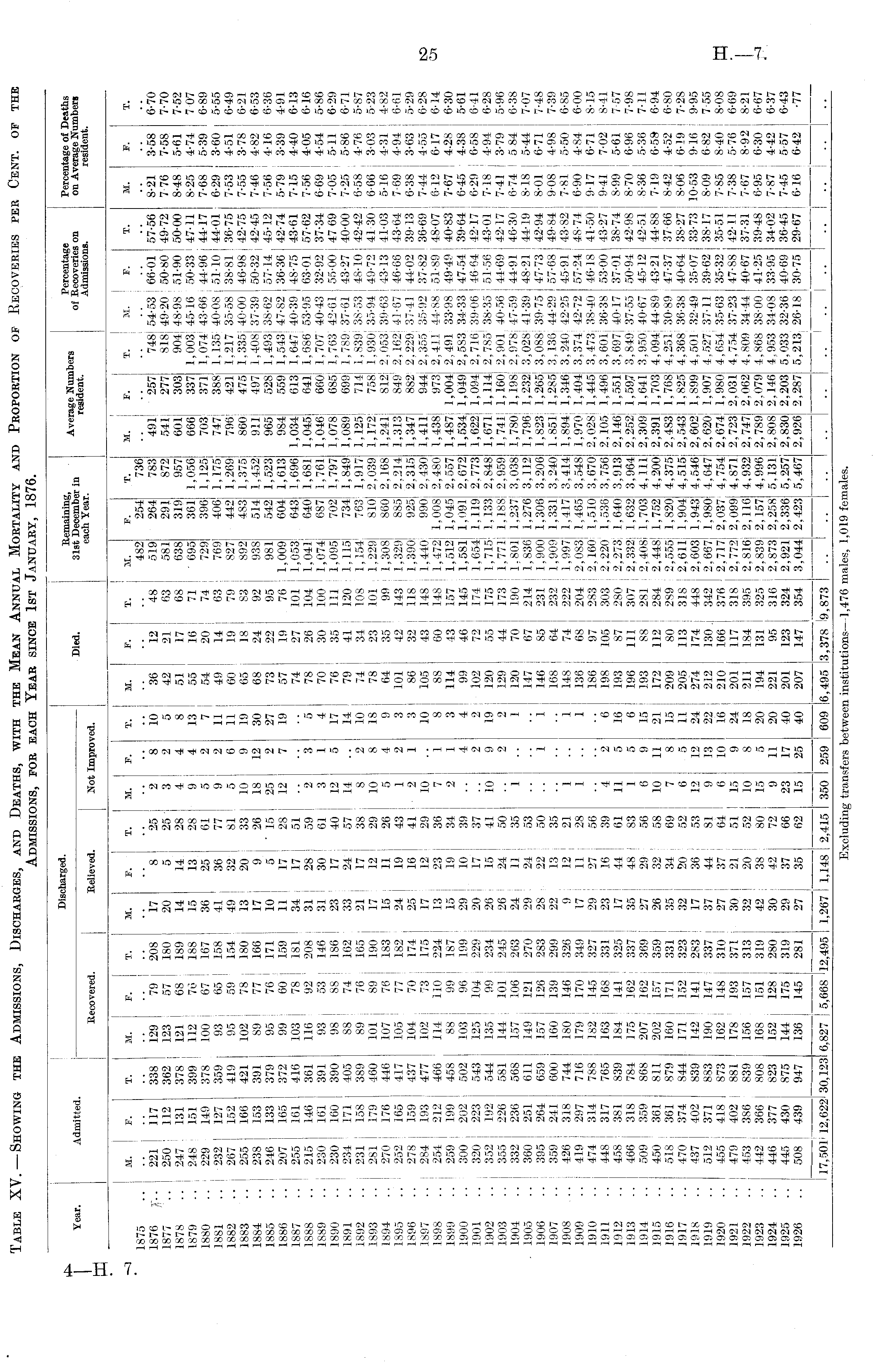 Table XV.—Showing the Admissions, Discharges, and Deaths, with the Mean Annual Mortality and Proportion of Recoveries per Cent. of the Admissions, for each Year since 1st January, 1876.