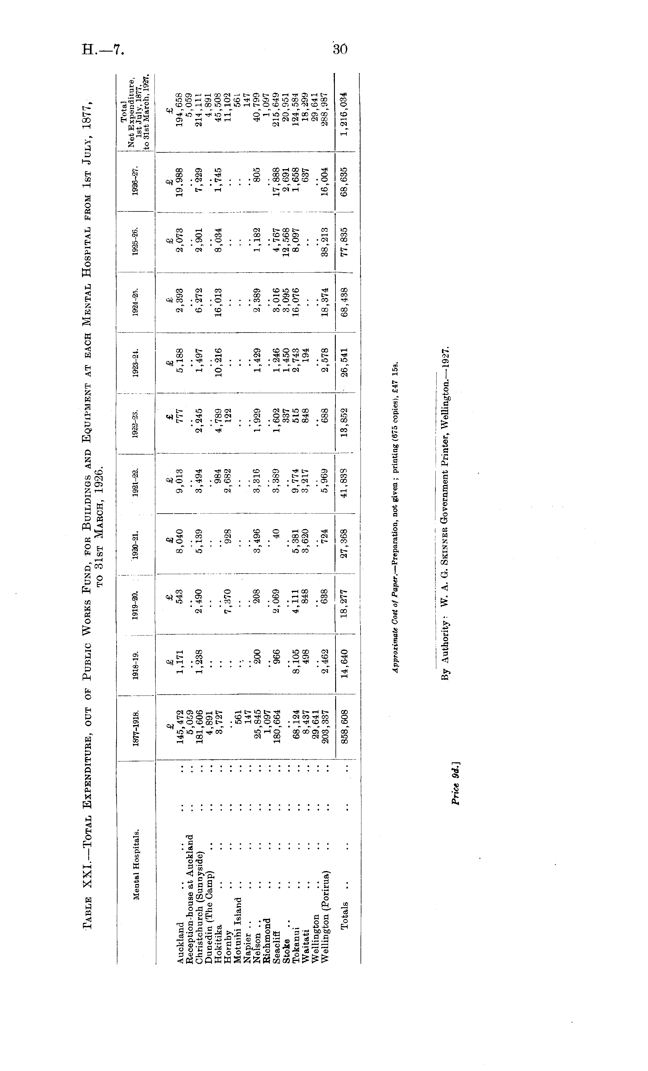 Table XXI.—Total Expenditure, out of Public Works Fund, for Buildings and Equipment at each Mental Hospital from 1st July, 1877, to 31st March, 1926.