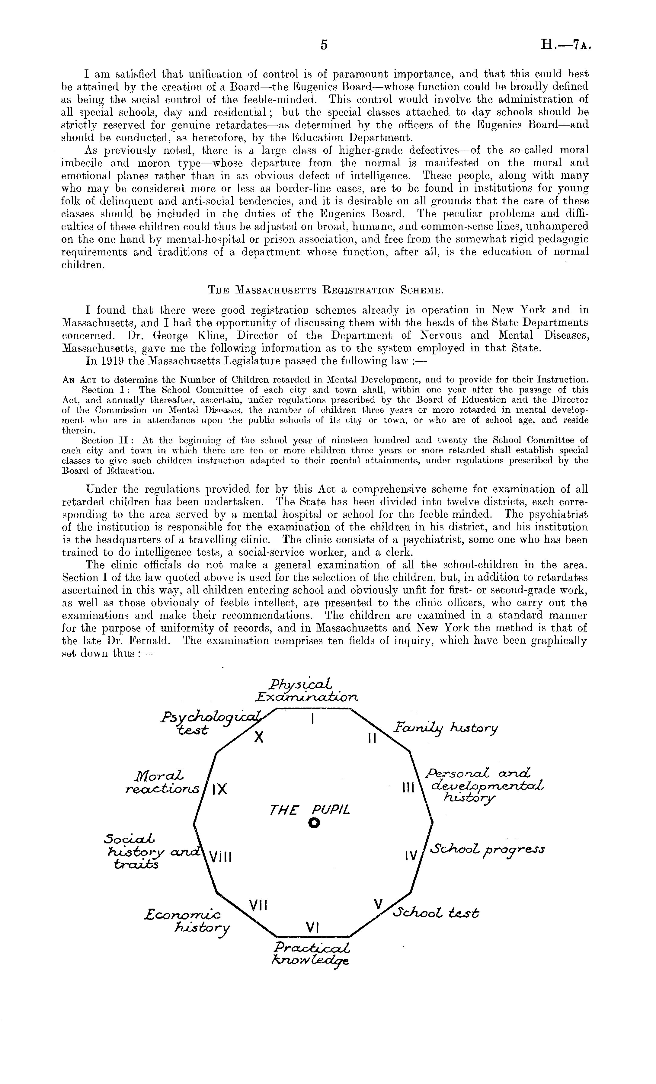 I am satisfied that unification of control is of paramount importance, and that this could best be attained by the creation of a Board —the Eugenics Board —whose function coidd be broadly defined as being the social control of the feeble-minded. This control would involve the administration of all special schools, day and residential; but the special classes attached to day schools should be strictly reserved for genuine retardates —as determined by the officers of the Eugenics Board —and should be conducted, as heretofore, by the Education Department. As previously noted, there is a large class of higher-grade defectives —of the so-called moral imbecile and moron type —whose departure from the normal is manifested on the moral and emotional planes rather than in an obvious defect of intelligence. These people, along with many who may be considered more or less as border-line cases, are to be found in institutions for young folk of delinquent and anti-social tendencies, and it is desirable on all grounds that the care of these classes should be included in the duties of the Eugenics Board. The peculiar problems and difficulties of these children could thus be adjusted on broad, humane, and common-sense lines, itnhampered on the one hand by mental-hospital or prison association, and free from the somewhat rigid pedagogic requirements and traditions of a department whose function, after all, is the education of normal children. The Massachusetts Registration Scheme. I found that there were good registration schemes already in operation in New York and in Massachusetts, and I had the opportunity of discussing them with the heads of the State Departments concerned. Dr. George Kline, Director of the Department of Nervous and Mental Diseases, Massachusetts, gave me the following information as to the system employed in that State. In 1919 the Massachusetts Legislature passed the following law : — An Act to determine the Number of Children retarded in Mental Development, and to provide for their Instruction. Section I : The School Committee of each city and town shall, within one year after the passage of this Act, and annually thereafter, ascertain, under regulations prescribed by the Board of Education and the Director of the Commission on Mental Diseases, the number of children three years or more retarded in mental development who are in attendance upon the public schools of its city or town, or who are of school age, and reside therein. Section II : At the beginning of the school year of nineteen hundred and twenty the School Committee of each city and town in which there are ten or more children three years or more retarded shall establish special classes to give such children instruction adapted to their mental attainments, under regulations prescribed by the Board of Education. Under the regulations provided for by this Act a comprehensive scheme for examination of all retarded children has been undertaken. The State has been divided into twelve districts, each corresponding to the area served by a mental hospital or school for the feeble-minded. The psychiatrist of the institution is responsible for the examination of the children in his district, and his institution is the headquarters of a travelling clinic. The clinic consists of a psychiatrist, some one who has been trained to do intelligence tests, a social-service worker, and a clerk. The clinic officials do not make a general examination of all the school-children in the area. Section I of the law quoted above is used for the selection of the children, but, in addition to retardates ascertained in this way, all children entering school and obviously unfit for first- or second-grade work, as well as those obviously of feeble intellect, are presented to the clinic officers, who carry out the examinations and make their recommendations. The children are examined in a standard manner for the purpose of uniformity of records, and in Massachusetts and New York the method is that of the late Dr. Fernald. The examination comprises ten fields of inquiry, which have been graphically set down thus : —