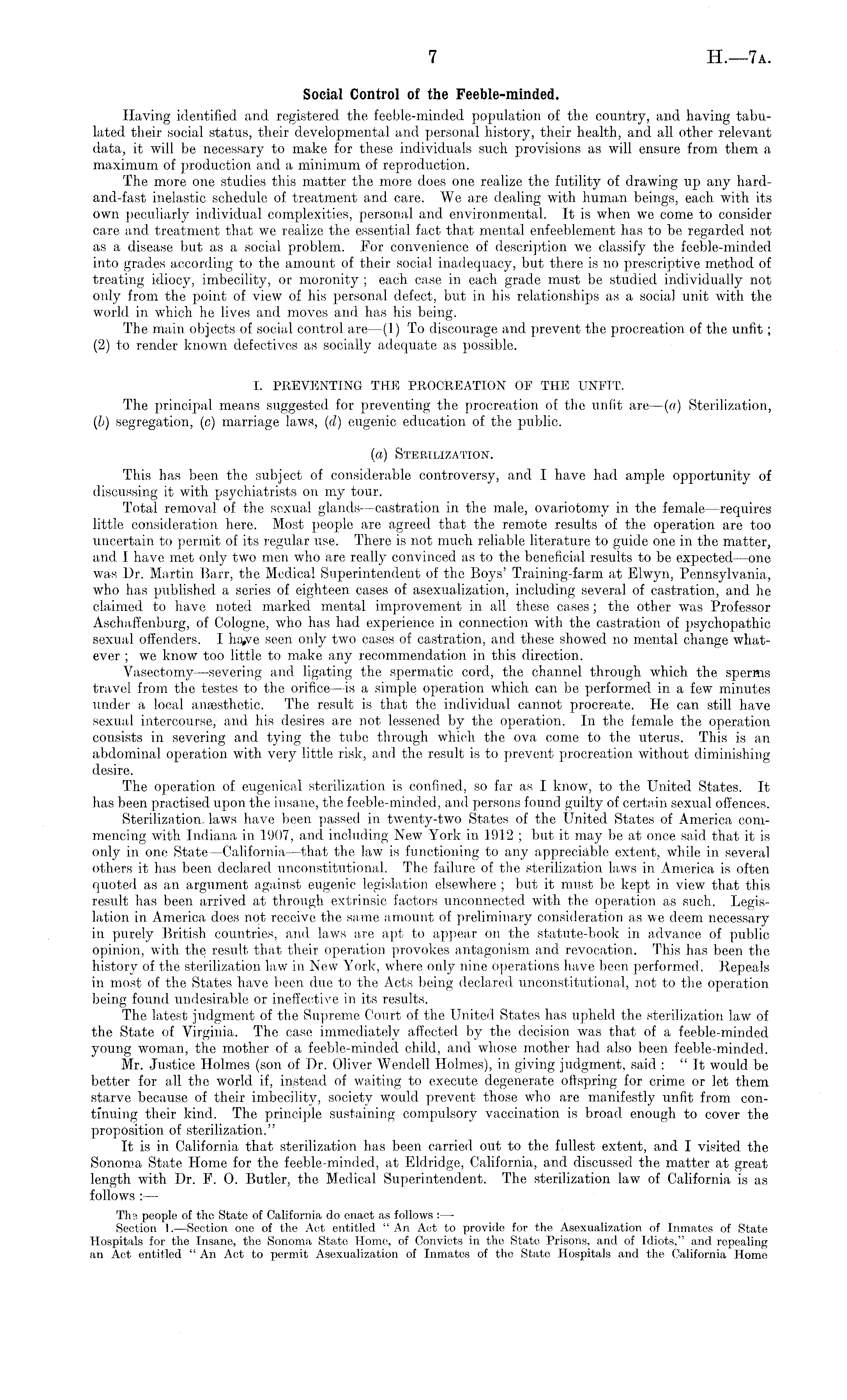 Social Control of the Feeble-minded. Having identified and registered the feeble-minded population of the country, and having tabulated their social status, their developmental and personal history, their health, and all other relevant data, it will be necessary to make for these individuals such provisions as will ensure from them a maximum of production and a minimum of reproduction. The more one studies this matter the more does one realize the futility of drawing up any hard-and-fast inelastic schedule of treatment and care. We are dealing with human beings, each with its own peculiarly individual complexities, personal and environmental. It is when we come to consider care and treatment that we realize the essential fact that mental enfeeblement has to be regarded not as a disease but as a social problem. For convenience of description we classify the feeble-minded into grades according to the amount of their social inadequacy, but there is no prescriptive method of treating idiocy, imbecility, or moronity ; each case in each grade must be studied individually not only from the point of view of his personal defect, but in his relationships as a social unit with the world in which he lives and moves and has his being. The main objects of social control are —(1) To discourage and prevent the procreation of the unfit; (2) to render known defectives as socially adequate as possible. I. PREVENTING THE PROCREATION OF THE UNFIT. The principal means suggested for preventing the procreation of the unfit are —(a) Sterilization, (b) segregation, (c) marriage laws, (d) eugenic education of the public. (a) Sterilization. This has been the subject of considerable controversy, and I have had ample opportunity of discussing it with psychiatrists on my tour. Total removal of the sexual glands —castration in the male, ovariotomy in the female—requires little consideration here. Most people are agreed that the remote results of the operation are too uncertain to permit of its regular use. There is not much reliable literature to guide one in the matter, and I have met only two men who are really convinced as to the beneficial results to be expected —one was Dr. Martin Barr, the Medical Superintendent of the Boys' Training-farm at Elwyn, Pennsylvania, who has published a series of eighteen cases of asexualization, including several of castration, and he claimed to have noted marked mental improvement in all these cases; the other was Professor Aschaffenburg, of Cologne, who has had experience in connection with the castration of psychopathic sexual offenders. I seen only two cases of castration, and these showed no mental change whatever ; we know too little to make any recommendation in this direction. Vasectomy —severing and ligating the spermatic cord, the channel through which the sperms travel from the testes to the orifice —is a simple operation which can be performed in a few minutes under a local anaesthetic. The result is that the individual cannot procreate. He can still have sexual intercourse,' and his desires are not lessened by the operation. In the female the operation consists in severing and tying the tube through which the ova come to the uterus. This is an abdominal operation with very little risk, and the result is to prevent procreation without diminishing desire. The operation of eugenical sterilization is confined, so far as I know, to the United States. It has been practised upon the insane, the feeble-minded, and persons found guilty of certain sexual offences. Sterilization, laws have been passed in twenty-two States of the United States of America commencing with Indiana in 1907, ancl including New York in 1912 ; but it may be at once said that it is only in one State —California—that the law is functioning to any appreciable extent, while in several others it has been declared unconstitutional. The failure of the sterilization laws in America is often quoted as an argument against eugenic legislation elsewhere ; but it must be kept in view that this result has been arrived at through extrinsic factors unconnected with the operation as such. Legislation in America does not receive the same amount of preliminary consideration as we deem necessary in purely British countries, and laws are apt to appear on the statute-book in advance of public opinion, with the result that their operation provokes antagonism and revocation. This has been the history of the sterilization law in New York, where only nine operations have been performed. Repeals in most of the States have been due to the Acts being declared unconstitutional, not to the operation being found undesirable or ineffective in its results. The latest judgment of the Supreme Court of the United States has upheld the sterilization law of the State of Virginia. The case immediately affected by the decision was that of a feeble-minded young woman, the mother of a feeble-minded child, and whose mother had also been feeble-minded. Mr. Justice Holmes (son of Dr. Oliver Wendell Holmes), in giving judgment, said : "It would be better for all the world if, instead of waiting to execute degenerate offspring for crime or let them starve because of their imbecility, society would prevent those who are manifestly unfit from continuing their kind. The principle sustaining compulsory vaccination is broad enough to cover the proposition of sterilization." It is in California that sterilization has been carried out to the fullest extent, and I visited the Sonoma State Home for the feeble-minded, at Eldridge, California, and discussed the matter at great length with Dr. F. 0. Butler, the Medical Superintendent. The sterilization law of California is as follows :—
