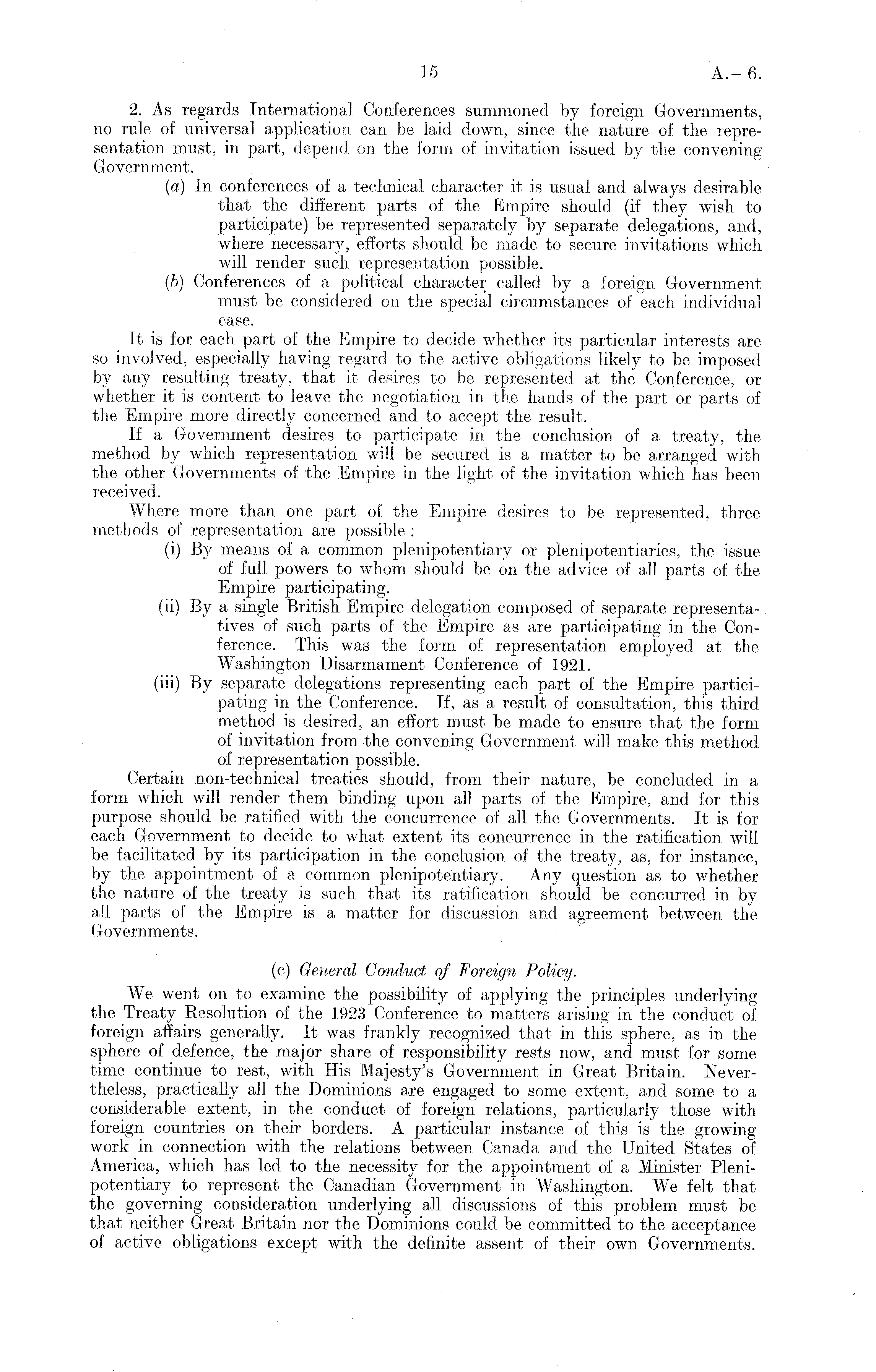 2. As regards Internationa] Conferences summoned by foreign Governments, no rule of universal application can be laid down, since the nature of the representation must, in part, depend on the form of invitation issued by the convening Government. (a) In conferences of a technical character it is usual and always desirable that the different parts of the Empire should (if they wish to participate) be represented separately by separate delegations, and, where necessary, efforts should be made to secure invitations which will render such representation possible. (b) Conferences of a political character called by a foreign Government must be considered on the special circumstances of each individual case. Tt is for each part of the Empire to decide whether its particular interests are so involved, especially having regard to the active obligations likely to be imposed by any resulting treaty, that it desires to be represented at the Conference, or whether it is content to leave the negotiation in the hands of the part or parts of the Empire more directly concerned and to accept the result. If a Government desires to participate in the conclusion of a treaty, the method by which representation will be secured is a matter to be arranged with the other Governments of the Empire in the light of the invitation which has been received. Where more than one part of the Empire desires to be represented, three methods of representation are possible : — (i) By means of a common plenipotentiary or plenipotentiaries, the issue of full powers to whom should be on the advice of all parts of the Empire participating. (ii) By a single British Empire delegation composed of separate representatives of such parts of the Empire as are participating in the Conference. This was the form of representation employed at the Washington Disarmament Conference of 1921. (iii) By separate delegations representing each part of the Empire participating in the Conference. If, as a result of consultation, this third method is desired, an effort must be made to ensure that the form of invitation from the convening Government will make this method of representation possible. Certain non-technical treaties should, from their nature, be concluded in a form which will render them binding upon all parts of the Empire, and for this purpose should be ratified with the concurrence of all the Governments. It is for each Government to decide to what extent its concurrence in the ratification will be facilitated by its participation in the conclusion of the treaty, as, for instance, by the appointment of a common plenipotentiary. Any question as to whether the nature of the treaty is such that its ratification should be concurred in by all parts of the Empire is a matter for discussion and agreement between the Governments. (c) General Conduct of Foreign Policy. We went on to examine the possibility of applying the principles underlying the Treaty Resolution of the 1923 Conference to matters arising in the conduct of foreign affairs generally. It was frankly recognized that in this sphere, as in the sphere of defence, the major share of responsibility rests now, and must for some time continue to rest, with His Majesty's Government in Great Britain. Nevertheless, practically all the Dominions are engaged to some extent, and some to a considerable extent, in the conduct of foreign relations, particularly those with foreign countries on their borders. A particular instance of this is the growing work in connection with the relations between Canada and the United States of America, which has led to the necessity for the appointment of a Minister Plenipotentiary to represent the Canadian Government in. Washington. We felt that the governing consideration underlying all discussions of this problem must be that neither Great Britain nor the Dominions could be committed to the acceptance of active obligations except with the definite assent of their own Governments.
