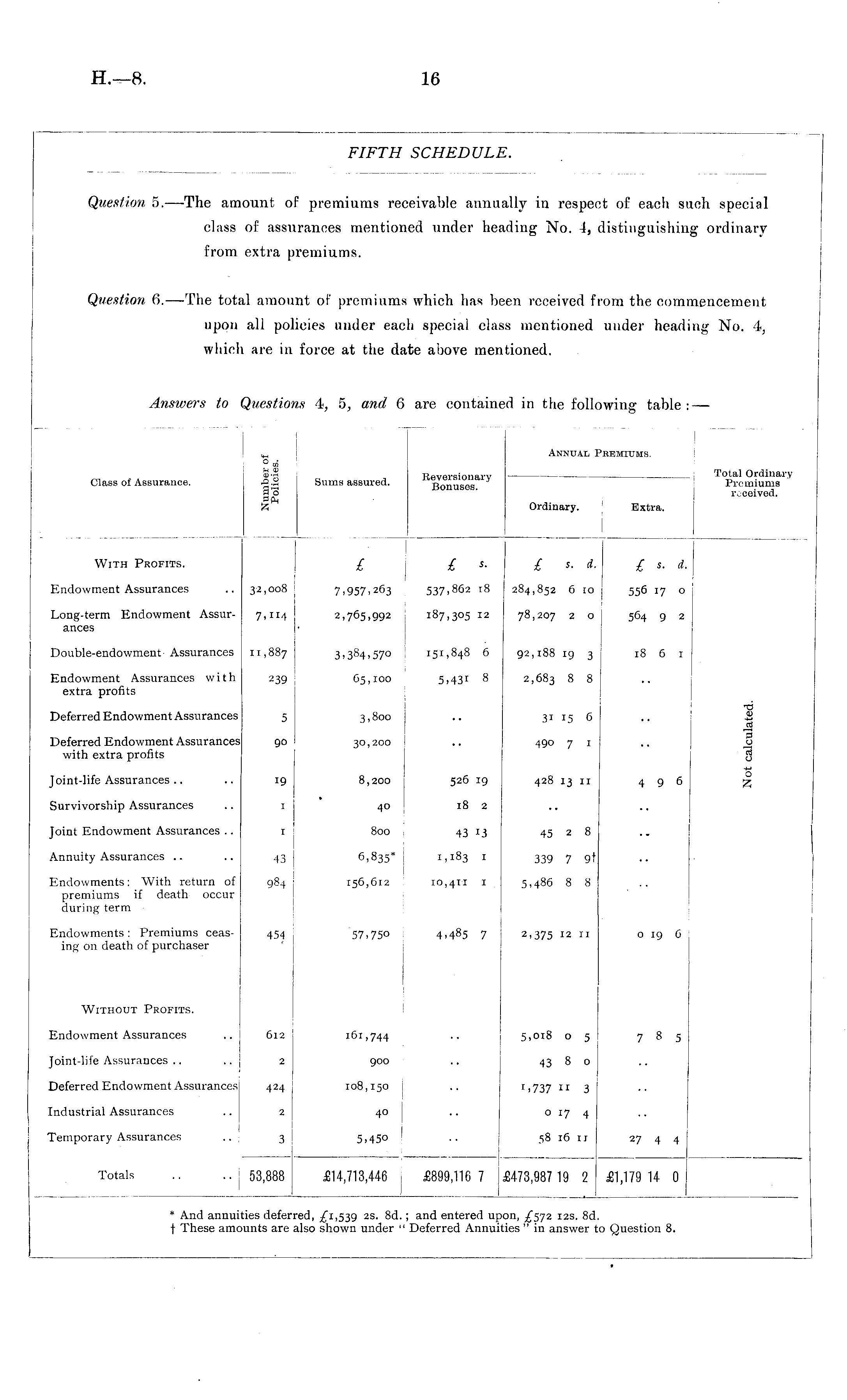 FIFTH SCHEDULE. Question 5. —The amount of premiums receivable annually in respect of each such special class of assurances mentioned under heading No. 4, distinguishing ordinary from extra premiums. Question 6.—The total amount of premiums which has been received from the commencement upon all policies under each special class mentioned under heading No. 4, which are in force at the date above mentioned. Answers to Questions 4, 5, and 6 are contained in the following table : —