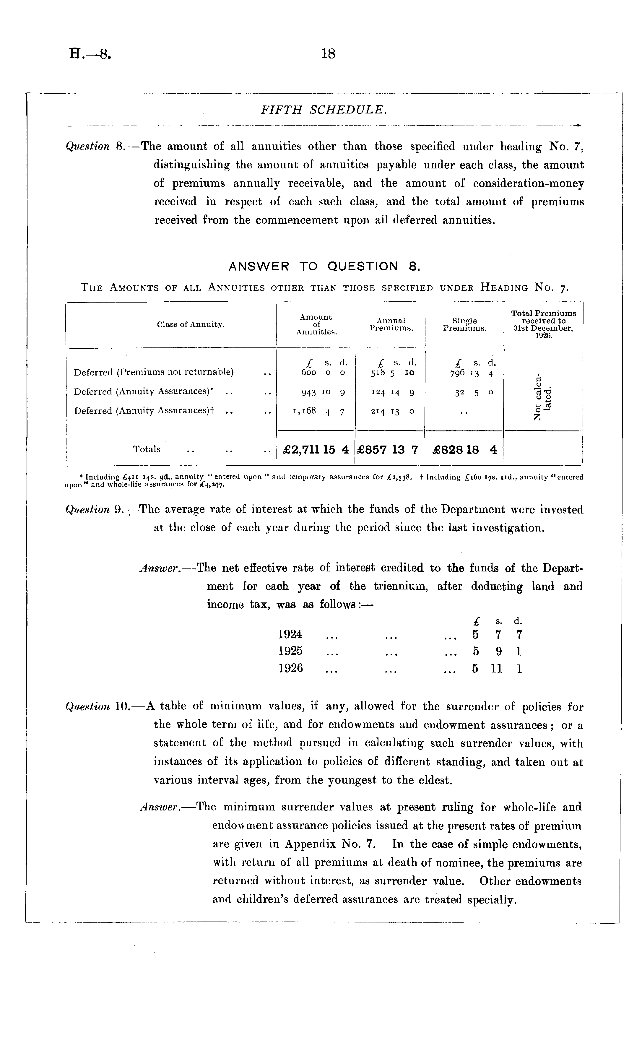 FIFTH SCHEDULE. Question 8. —The amount of all annuities other than those specified under heading No. 7, distinguishing the amount of annuities payable under each class, the amount of premiums annually receivable, and the amount of consideration-money received in respect of each such class, and the total amount of premiums received from the commencement upon all deferred annuities.