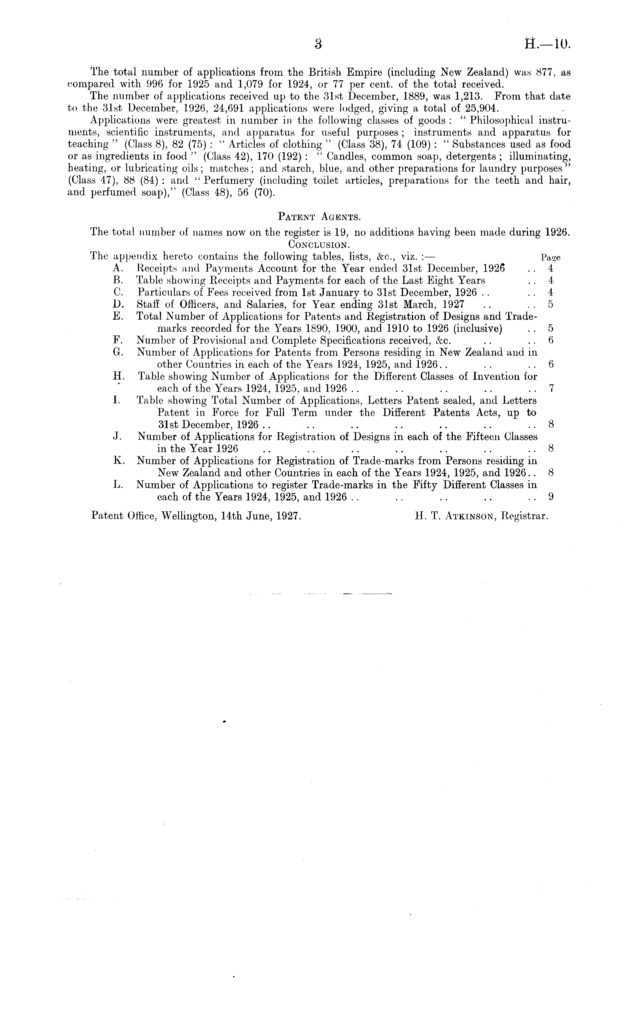 The total number of applications from the British Empire (including New Zealand) was 877, as compared with 996 for 1925 and 1,079 for 1924, or 77 per cent, of the total received. The number of applications received up to the 31st December, 1889, was 1,213. From that date to the 31st December, 1926, 24,691 applications were lodged, giving a total of 25,904. Applications were greatest in number in the following classes of goods : " Philosophical instruments, scientific instruments, and apparatus for useful purposes ; instruments and apparatus for teaching " (Class 8), 82 (75) : " Articles of clothing " (Class 38), 74 (109) : " Substances used as food or as ingredients in food " (Class 42), 170 (192) : " Candles, common soap, detergents ; illuminating, beating, or lubricating oils; matches; and starch, blue, and other preparations for laundry purposes" (Class 47), 88 (84) : and " Perfumery (including toilet articles, preparations for the teeth and hair, and perfumed soap)," (Class 48), 56 (70). Patent Agents. The total number of names now on the register is 19, no additions having been made during 1926. Conclusion. The appendix hereto contains the following tables, lists, &c., viz. : — Page A. Receipts and Payments Account for the Year ended 31st December, 1926 . . 4 B. Table showing Receipts and Payments for each of the Last Eight Years . . 4C. Particulars of Fees received from Ist January to 31st December, 1926 . . . . 4 D. StafE of Officers, and Salaries, for Year ending 31st March, 1927 .. .. 5 E. Total Number of Applications for Patents and Registration of Designs and Trademarks recorded for the Years 1890, 1900, and 1910 to 1926 (inclusive) . . 5 F. Number of Provisional and Complete Specifications received, &c. .. 6 G. Number of Applications for Patents from Persons residing in New Zealand and in other Countries in each of the Years 1924, 1925, and 1926.. .. 6 H. Table showing Number of Applications for the Different Classes of Invention for each of the Years 1924, 1925, and 1926 .. .. .. .. 7 I. Table showing Total Number of Applications, Letters Patent sealed, and Letters Patent in Force for Full Term under the Different Patents Acts, up to 31st December, 1926 .. .. .. .. .. .. ..8 J. Number of Applications for Registration of Designs in each of the Fifteen Classes in the Year 1926 .. .. .. .. .. .. .. 8 K. Number of Applications for Registration of Trade-marks from Persons residing in New Zealand and other Countries in each of the Years 1924, 1925, and 1926.. 8 L. Number of Applications to register Trade-marks in the Fifty Different Classes in each of the Years 1924, 1925, and 1926 . . . . . . .. 9 Patent Office, Wellington, 14th June, 1927. H. T. Atkinson, Registrar.