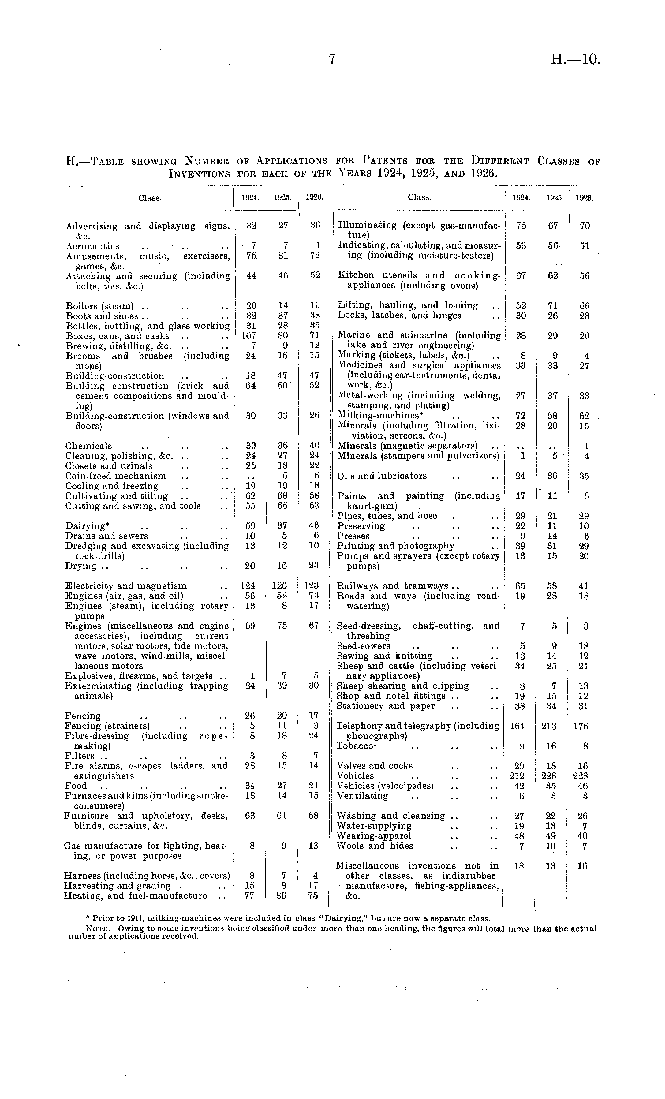 H. —Table showing Number of Applications for Patents for the Different Classes of Inventions for each of the Years 1924, 1925, and 1926.