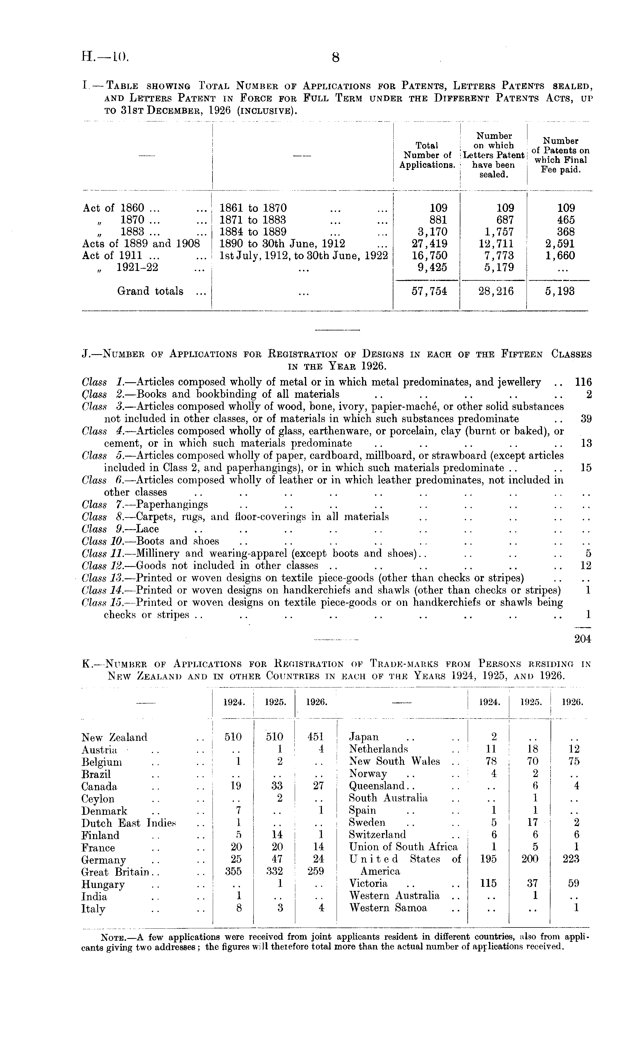 J. —Number of Applications for Registration of Designs in each of the Fifteen Classes in the Year 1926. Class I.—Articles composed wholly of metal or in which metal predominates, and jewellery .. 116 Qlass 2.—Books and bookbinding of all materials .. .. .. .. .. 2 Class 3.—Articles composed wholly of wood, bone, ivory, papier-mache, or other solid substances not included in other classes, or of materials in which such substances predominate .. 39 Class 4.—Articles composed wholly of glass, earthenware, or porcelain, clay (burnt or baked), or cement, or in which such materials predominate .. .. .. .. .. 13 Class s.—Articles composed wholly of paper, cardboard, millboard, or strawboard (except articles included in Class 2, and paperhangings), or in which such materials predominate .. .. 15 Class 6. —Articles composed wholly of leather or in which leather predominates, not included in other classes Class 7.—Paperhangings Class 8. —Carpets, rugs, and iloor-coverings in all materials Class 9.—Lace .. .. .. Class 10. —Boots and shoes Class 11. —Millinery and wearing-apparel (except boots and shoes).. .. .. .. 5 Class 12. —Goods not included in other classes .. .. .. .. .. 12 Class 13. —Printed or woven designs on textile piece-goods (other than checks or stripes) Class 14.—Printed or woven designs on handkerchiefs and shawls (other than checks or stripes) 1 Class 15.—Printed or woven designs on textile piece-goods or on handkerchiefs or shawls being checks or stripes .. .. .. .. .. .. .. .. .. 1 204