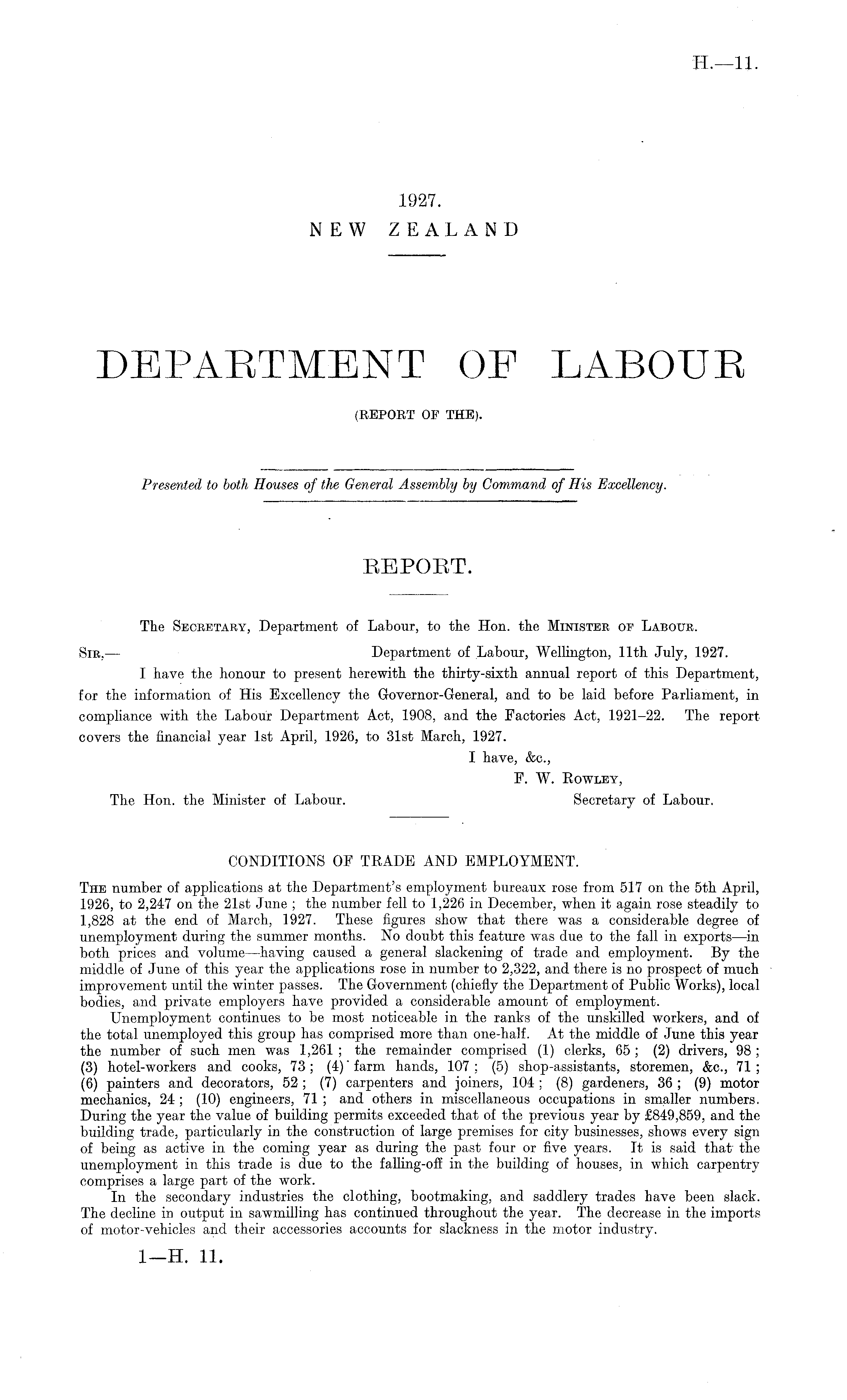 REPORT. The Secretary, Department of Labour, to the Hon. the Minister of Labour. Sir, — Department of Labour, Wellington, 11th July, 1927. I have the honour to present herewith the thirty-sixth annual report of this Department, for the information of His Excellency the Governor-General, and to be laid before Parliament, in compliance with the Labour Department Act, 1908, and the Factories Act, 1921-22. The report covers the financial year Ist April, 1926, to 31st March, 1927. I have, &c., F. W. Rowley, The Hon. the Minister of Labour. Secretary of Labour.