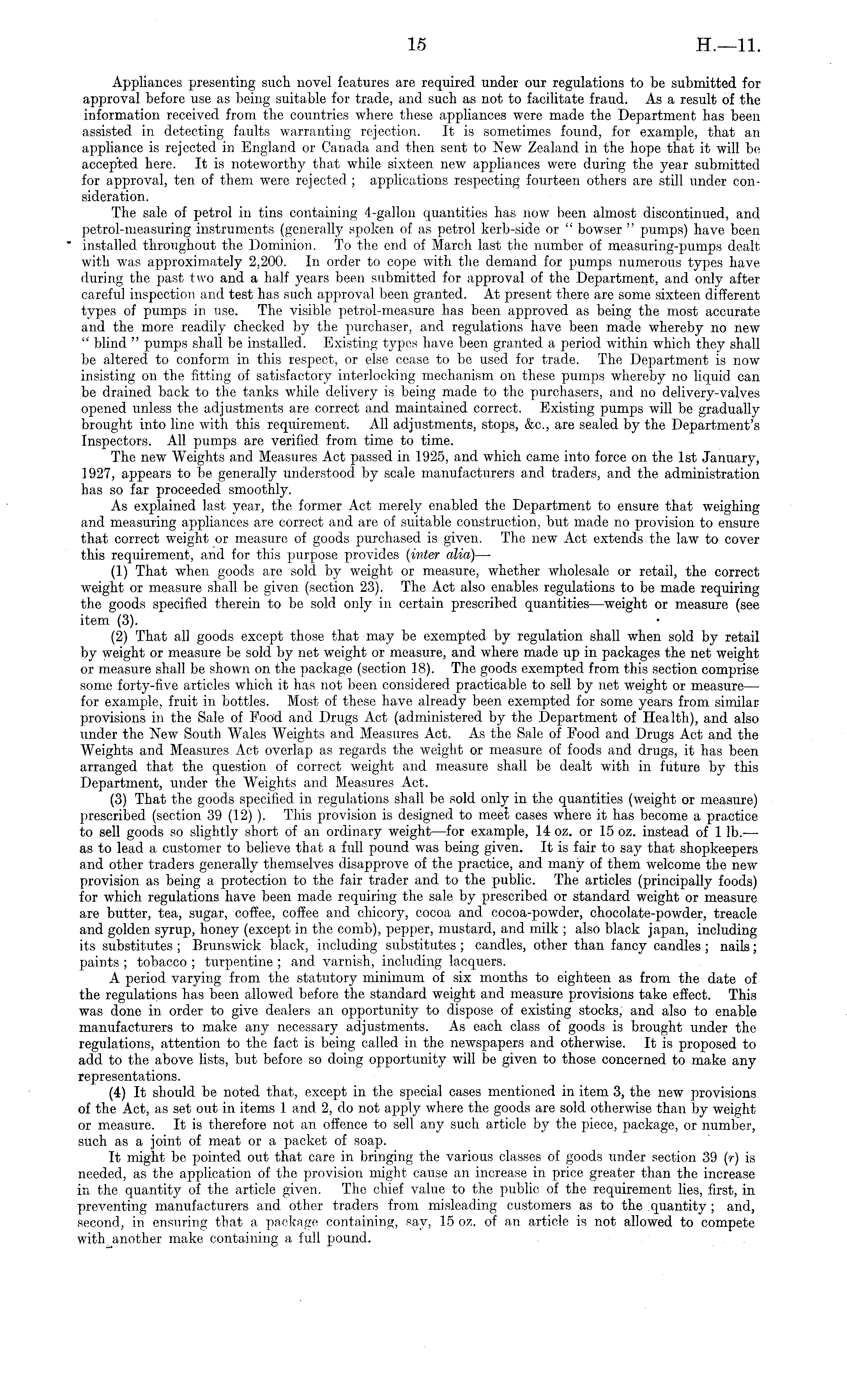 Appliances presenting suet novel features are required under our regulations to be submitted for approval before use as being suitable for trade, and such as not to facilitate fraud. As a result of the information received from the countries where these appliances were made the Department has been assisted in detecting faults warranting rejection. It is sometimes found, for example, that an appliance is rejected in England or Canada and then sent to New Zealand in the hope that it will be accep'ted here. It is noteworthy that while sixteen new appliances were during the year submitted for approval, ten of them were rejected ; applications respecting fourteen others are still under consideration. The sale of petrol in tins containing 4-gallon quantities has now been almost discontinued, and petrol-measuring instruments (generally spoken of as petrol kerb-side or " bowser " pumps) have been installed throughout the Dominion. To the end of March last the number of measuring-pumps dealt with was approximately 2,200. In order to cope with the demand for pumps numerous types have during the past two and a half years been submitted for approval of the Department, and only after careful inspection and test has such approval been granted. At present there are some sixteen different types of pumps in use. The visible petrol-measure has been approved as being the most accurate and the more readily checked by the purchaser, and regulations have been made whereby no new " blind " pumps shall be installed. Existing types have been granted a period within which they shall be altered to conform in this respect, or else cease to be used for trade. The Department is now insisting on the fitting of satisfactory interlocking mechanism on these pumps whereby no liquid can be drained back to the tanks while delivery is being made to the purchasers, and no delivery-valves opened unless the adjustments are correct and maintained correct. Existing pumps will be gradually brought into line with this requirement. All adjustments, stops, &c., are sealed by the Department's Inspectors. All pumps are verified from time to time. The new Weights and Measures Act passed in 1925, and which came into force on the Ist January, 1927, appears to be generally understood by scale manufacturers and traders, and the administration has so far proceeded smoothly. As explained last year, the former Act merely enabled the Department to ensure that weighing and measuring appliances are correct and are of suitable construction, but made no provision to ensure that correct weight or measure of goods purchased is given. The new Act extends the law to cover this requirement, and for this purpose provides (inter alia) — (1) That when goods are sold by weight or measure, whether wholesale or retail, the correct weight or measure shall be given (section 23). The Act also enables regulations to be made requiring the goods specified therein to be sold only in certain prescribed quantities —weight or measure (see item (3). * (2) That all goods except those that may be exempted by regulation shall when sold by retail by weight or measure be sold by net weight or measure, and where made up in packages the net weight or measure shall be shown on the package (section 18). The goods exempted from this section comprise some forty-five articles which it has not been considered practicable to sell by net weight or measure — for example, fruit in bottles. Most of these have already been exempted for some years from similar provisions in the Sale of Pood and Drugs Act (administered by the Department of Health), and also under the New South Wales Weights and Measures Act. As the Sale of Food and Drugs Act and the Weights and Measures Act overlap as regards the weight or measure of foods and drugs, it has been arranged that the question of correct weight and measure shall be dealt with in future by this Department, under the Weights and Measures Act. (3) That the goods specified in regulations shall be sold only in the quantities (weight or measure) prescribed (section 39 (12) ). This provision is designed to meet cases where it has become a practice to sell goods so slightly short of an ordinary weight—for example, 14 oz. or 15 oz. instead of 1 lb.—■ as to lead a customer to believe that a full pound was being given. It is fair to say that shopkeepers and other traders generally themselves disapprove of the practice, and many of them welcome the new provision as being a protection to the fair trader and to the public. The articles (principally foods) for which regulations have been made requiring the sale by prescribed or standard weight or measure are butter, tea, sugar, coffee, coffee and chicory, cocoa and cocoa-powder, chocolate-powder, treacle and golden syrup, honey (except in the comb), pepper, mustard, and milk ; also black japan, including its substitutes ; Brunswick black, including substitutes ; candles, other than fancy candles ; nails; paints ; tobacco ; turpentine ; and varnish, including lacquers. A period varying from the statutory minimum of six months to eighteen as from the date of the regulations has been allowed before the standard weight and measure provisions take effect. This was done in order to give dealers an opportunity to dispose of existing stocks, and also to enable manufacturers to make any necessary adjustments. As each class of goods is brought under the regulations, attention to the fact is being called in the newspapers and otherwise. It is proposed to add to the above lists, but before so doing opportunity will be given to those concerned to make any representations. (4) It should be noted that, except in the special cases mentioned in item 3, the new provisions of the Act, as set out in items 1 and 2, do not apply where the goods are sold otherwise than by weight or measure. It is therefore not an offence to sell any such article by the piece, package, or number, such as a joint of meat or a packet of soa