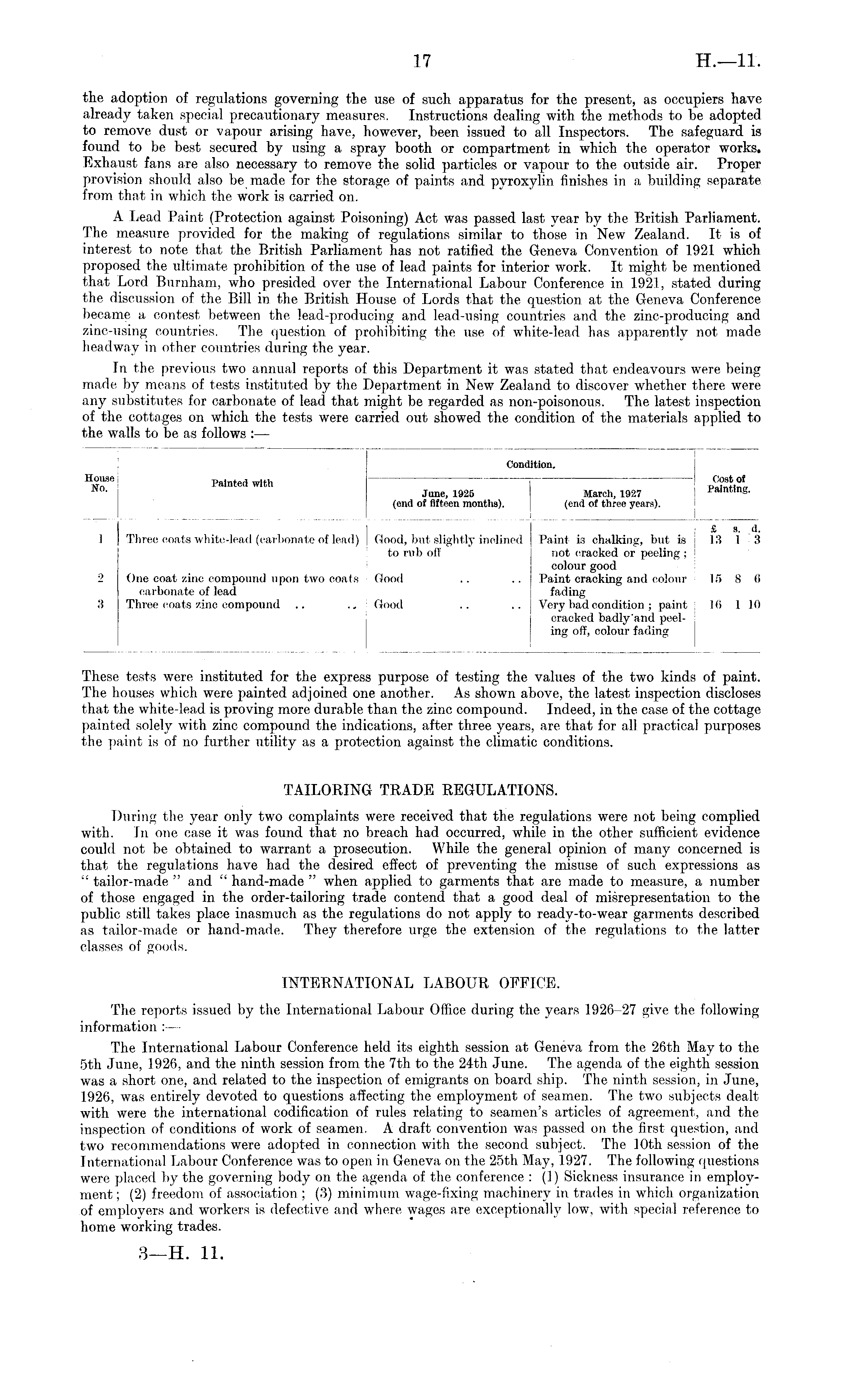 These tests were instituted for the express purpose of testing the values of the two kinds of paint. The houses which were painted adjoined one another. As shown above, the latest inspection discloses that the white-lead is proving more durable than the zinc compound. Indeed, in the case of the cottage painted solely with zinc compound the indications, after three years, are that for all practical purposes the paint is of no further utility as a protection against the climatic conditions. TAILORING TRADE REGULATIONS. During the year only two complaints were received that the regulations were not being complied with. In one case it was found that no breach had occurred, while in the other sufficient evidence could not be obtained to warrant a prosecution. While the general opinion of many concerned is that the regulations have had the desired effect of preventing the misuse of such expressions as " tailor-made " and " hand-made " when applied to garments that are made to measure, a number of those engaged in the order-tailoring trade contend that a good deal of misrepresentation to the public still takes place inasmuch as the regulations do not apply to ready-to-wear garments described as tailor-made or hand-made. They therefore urge the extension of the regulations to the latter classes of goods. INTERNATIONAL LABOUR OFFICE. The reports issued by the International Labour Office during the years 1926-27 give the following information : — The International Labour Conference held its eighth session at Geneva from the 26th May to the sth June, 1926, and the ninth session from the 7th to the 24th June. The agenda of the eighth session was a short one, and related to the inspection of emigrants on board ship. The ninth session, in June, 1926, was entirely devoted to questions affecting the employment of seamen. The two subjects dealt with were the international codification of rules relating to seamen's articles of agreement, and the inspection of conditions of work of seamen. A draft convention was passed on the first question, and two recommendations were adopted in connection with the second subject. The 10th session of the International Labour Conference was to open in Geneva on the 25th May, 1927. The following questions were placed by the governing body on the agenda of the conference : (1) Sickness insurance in employment ; (2) freedom of association ; (3) minimum wage-fixing machinery in trades in which organization of employers and workers is defective and where wages are exceptionally low, with special reference to home working trades.