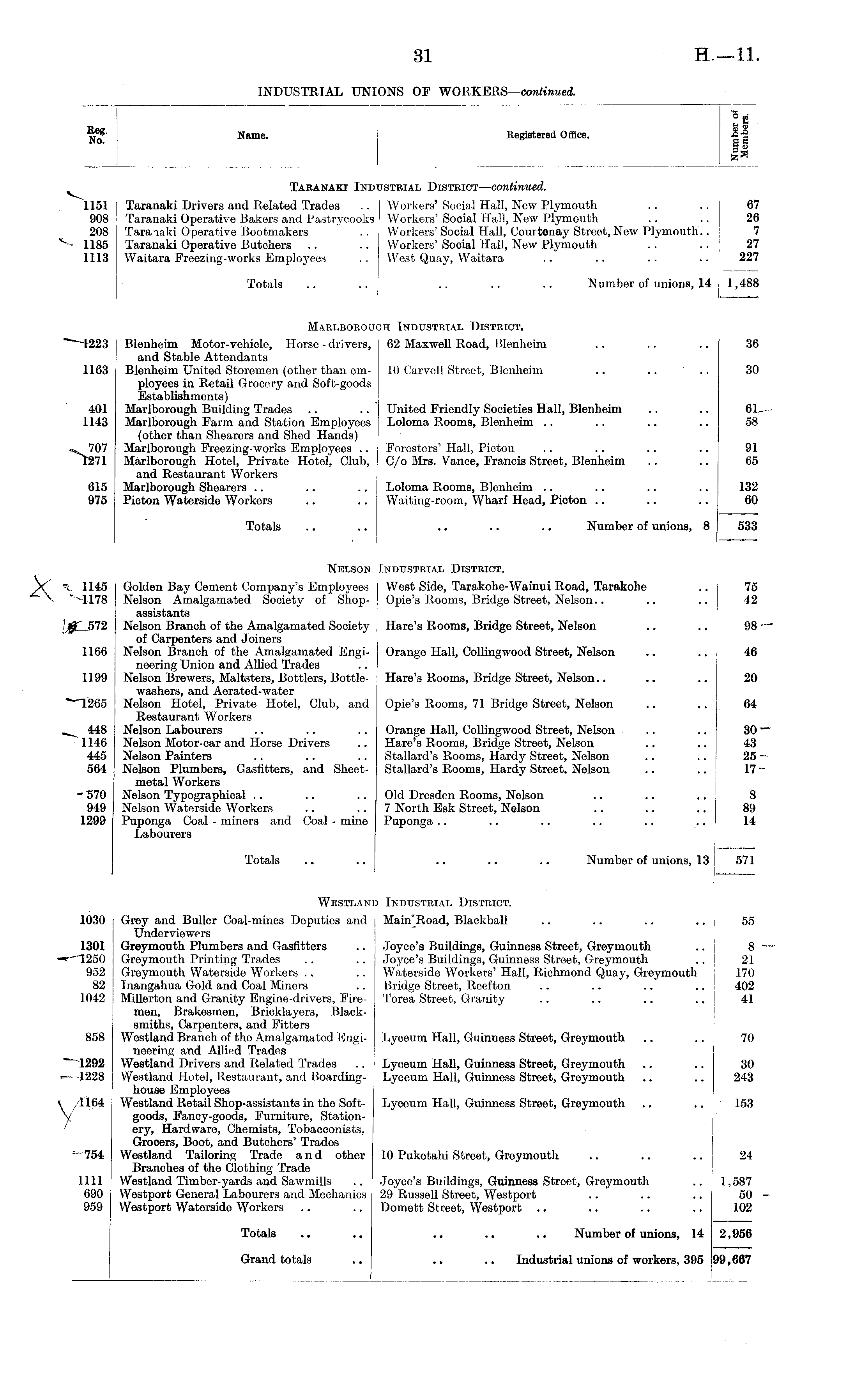 °E Name. Registered Office. □ !i ; Taranaki Industrial District —continued. 1151 Taranaki Drivers and Related Trades .. Workers' Social Hall, New Plymouth .. .. 67 908 Taranaki Operative Bakers and Pastrycooks Workers' Social Hall, New Plymouth .. .. 26 208 Taraiaki Operative Bootmakers .. Workers'Social Hall, Courtenay Street, New Plymouth.. 7 —1185 Taranaki Operative Butchers .. .. Workers' Social Hall, New Plymouth .. .. 27 1113 Waitara Freezing-works Employees .. West Quay, Waitara .. .. .. .. 227 Totals .. .. .. .. .. Number of unions, 14 1,488 Marlborough Industrial District. 1223 Blenheim Motor-vehicle, Horse-drivers, 62 Maxwell Road, Blenheim .. .. .. 36 and Stable Attendants 1163 Blenheim United Storemen (other than em- 10 Carvell Street, Blenheim .. .. .. 30 ployees in Retail Grocery and Soft-goods Establishments) 401 Marlborough Building Trades .. .. United Eriendly Societies Hall, Blenheim .. .. 61. 1143 Marlborough Farm and Station Employees Loloma Rooms, Blenheim .. .. .. .. 58 (other than Shearers and Shed Hands) 707 Marlborough Freezing-works Employees .. Foresters' Hall, Picton .. . . .. .. 91 1271 Marlborough Hotel, Private Hotel, Club, C/o Mrs. Vance, Francis Street, Blenheim .. .. 65 and Restaurant Workers 615 Marlborough Shearers .. .. .. Loloma Rooms, Blenheim .. . . .. .. 132 975 Pioton Waterside Workers .. .. Waiting-room, Wharf Head, Pieton .. .. .. 60 Totals .. .. .. .. .. Number of unions, 8 533 Nelson Industrial District. 1145 Golden Bay Cement Company's Employees West Side, Tarakohe-Wainui Road, Tarakohe .. 75 \ *' "1178 Nelson Amalgamated Society of Shop- Opie's Rooms, Bridge Street, Nelson.. .. .. 42 assistants Ijjfc1572 Nelson Branch of the Amalgamated Society Hare's Rooms, Bridge Street, Nelson .. .. 98 of Carpenters and Joiners 1166 Nelson Branch of the Amalgamated Engi- Orange Hall, Collingwood Street, Nelson .. .. 46 neering Union and Allied Trades 1199 Nelson Brewers, Maltsters, Bottlers, Bottle- Hare's Rooms, Bridge Street, Nelson.. .. .. 20 washers, and Aerated-water T265 Nelson Hotel, Private Hotel, Club, and Opie's Rooms, 71 Bridge Street, Nelson .. .. 64 Restaurant Workers 448 Nelson Labourers .. .. .. Orange Hall, Collingwood Street, Nelson .. .. 30 1146 Nelson Motor-car and Horse Drivers .. Hare's Rooms, Bridge Street, Nelson .. .. 43 445 Nelson Painters .. .. .. Stallard's Rooms, Hardy Street, Nelson .. .. 25 564 Nelson Plumbers, Gasfitters, and Sheet- Stallard's Rooms, Hardy Street, Nelson .. .. 17 metal Workers ™ B70 Nelson Typographical .. .. .. Old Dresden Rooms, Nelson .. .. .. 8 949 Nelson Waterside Workers .. 7 North Esk Street, Nelson .. .. .. 89 1299 Puponga Coal - miners and Coal - mine Puponga .. .. .. .. .. .. 14 Labourers Totals .. .. .. .. .. Number of unions, 13 571 1 Westland Industrial District. 1030 | Grey and Buller Coal-mines Deputies and j Main'Road, Blackball .. .. .. .. I 55 Underviewers 1301 Greymouth Plumbers and Gasfitters .. Joyce's Buildings, Guinness Street, Greymouth .. 8 -*■ —E250 Greymouth Printing Trades .. .. Joyce's Buildings, Guinness Street, Greymouth .. 21 952 Greymouth Waterside Workers .. .. Waterside Workers' Hall, Richmond Quay, Greymouth 170 82 Inangahua Gold and Coal Miners .. Bridge Street, Reefton .. .. .. .. 402 1042 Millerton and Granity Engine-drivers, Fire- Torea Street, Granity .. .. .. .. 41 men, Brakesmen, Bricklayers, Blacksmiths, Carpenters, and Fitters 858 Westland Branch of the Amalgamated Engi- Lyceum Hall, Guinness Street, Greymouth .. .. 70 neering and Allied Trades " 1292 Westland Drivers and Related Trades .. Lyceum Hall, Guinness Street, Greymouth .. .. 30 ■—1228 Westland Hotel, Restaurant, and Boarding- Lyceum Hall, Guinness Street, Greymouth .. .. 243 house Employees yl64 Westland Retail Shop-assistants in the Soft- Lyceum Hall, Guinness Street, Greymouth .. .. 153 goods, Faney-goods, Furniture, Stationery, Hardware, Chemists, Tobacconists, Grocers, Boot, and Butchers' Trades "" 754 Westland Tailoring Trade and other 10 Puketahi Street, Greymouth .. .. .. 24 Branches of the Clothing Trade 1111 Westland Timber-yards and Sawmills .. Joyce's Buildings, Guinness Street, Greymouth .. 1,587 690 Westport General Labourers and Mechanics 29 Russell Street, Westport .. .. .. 50 959 Westport Waterside Workers .. .. Domett Street, Westport .. .. .. .. 102 Totals .. .. .. .. .. Number of unions, 14 2,956 Grand totals .. .. .. Industrial unions of workers, 395 99,667
