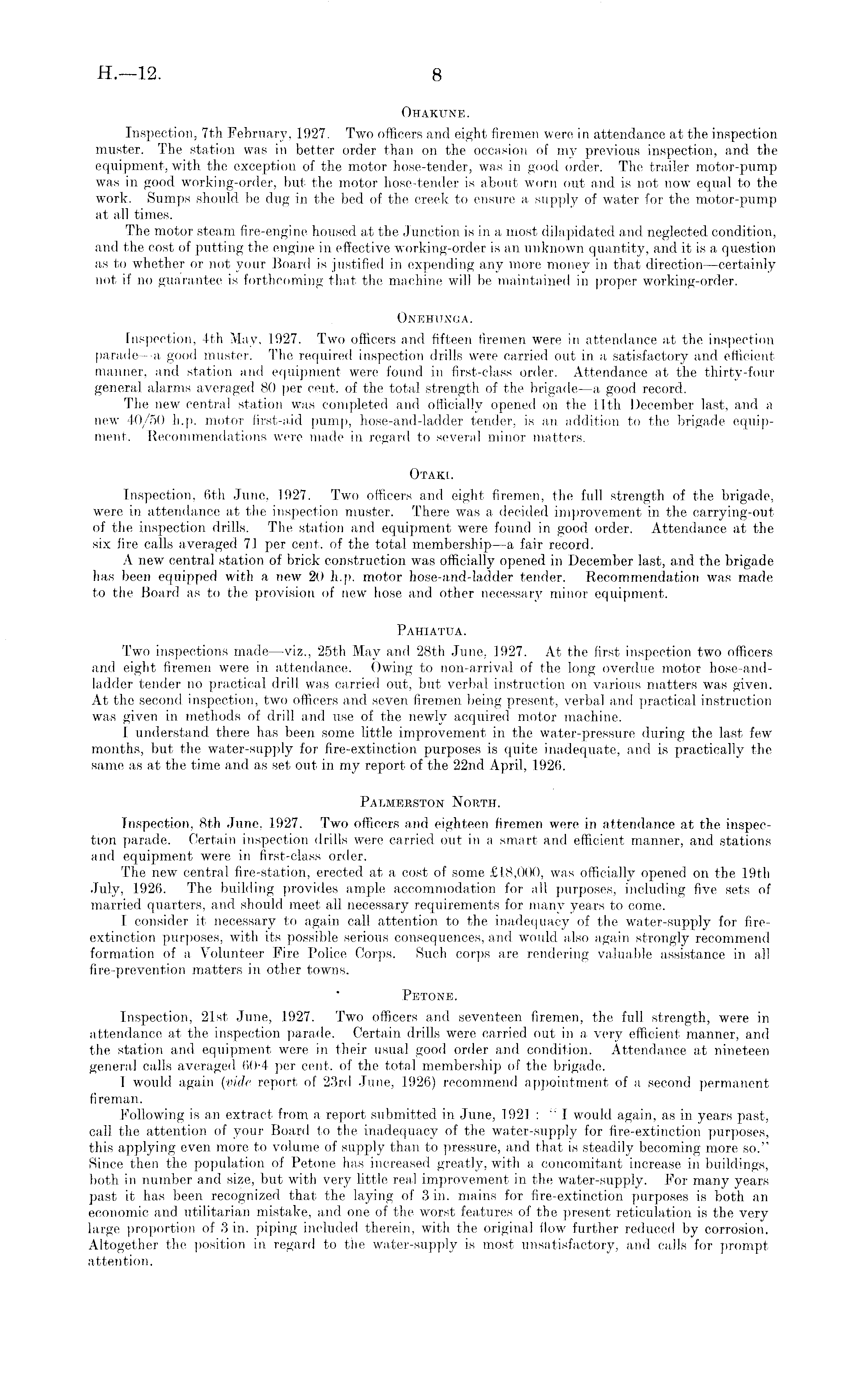 Ohakune. Inspection. 7th February, 1927. Two officers and eight firemen were in attendance at the inspection muster. The station was in better order than on the occasion of my previous inspection, and the equipment, with the exception of the motor hose-tender, was in good order. The trailer motor-pump was in good working-order, but the motor hose-tender is about worn out and is not now equal to the work. Sumps should be dug in the bed of the creek to ensure a supply of water for the motor-pump at all times. The motor steam fire-engine housed at the Junction is in a most dilapidated and neglected condition, and the cost of putting the engine in effective working-order is an unknown quantity, and it is a question as to whether or not your Board is justified in expending any more money in that direction —certainly not if no guarantee is forthcoming that the machine will be maintained in proper working-order. Onehunga. Inspection, 4th May, 1927. Two officers and fifteen firemen were in attendance at the inspection parade —a good muster. The required inspection drills were carried out in a satisfactory and efficient manner, and station and equipment were found in first-class order. Attendance at the thirty-four general alarms averaged 80 per cent, of the total strength of the brigade —a good record. The new central station was completed and officially opened on the 11th December last, and a new 40/50 h.p. motor first-aid pump, hose-and-ladder tender, is an addition to the brigade equipment. Recommendations were made in regard to several minor matters. Otaki. Inspection, 6th June, 1927. Two officers and eight firemen, the full strength of the brigade, were in attendance at the inspection muster. There was a decided improvement in the carrying-out of the inspection drills. The station and equipment were found in good order. Attendance at the six fire calls averaged 71 per cent, of the total membership—a fair record. A new central station of brick construction was officially opened in December last, and the brigade has been equipped with a new 20 h.p. motor hose-and-ladder tender. Recommendation was made to the Board as to the provision of new hose and other necessary minor equipment. Pahiatua. Two inspections made—viz., 25th May and 28th June, 1927. At the first inspection two officers and eight firemen were in attendance. Owing to non-arrival of the long overdue motor hose-and-ladder tender no practical drill was carried out, but verbal instruction on various matters was given. At the second inspection, two officers and seven firemen being present, verbal and practical instruction was given in methods of drill and use of the newly acquired motor machine. I understand there has been some little improvement in the water-pressure during the last few months, but the water-supply for fire-extinction purposes is quite inadequate, and is practically the same as at the time and as set out in my report of the 22nd April, 1926. Palmerston North. Inspection, Bth June, 1927. Two officers and eighteen firemen were in attendance at the inspection parade. Certain inspection drills were carried out in a smart and efficient manner, and stations and equipment were in first-class order. The new central fire-station, erected at a cost of some £18,000, was officially opened on the 19th July, 1926. The building provides ample accommodation for all purposes, including five sets of married quarters, and should meet all necessary requirements for many years to come. I consider it necessary to again call attention to the inadequacy of the water-supply for fireextinction purposes, with its possible serious consequences, and would also again strongly recommend formation of a Volunteer Fire Police Corps. Such corps are rendering valuable assistance in all fire-prevention matters in other towns. Petone. Inspection, 21st June, 1927. Two officers and seventeen firemen, the full strength, were in attendance at the inspection parade. Certain drills were carried out in a very efficient manner, and the station and equipment were in their usual good order and condition. Attendance at nineteen general calls averaged 60-4 per cent, of the total membership of the brigade. 1 would again (vide report of 23rd June, 1926) recommend appointment of a second permanent fireman. Following is an extract from a report submitted in June, 1921 : " I would again, as in years past, call the attention of your Board to the inadequacy of the water-supply for fire-extinction purposes, this applying even more to volume of supply than to pressure, and that is steadily becoming more so." Since then the population of Petone has increased greatly, with a concomitant increase in buildings, both in number and size, but with very little real improvement in the water-supply. For many years past it has been recognized that the laying of 3 in. mains for fire-extinction purposes is both an economic and utilitarian mistake, and one of the worst features of the present reticulation is the very large proportion of 3 in. piping included therein, with the original flow further reduced by corrosion. Altogether the position in regard to the water-supply is most unsatisfactory, and calls for prompt attention.