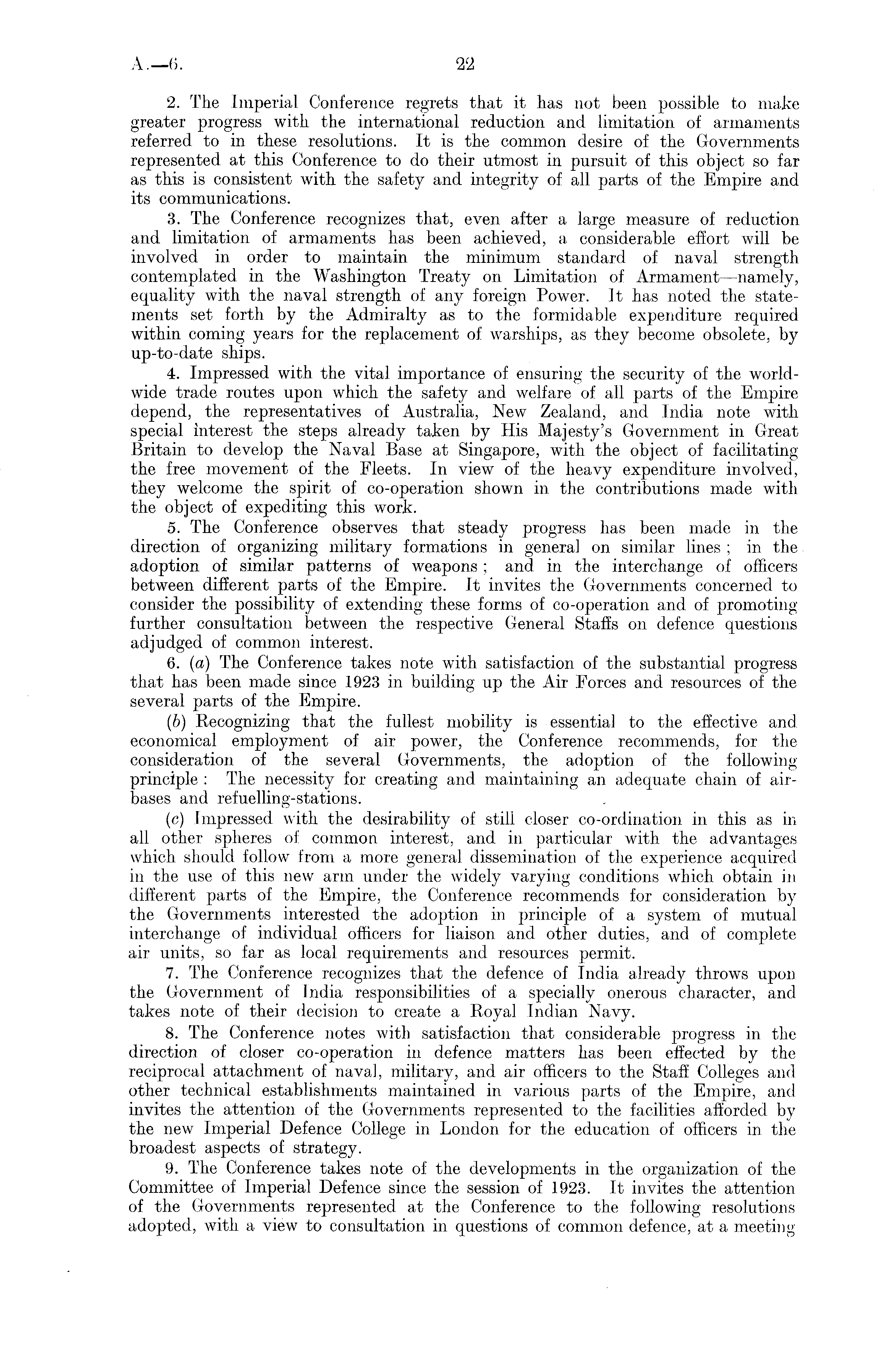 2. The Imperial Conference regrets that it has not been possible to make greater progress with the international reduction and limitation of armaments referred to in these resolutions. It is the common desire of the Governments represented at this Conference to do their utmost in pursuit of this object so far as this is consistent with the safety and integrity of all parts of the Empire and its communications. 3. The Conference recognizes that, even after a large measure of reduction and limitation of armaments has been achieved, a considerable effort will be involved in order to maintain the minimum standard of naval strength contemplated in the Washington Treaty on Limitation of Armament—namely, equality with the naval strength of any foreign Power. It has noted the statements set forth by the Admiralty as to the formidable expenditure required within coming years for the replacement of warships, as they become obsolete, by up-to-date ships. 4. Impressed with the vital importance of ensuring the security of the worldwide trade routes upon which the safety and welfare of all parts of the Empire depend, the representatives of Australia, New Zealand, and India note with special interest the steps already taken by His Majesty's Government in Great Britain to develop the Naval Base at Singapore, with the object of facilitating the free movement of the Fleets. In view of the heavy expenditure involved, they welcome the spirit of co-operation shown in the contributions made with the object of expediting this work. 5. The Conference observes that steady progress has been made in the direction of organizing military formations in general on similar lines ; in the adoption of similar patterns of weapons ; and in the interchange of officers between different parts of the Empire. It invites the Governments concerned to consider the possibility of extending these forms of co-operation and of promoting further consultation between the respective General Staffs on defence questions adjudged of common interest. 6. (a) The Conference takes note with satisfaction of the substantial progress that has been made since 1923 in building up the Air Forces and resources of the several parts of the Empire. (b) Recognizing that the fullest mobility is essential to the effective and economical employment of air power, the Conference recommends, for the consideration of the several Governments, the adoption of the following principle : The necessity for creating and maintaining an adequate chain of airbases and refuelling-stations. (c) Impressed with the desirability of still closer co-ordination in this as in all other spheres of common interest, and in particular with the advantages which should follow from a more general dissemination of the experience acquired in the use of this new arm under the widely varying conditions which obtain in different parts of the Empire, the Conference recommends for consideration by the Governments interested the adoption in principle of a system of mutual interchange of individual officers for liaison and other duties, and of complete air units, so far as local requirements and resources permit. 7. The Conference recognizes that the defence of India already throws upon the Government of India responsibilities of a specially onerous character, and takes note of their decision to create a Royal Indian Navy. 8. The Conference notes with satisfaction that considerable progress in the direction of closer co-operation in defence matters has been effected by the reciprocal attachment of naval, military, and air officers to the Staff Colleges and other technical establishments maintained in various parts of the Empire, and invites the attention of the Governments represented to the facilities afforded by the new Imperial Defence College in London for the education of officers in the broadest aspects of strategy. 9. The Conference takes note of the developments in the organization of the Committee of Imperial Defence since the session of 1923. It invites the attention of the Governments represented at the Conference to the following resolutions adopted, with a view to consultation in questions of common defence, at a meeting