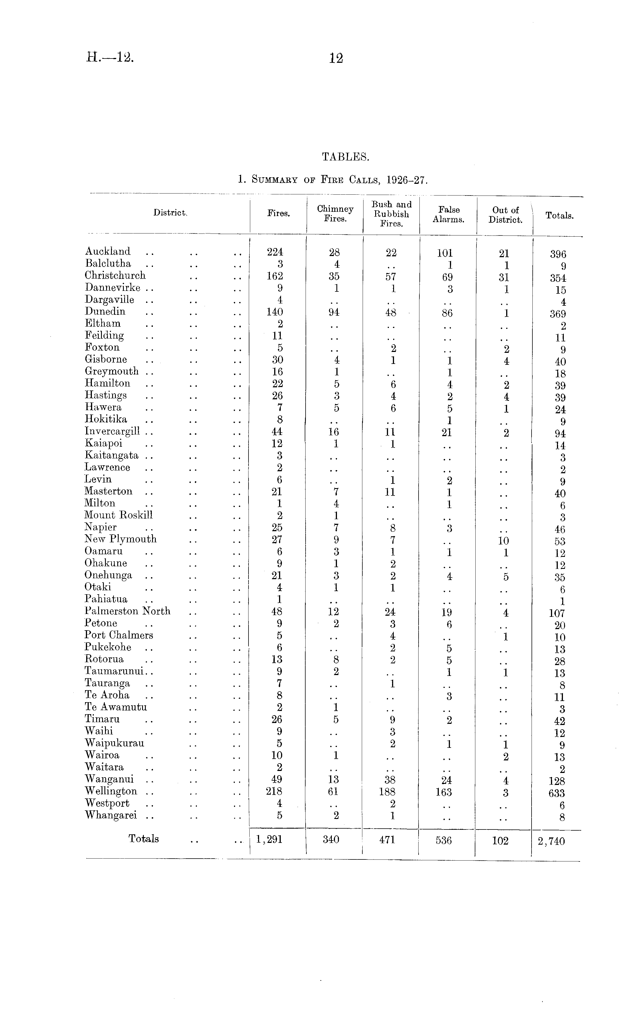 nu- Bush and t-, , „ , District. Fires. Chimney Rubbish False Out of Fires. Fireg Alarms. District. | xuodls - Auckland .. .. 224 28 22 101 21 396 Balclutha .. .. .. 3 4 .. 1 1 9 Christchurch .. 162 35 57 69 31 354 Dannevirke .. .. .. 9 1 1 3 1 15 Dargaville .. .. .. 4 .. . . .. .. 4 Dunedin .. .. 140 94 48 86 1 369 Eltham .. .. .. 2 ... .. .. 2 Feilding . . . . .. 11 .. . . .. .. n Foxton .. .. .. 5 .. 2 .. 2 9 G-isborne .. . . 30 4 1 1 4 40 Greymouth .. .. 16 1 .. 1 .. 18 Hamilton .. .. 22 5 6 4 2 39 Hastings .. .. 26 3 4 2 4 39 Hawera .. .. .. 7 5 6 5 1 24 Hokitika .. .. .. 8 .. .. 1 .. 9 Invercargill .. .. 44 16 11 21 2 94 Kaiapoi .. .. 12 1 1 .. .. 14 Kaitangata .. .. .. 3 .. ,. .. .. 3 Lawrence .. .. . . 2 .. .. .. .. 2 Levin .. .. .. 6 .. 1 2 .. 9 Masterton .. .. 21 7 11 1 .. 40 Milton .. .. .. 1 4 .. 1 .. 6 Mount Roskill .. .. 2 1 .. .. .. 3 Napier .. .. 25 7 8 3 .. 46 New Plymouth .. 27 9 7 .. 10 53 Oamaru .. .. .. 6 3 1 1 1 12 Ohakune .. .. .. 9 1 2 .. .. 12 Onehunga .. .. 21 3 2 4 5 35 Otaki .. .. .. 4 1 1 .. .. 6 Pahiatua .. .. .. 1 .. .. .. ... 1 Palmerston North .. 48 12 24 19 4 107 Petone .. .. .. 9 2 3 6 .. 20 Port Chalmers .... 5 .. 4 .. 1 10 Pukekohe .. .. .. 6 .. 2 5 ., 13 Rotorua .. .. 13 8 2 5 .. 28 Taumarunui.. .. .. 9 2 .. 1 1 13 Tauranga .. .. .. 7 .. 1 .. .. 8 Te Aroha .. .. .. 8 .. .. 3 .. 11 Te Awamutu .. .. 2 1 .. .. .. 3 Timaru .. .. 26 5 9 2 .. 42 Waihi .. .. . . 9 .. 3 .. .. 12 Waipukurau .. .. 5 .. 2 1 1 9 Wairoa .. .. 10 1 .. .. 2 13 Waitara .. .. .. 2 .. .. .. .. 2 Wanganui .. . . 49 13 38 24 4 128 Wellington .. . . . . 218 61 188 163 3 633 Westport .. .. .. 4 .. 2 .. ., 6 Whangarei .. .. .. 5 2 1 .. .. 8 Totals .. ..1,291 340 471 536 102 2,740