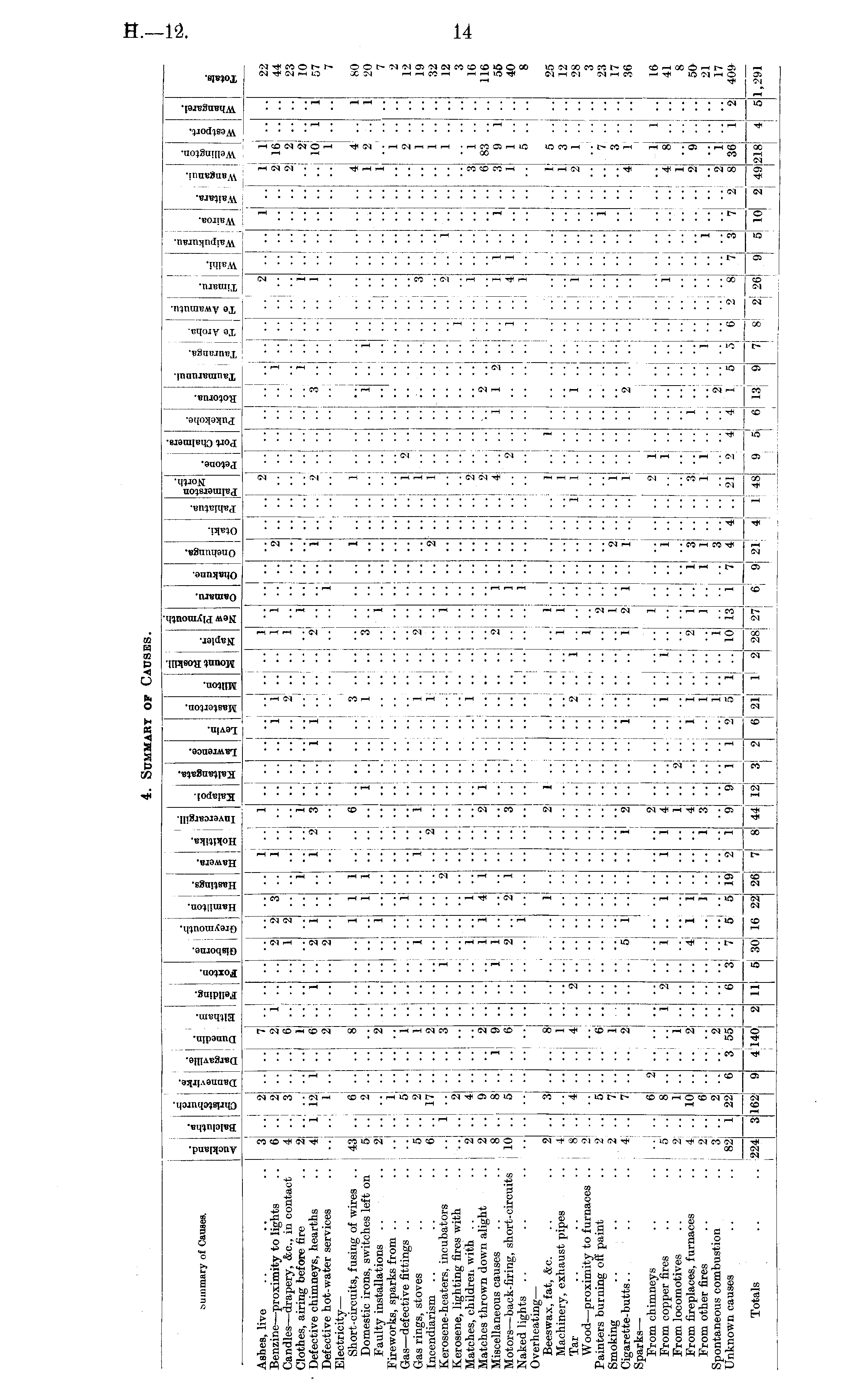 • 35 • S • a I • -G j I . 53 e8 S -C <3 "3 5 => . summary of Causes. g' 5 •I ! ~ j g I g 0 ' a ; | 2 < §> g 3 , § "o a 1 § t! • 5 — 5 § 3 % £& • ~ = 2 | |f •§ | 3 - | « j j f 3 S 5 •3-2-i cSl , g§ ~§g:S=!.S8B l sJ&§§ a -og'S!iafM§s3.j-gS flO'ggs«555!-3o,8«S-S , a 3 H ! i l I I i i i ' I i i i T i 1 i i" Ashes, live .. .. .. 3 .. 2 .. .. 7 .. .. ........ .. 1 ..J 1 j..l..j.. 1 .. .. ,. .. .. ..J 2 ' 2 ..... 1 .. lj 1 .. .. 22 Benzine —proximity to lights .. 6j ..j 2 .. .. 2, l 1 .. .. 2j 2] 3 .. 1 ..j 1 lj ..j ..11 .. .. 2; .. .. 1 j 2 16 .. .. 44 Candles —drapery, &c., in contact 4j .. 3 .. .. 6] 1 2j j 2j .. .. 1 .. .. | .. .. .. . .| ! 2; 2 .. .. 23 Clothes, airing before fire .. 2 lj 1 .. .. 1 .. j ..I .. .. 1 .. .. . .j .. ..j 1 1 ..j : 2 .. .. 10 Defective chimneys, hearths .. 4! 1 12 1 .. 6| .. 1 .. 2 1.... 1 23.... 1 1. ..i ..! .. 2 .. ..j .. 1 .. .. 2 3 1 .. j ........ 10 1 1 57 Defective hot-water services .. -.j.-! 1 •• •• 2 2 | j 1 j j ; 1 .. .. 7 Electricity — Short-circuits, fusing of wires .. j 43 .. 6.. .. 8 1 1 1 .. .. | 6 3..! 1.. .. 1 : 4 4.. 1 80 Domestic irons, switches left on 5 .. 2 1 1.. ..j.. 1 1..;.. 3 1 .. 1 .. .. 1 2.. 1 20 Faulty installations .. .. j 2 2 j lj I .. .. ..1 j j 1 ..! . J 7 Fireworks, sparks from .. .. 1 I .. .. j 1 .. .. 2 Gas —defective fittings .. .. j .. .. 5 .. .. 1 j.. 1 |1 2 2 .. .. 12 Gas rings, stoves .. .. j 5 .. 2 .. .. 1 lj 1 .. 1 1 .. .. 2 1 ....13.. 1 .. .. 19 Incendiarism .. ... .. j 6 .. 17 .. .. 2 .... . .j .. j 2 : 1; .. j .. 2 .. .. 1 .. .. .. j .. 1 .. .. 32 Kerosene-heaters, incubators .. .. 1 3 .. .. lj .. ..< .. 2 .j ..j .. .. 1 ! 2 .. 1 1 .. 12 Kerosene, lighting fires with .... .. 2 ; i .. 1 3 Matches, children with .. .. 2.. 4 1.. 1 1 2 1 ...... 1 3 1.... 16 Matches thrown down alight ..j 2 .. 9 .. .. 2 1 1 4 1 .. .. 2 1 ! 2 .. .. .. 2 ..j I .. 6 83 .. .. 116 Miscellaneous causes .. ..'8.. 8.. 1 9.. .. 1 1 2.. 1 j 4 .. .. 1 1 2j jl 1.. 1.. 3 9 1.. 55 Motors —back-firing, short-circuits 10.. 5... .16 2.. 2 1.... 3 1 j .. 2 .. 1 .. j 4 1 1 1.... 40 Naked lights .. .. .. 1 1 j S 1 5 .. .. 8 Overheating — Beeswax, fat, &c. .. .. 2 .. 3 .. .. 8 1 2 1 .... 1 1.. 1 j 1 5 25 Machinery, exhaust pipes .. 4 1 1 1 1 j ! .. 1 3 _ _ 12 Tar " .. .. ..I 8| .. 4 .. .. 4 .. 2 2 .. 1 li 1 1 ..j 1 1 2 1 .. .. 28 Wood —proximity to furnaces .. 2j 1 : j : 3 Painters burning off paint .. 2 .. 5 .. .. 6| 2 ] 7, .. 23 Smoking .. .. .. 2 .. 7 .. .. 1 1 .. .. 2 .. .. 1 j 3 .. .. 17 Cigarette-butts.. .. .. 4.. 7 .... 2 5 1 1 2 1 1 2 1.. 1....1 2 ..' 4 1.... 36 Sparks — From chimneys .. .. 6 2 2 1 2 1 1 j.. 1 1 .. 16 From copper fires .. .. 5] .. 8.. .. .. 1 2 .. j 1 .. 1.. 1 1 4 1.. 1 1 1 | 1 j 4 8 .. 41 From locomotives .. .. 2j .. 1 .. .. 1 j.. .. j 1 .. 2 j ; 1 8 From fireplaces, furnaces .. 4.. 10.. .. 2 4 1 1 4 1 1.. .. 2 1.. 1 3.. .. 3.. .. 1.. j 2 9 .. 50 From other fires .. ..12.. 6 | .... j ]. .... 1 3 1 1 .. 1 1.. .. 1 1 j .. 1.. .. .. .. 1.. ..j 21 Spontaneous combustion .. j 3 .. 2 ... . .j 2 j .. ..J 1 .. .. 1 3 2: ' 2 1 .. .. 17 Unknown causes .. .. | 82 1 22 6 3 55 .. 6 3 755 19 2 1991 1 2 5 1.. 10 13 1 7 44.. 2] 244 1 5562 873 72 8 36 1 2 409 Totals .. .. 224 3162 9 4 140 2 11 5 30 16 22 26 7 8 44 12 3 2 6 21 1 2 28 27 6 9 21 4 1 48 9 5j 6 13 9 7 8 2 26 9 5 10 2 49 218 4 5 1 291 L__ L 1 1 1 I 1 i