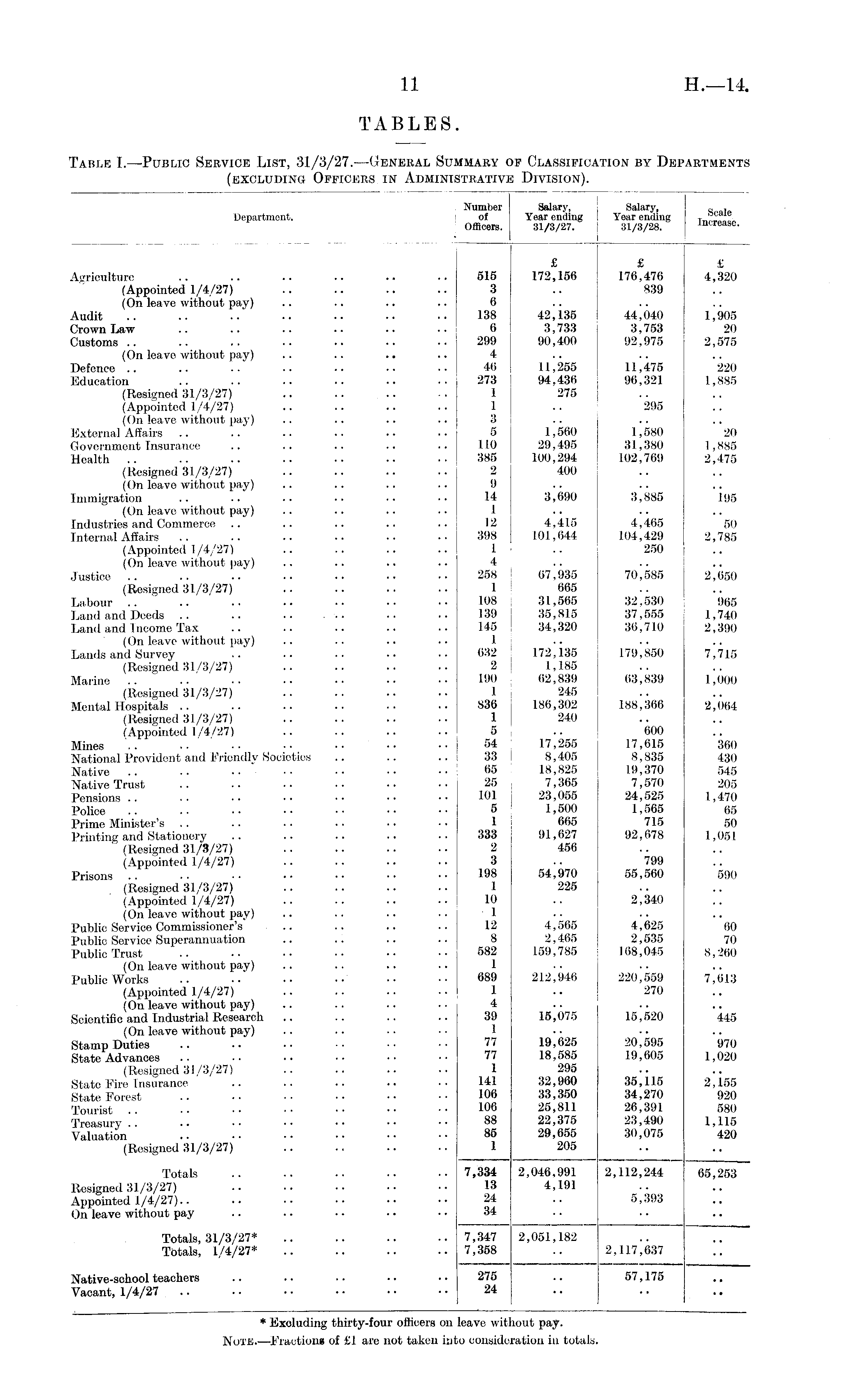 Number Salary, Salary, „ . Department. of Year ending Year ending t™ » Officers. 31/3/27. 31/3/28. increase. £ £ £ Agriculture .. .. .. .. .. .. 515 172,156 176,476 4,320 (Appointed 1/4/27) .. .. .. .. 3 .. 839 (On leave without pay) .. .. .. .. 6 Audit .. .. .. •• • • 138 42,135 44,040 1,905 Crown Law .. .. .. •• •• 6 3,733 3,753 20 Customs .. .. .. •• •• •• 299 90,400 92,975 2,575 (On leave without pay) .. .. .. .. 4 Defence .. .. .. .. .. • • • • 46 11,255 11,475 220 Education .. .. .. •• •• •• 273 94,436 96,321 1,885 (Resigned 31/3/27) .. .. .. .. 1 275 (Appointed 1/4/27) .. .. .. .. 1 .. 295 (On leave without pay) .. .. .. .. 3 External Affairs .. .. . • • • • • ■ • 5 1,560 1,580 20 Government Insurance .. .. .. .. .. 110 29,495 31,380 1,885 Health .. .. .. .. • • •• 385 100,294 102,769 2,475 (Resigned 31/3/27) .. .. .. .. 2 400 (On leave without pay) .. .. .. .. 9 Immigration .. .. .. •• •• 14 3,690 3,885 195 (On leave without pay) .. .. .. .. 1 Industries and Commerce .. .. .. .. .. 12 4,415 4,465 50 Internal Affairs .. .. .. •• •• •• 398 101,644 104,429 2,785 (Appointed 1/4/27) .. .. .. .. 1 : .. 250 (On leave without pay) .. .. .. .. 4 Justice .. .. 258 67,935 70,585 2,650 (Resigned 31/3/27) .. .. .. •• 1 665 Labour .. 108 31,565 32,530 965 Land and Deeds .. .. .. . •• •• 139 35,815 37,555 1,740 Land and Income Tax .. .. .. .. .. 145 34,320 36,710 2,390 (On leave without pay) .. .. .. .. 1 Lands and Survey .. .. .. •• •• 632 172,135 179,850 7,715 (Resigned 31 /3/27) .. .. .. .. 2 1,185 Marine .. .. • • •• •• •• 190 62,839 63,839 1,000 (Resigned 31/3/27) .. .. .. .. 1 245 Mental Hospitals .. .. •. .. 836 186,302 188,366 2,064 (Resigned 31/3/27) .. .. . ■ .. 1 240 (Appointed 1/4/27) .. .. •• 5 .. 600 Mines .. ' 54 17,255 17,615 360 National Provident and Friendly Societies .. .. .. 33 8,405 8,835 430 Native .. .. 65 18,825 19,370 545 Native Trust .. •• •• •• •• •• 25 7,365 7,570 205 Pensions .. • • •• •• •• •• •• 10' 23,055 24,525 1,470 Police 5 1,500 1,565 65 Prime Minister's .. .. •. .. •. ■ • 1 665 715 50 Printing and Stationery .. .. .. .. •• 333 91,627 92,678 1,051 (Resigned 31/3/27) .. .. .. •• 2 456 (Appointed 1/4/27) .. .. .. .. 3 .. 799 Prisons 198 54,970 55,560 590 (Resigned 31/3/27) .. .. .. .. 1 225 (Appointed 1/4/27) .. .. .. •• 10 .. 2,340 (On leave without pay) .. .. .. •. I Public Service Commissioner's .. .. .. • • 12 4,565 4,625 60 Public Service Superannuation .. .. .. .. 8 2,465 2,535 70 Public Trust .. .. •• •• •• •• 582 159,785 168,045 8,260 (On leave without pay) .. .. t. .. 1 Public Works •• •• •• •• 689 212,946 220,559 7,613 (Appointed 1/4/27) .. .. .. • • 1 .. 270 (On leave without pay) .. .. .. . • 4 Scientific and Industrial Research .. .. .. .. 39 15,075 15,520 445 (On leave without pay) .. .. .. .. 1 Stamp Duties .. •• •• ■■ •• 77 19,625 20,595 970 State Advances . • •• •• •• •• •• 77 18,585 19,605 1,020 (Resigned 31/3/27) .. .. . • • • 1 295 State Fire Insurance .. .. • • •• •• 141 32,960 35,115 2,155 State Forest .. •• •• •• ■■ 106 33,350 34,270 920 Tourist .. ■■ •• •• 1°6 25,811 26,391 580 Treasury .. •• •• •• •• •• •• 22,375 23,490 1,115 Valuation 85 29,655 30,075 420 (Resigned 31/3/27) .. .. . • •• 1 205 Totals 7,334 2,046,991 2,112,244 65,253 Resigned 31/3/27) 13 4,191 Appointed 1/4/27).. .. •• •• •• 24 .. 5,393 On leave without pay .. .. • • • • • • 34 Totals, 31/3/27* 7,347 2,051,182 .. T7~ Totals, 1/4/27* 7,358 .. 2,117,637 Native-schoolteachers .. .. •• •• •• 275 .. 57,175 Vaoant, 1/4/27 .. •• •• •• •• 24 * Excluding thirty-four officers on leave without pay. Note.—Fractions of £1 are not taken into consideration in totals.
