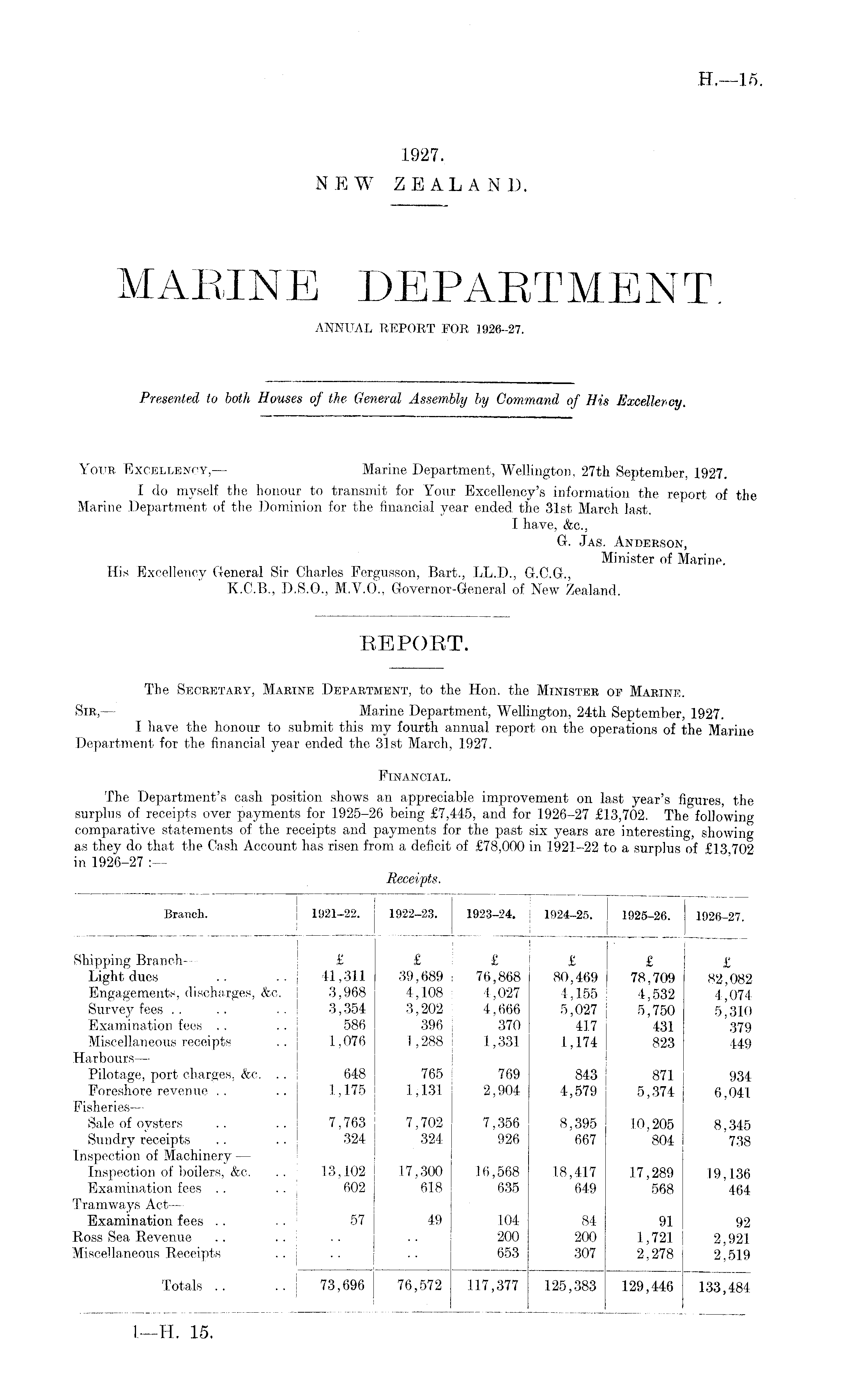 REPORT. The Secretary, Marine Department, to the Hon. the Minister op Marine. Str, — Marine Department, Wellington, 24th September, 1927. I have the honour to submit this my fourth annual report on the operations of the Marine Department for the financial year ended the 31st March, 1927. Financial. The Department's cash position shows an appreciable improvement on last year's figures, the surplus of receipts over payments for 1925-26 being £7,445, and for 1926-27 £13,702. The following comparative statements of the receipts and payments for the past six years are interesting, showing as they do that the Cash Account has risen from a deficit of £78,000 in 1921-22 to a surplus of £13 702 in 1926-27
