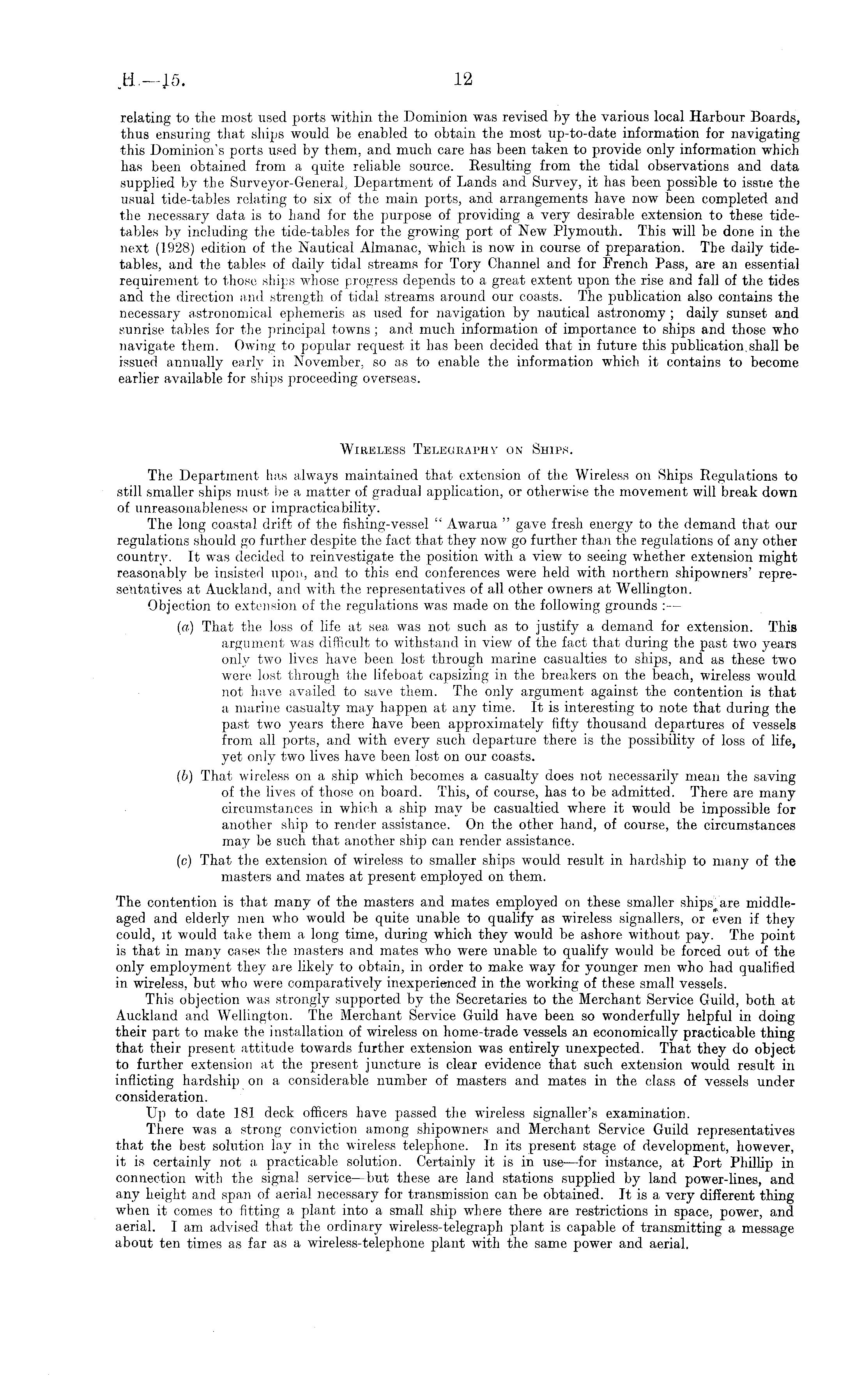 relating to the most used ports within the Dominion was revised by the various local Harbour Boards, thus ensuring that ships would be enabled to obtain the most up-to-date information for navigating this Dominion's ports used by them, and much care has been taken to provide only information which has been obtained from a quite reliable source. Resulting from the tidal observations and data supplied by the Surveyor-General, Department of Lands and Survey, it has been possible to issue the usual tide-tables relating to six of the main ports, and arrangements have now been completed and the necessary data is to hand for the purpose of providing a very desirable extension to these tidetables by including the tide-tables for the growing port of New Plymouth. This will be done in the next (1928) edition of the Nautical Almanac, which is now in course of preparation. The daily tidetables, and the tables of daily tidal streams for Tory Channel and for French Pass, are an essential requirement to those ships whose progress depends to a great extent upon the rise and fall of the tides and the direction and strength of tidal streams around our coasts. The publication also contains the necessary astronomical ephemeris as used for navigation by nautical astronomy ; daily sunset and sunrise tables for the principal towns; and much information of importance to ships and those who navigate them. Owing to popular request it has been decided that in future this publication,shall be issued annually early in November, so as to enable the information which it contains to become earlier available for ships proceeding overseas. Wireless Telegraphy on Ships. The Department has always maintained that extension of the Wireless on Ships Regulations to still smaller ships must be a matter of gradual application, or otherwise the movement will break down of unreasonableness or impracticability. The long coastal drift of the fishing-vessel " Awarua " gave fresh energy to the demand that our regulations should go further despite the fact that they now go further than the regulations of any other country. It was decided to reinvestigate the position with a view to seeing whether extension might reasonably be insisted upon, and to this end conferences were held with northern shipowners' representatives at Auckland, and with the representatives of all other owners at Wellington. Objection to extension of the regulations was made on the following grounds : — (a) That the loss of life at sea was not such as to justify a demand for extension. This argument was difficult to withstand in view of the fact that during the past two years oniv two lives have been lost through marine casualties to ships, and as these two were lost through the lifeboat capsizing in the breakers on the beach, wireless would not have availed to save them. The only argument against the contention is that a marine casualty may happen at any time. It is interesting to note that during the past two years there have been approximately fifty thousand departures of vessels from all ports, and with every such departure there is the possibility of loss of life, yet only two lives have been lost on our coasts. (b) That wireless on a ship which becomes a casualty does not necessarily mean the saving of the lives of those on board. This, of course, has to be admitted. There are many circumstances in which a ship may be casualtied where it would be impossible for another ship to render assistance. On the other hand, of course, the circumstances may be such that another ship can render assistance. (c) That the extension of wireless to smaller ships would result in hardship to many of the masters and mates at present employed on them. The contention is that many of the masters and mates employed on these smaller middleaged and elderly men who would be quite unable to qualify as wireless signallers, or even if they could, it would take them a long time, during which they would be ashore without pay. The point is that in many cases the masters and mates who were unable to qualify would be forced out of the only employment they are likely to obtain, in order to make way for younger men who had qualified in wireless, but who were comparatively inexperienced in the working of these small vessels. This objection was strongly supported by the Secretaries to the Merchant Service Guild, both at Auckland and Wellington. The Merchant Service Guild have been so wonderfully helpful in doing their part to make the installation of wireless on home-trade vessels an economically practicable thing that their present attitude towards further extension was entirely unexpected. That they do object to further extension at the present juncture is clear evidence that such extension would result in inflicting hardship on a considerable number of masters and mates in the class of vessels under consideration. Up to date 181 deck officers have passed the wireless signaller's examination. There was a strong conviction among shipowners and Merchant Service Guild representatives that the best solution lay in the wireless telephone. In its present stage of development, however, it is certainly not a practicable solution. Certainly it is in use —for instance, at Port Phillip in connection with the signal service—but these are land stations supplied by land power-lines, and any height and span of aerial necessary for transmission can be obtained. It is a very different thing when it comes to fitting a plant into a small ship where there are restrictions in space, power, and aerial. lam advised that the ordinary wireless-telegraph plant is capable of transmitting a message about ten times as far as a wireless-telephone plant with the same power and aerial.