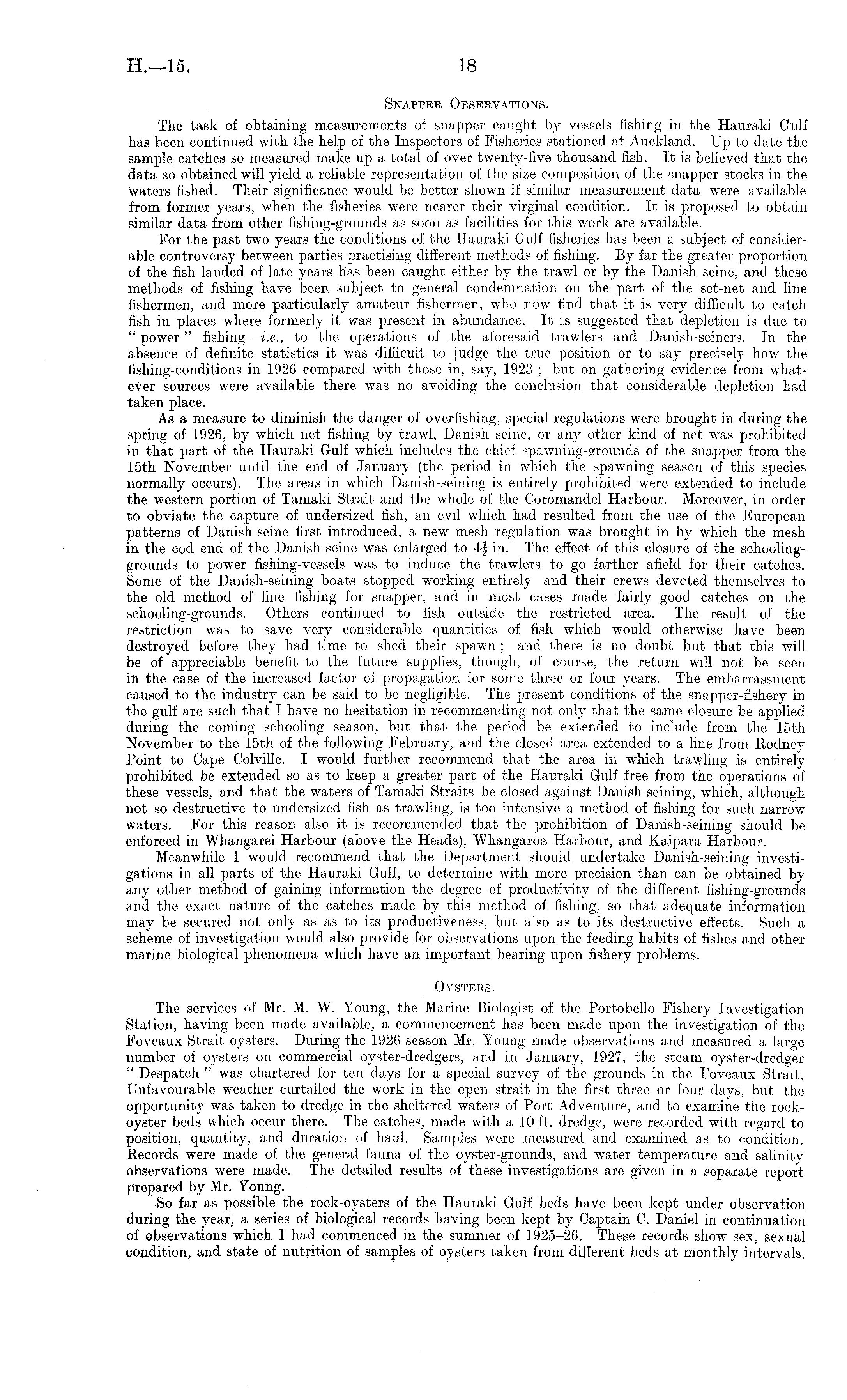 Snapper Observations. The task of obtaining measurements of snapper caught by vessels fishing in the Hauraki Gulf has been continued with the help of the Inspectors of Fisheries stationed at Auckland. Up to date the sample catches so measured make up a total of over twenty-five thousand fish. It is believed that the data so obtained will yield a reliable representation of the size composition of the snapper stocks in the waters fished. Their significance would be better shown if similar measurement data were available from former years, when the fisheries were nearer their virginal condition. It is proposed to obtain similar data from other fishing-grounds as soon as facilities for this work are available. For the past two years the conditions of the Hauraki Gulf fisheries has been a subject of considerable controversy between parties practising different methods of fishing. By far the greater proportion of the fish landed of late years has been caught either by the trawl or by the Danish seine, and these methods of fishing have been subject to general condemnation on the part of the set-net and line fishermen, and more particularly amateur fishermen, who now find that it is very difficult to catch fish in places where formerly it was present in abundance. It is suggested that depletion is due to " power " fishing —i.e., to the operations of the aforesaid trawlers and Danish-seiners. In the absence of definite statistics it was difficult to judge the true position or to say precisely how the fishing-conditions in 1926 compared with those in, say, 1923 ; but on gathering evidence from whatever sources were available there was no avoiding the conclusion that considerable depletion had taken place. As a measure to diminish the danger of overfishing, special regulations were brought in during the spring of 1926, by which net fishing by trawl, Danish seine, or any other kind of net was prohibited in that part of the Hauraki Gulf which includes the chief spawning-grounds of the snapper from the 15th November until the end of January (the period in which the spawning season of this species normally occurs). The areas in which Danish-seining is entirely prohibited were extended to include the western portion of Tamaki Strait and the whole of the Coromandel Harbour. Moreover, in order to obviate the capture of undersized fish, an evil which had resulted from the use of the European patterns of Danish-seine first introduced, a new mesh regulation was brought in by which the mesh in the cod end of the Danish-seine was enlarged to in. The effect of this closure of the schoolinggrounds to power fishing-vessels was to induce the trawlers to go farther afield for their catches. Some of the Danish-seining boats stopped working entirely and their crews devoted themselves to the old method of line fishing for snapper, and in most cases made fairly good catches on the schooling-grounds. Others continued to fish outside the restricted area. The result of the restriction was to save very considerable quantities of fish which would otherwise have been destroyed before they had time to shed their spawn ; and there is no doubt but that this will be of appreciable benefit to the future supplies, though, of course, the return will not be seen in the case of the increased factor of propagation for some three or four years. The embarrassment caused to the industry can be said to be negligible. The present conditions of the snapper-fishery in the gulf are such that I have no hesitation in recommending not only that the same closure be applied during the coming schooling season, but that the period be extended to include from the 15th November to the 15th of the following February, and the closed area extended to a line from Rodney Point to Cape Colville. I would further recommend that the area in which trawling is entirely prohibited be extended so as to keep a greater part of the Hauraki Gulf free from the operations of these vessels, and that the waters of Tamaki Straits be closed against Danish-seining, which, although not so destructive to undersized fish as trawling, is too intensive a method of fishing for such narrow waters. For this reason also it is recommended that the prohibition of Danish-seining should be enforced in Whangarei Harbour (above the Heads), Whangaroa Harbour, and Kaipara Harbour. Meanwhile I would recommend that the Department should undertake Danish-seining investigations in all parts of the Hauraki Gulf, to determine with more precision than can be obtained by any other method of gaining information the degree of productivity of the different fishing-grounds and the exact nature of the catches made by this method of fishing, so that adequate information may be secured not only as as to its productiveness, but also as to its destructive effects. Such a scheme of investigation would also provide for observations upon the feeding habits of fishes and other marine biological phenomena which have an important bearing upon fishery problems. Oysters. The services of Mr. M. W. Young, the Marine Biologist of the Portobello Fishery Investigation Station, having been made available, a commencement has been made upon the investigation of the Foveaux Strait oysters. During the 1926 season Mr. Young made observations and measured a large number of oysters on commercial ovster-dredgers, and in January, 1927, the steam oyster-dredger " Despatch " was chartered for ten days for a special survey of the grounds in the Foveaux Strait. Unfavourable weather curtailed the work in the open strait in the first three or four days, but the opportunity was taken to dredge in the sheltered waters of Port Adventure, and to examine the rockoyster beds which occur there. The catches, made with alO ft. dredge, were recorded with regard to position, quantity, and duration of haul. Samples were measured and examined as to condition. Records were made of the general fauna of the oyster-grounds, and water temperature and s