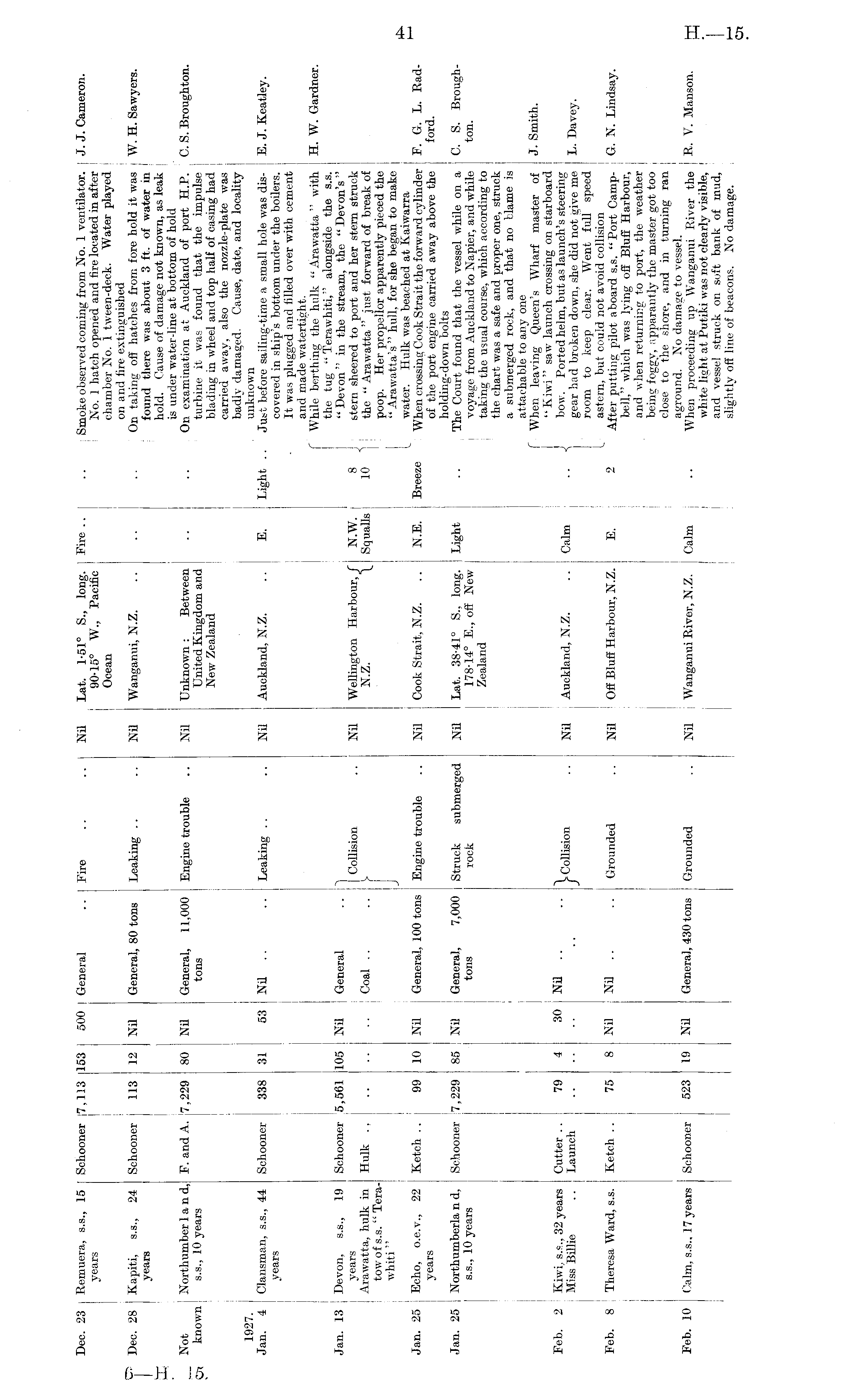 Dec. 23 Remuera, s.s., 15 Schooner 7,113 153 I 500 General .. | Fire .. .. Nil Lat. 1-51° S., long. Fire.. .. Smoke observed coming from No. 1 ventilator, j J. J. Cameron, years | I 90-15° W., Pacific No. 1 hatch opened and fire located in after Ocean chamber No. 1 tween-deck. Water played j j j on and fire extinguished 7* Dec. 28 Kapiti, s.s., 24 Schooner 113 12 Nil General, 80 tons Leaking .. .. Nil Wanganui, N.Z. .. .. .. On taking off hatches from fore hold it was W. H. Sawyers. years ! j i found there was about 3 ft. of water in j jT*. ] I hold. Cause of damage not known, as leak | is under water-line at bottom of hold f . Not Northumberland, F. and A. 7,229 80 | Nil General, 11,000 Engine trouble .. Nil Unknown: Between .. .. On examination at Auckland of port H.P. C. S. Broughton. O* known s.s., 10 years tons ! United Kingdom and turbine it was found that the impulse New Zealand blading in wheel and top half of casing had carried away, also the nozzle-plate was badly damaged. Cause, date, and locality 1927. j I | j unknown Jan. 4 Clansman, s.s., 44 Schooner 338 31 j 53 Nil .. .. Leaking .. .. Nil Auckland, N.Z. .. E. Light .. Just before sailing-time a small hole was dis- E. J. Keatley. years I covered in ship's bottom under the boilers. It was plugged and filled over with cement and made watertight. While berthing the hulk "Arawatta" with H. W. Gardner, the tug " Terawhiti," alongside the s.s. Jan. 13 Devon, s.s., 19 Schooner 5,561 105 j Nil General ** |1 1 "Devon" in the stream, the "Devon's" years . j Collision .. Nil Wellington Harbour, f N.W. I 8 , stern sheered to port and her stern struck Arawatta, hulk in Hulk ., j .. .. j . . Coal .. .. I y N.Z. \ Squalls ! 10 j the " Arawatta" just forward of break of tow of s.s." Tera- j j j i 1 poop. Her propel lor apparently pieced the whiti" j jj | " Arawatta's" hull, for she began to make I : L water. Hulk was beached at Kaiwarra Jan. 25 Echo, o.e.v., 22 Ketch .. 99 10 Nil General, 100 tons Engine trouble .. Nil Cook Strait, N.Z. .. N.E. Breeze When crossing Cook Strait the forward cylinder F. G. L. Radyears I of the port engine carried away above the ford. | I holding-down bolts Jan. 25 i Northumberland, Schooner [7,229 85 j Nil General, 7,000 | Struck submerged Nil Lat. 38-41° S., long. Light .. The Court found that the vessel while on a C. S. Broughs.s., 10 years tons rock 178-14° E., off New voyage from Auckland to Napier, and while ton. Zealand taking the usual course, which according to the chart was a safe and proper one, struck a submerged rock, and that no blame is attachable to any one When leaving Queen's Wharf master of J. Smith. | # "Kiwi" saw launch crossing on starboard Feb ' 2 Mi«T?ffli' 0 32yearS Wh" 79 4 30 Xil ' ' "V CoUision .. Nil Auckland, N.Z. .. Calm .. <( bow. Ported helm, but as launch's steering Miss Billie .. Launch ....... .. j gear had broken down, she did not give me L. Davey. room to keep clear. Went full speed I astern, but could not avoid collision Feb. 8 Theresa Ward, s.s. Ketch .. 75 8 Nil Nil .. .. Grounded .. Nil Off Bluff Harbour, N.Z. E. 2 After putting pilot aboard s.s. "Port Camp- G. N. Lindsay. bell," which was lying off Bluff Harbour, | and when returning to port, the weather i being foggy, apparantly the master got too , close to the shore, and in turning ran j I m xt-1 aground. No damage to vessel. Feb. 10 (.'aim, s.s., 17 years j Schooner 523 19 Ail General, 430 tons Grounded .. Nil Wanganui River, N.Z. Calm .. When proceeding up Wanganui River the ' R» V. Manson. white light at Putiki was not clearly visible, ! and vessel struck on soft bank of mud, slightly off line of beacons. No damage.