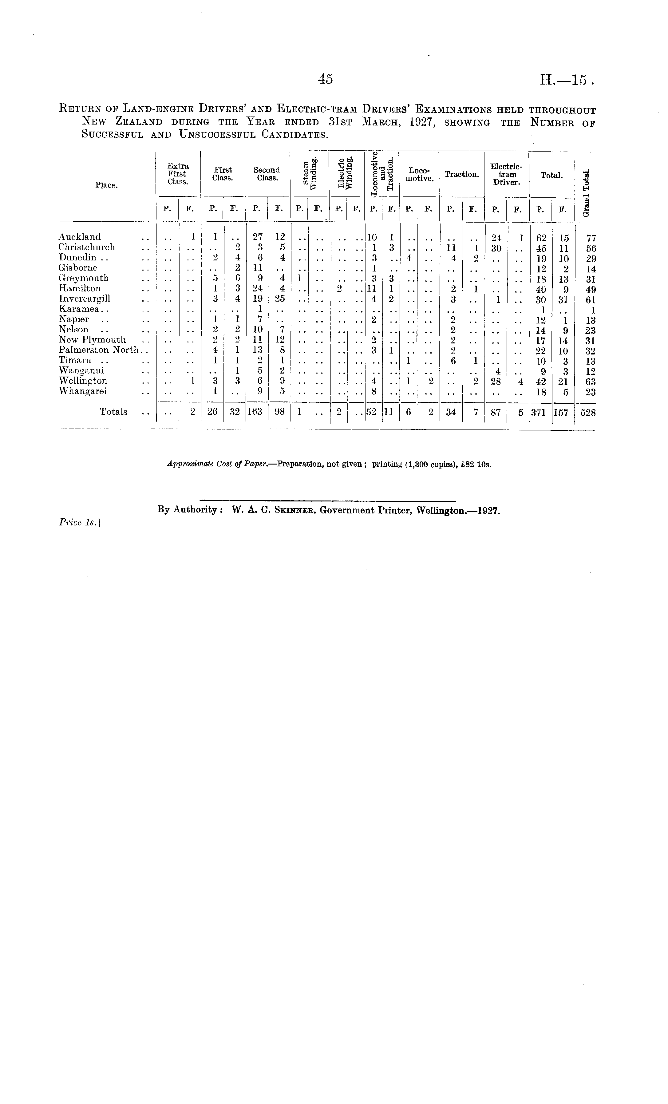 Return of Land-engine Drivers' and Electric-tram Drivers' Examinations held throughout New Zealand during the Year ended 31st March, 1927, showing the Number of Successful and Unsuccessful Candidates.