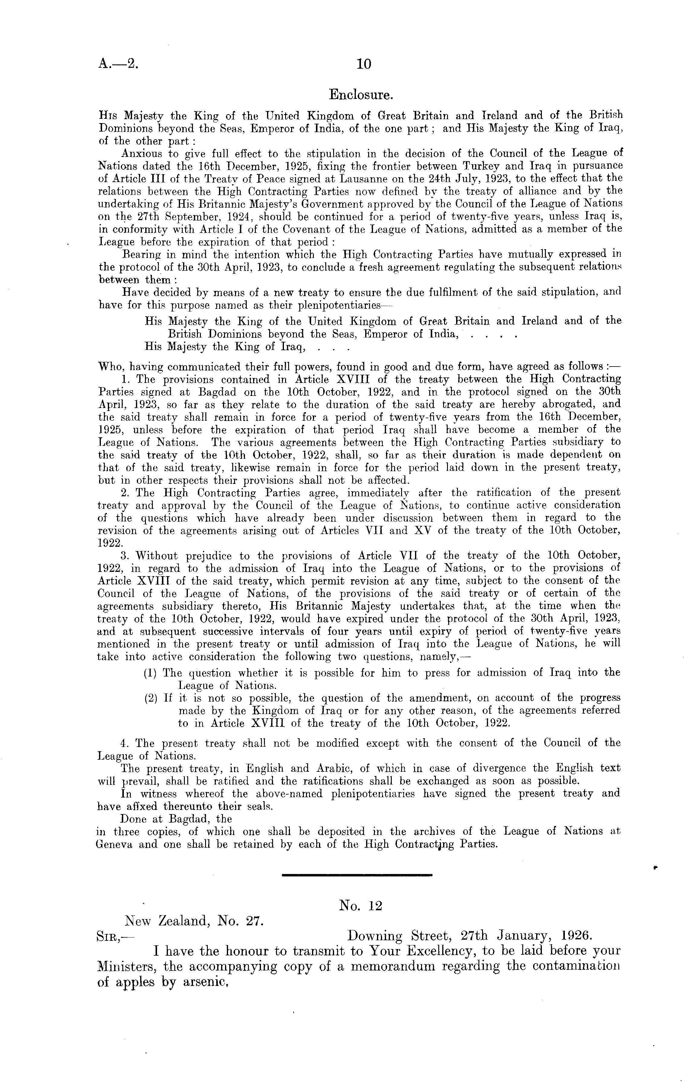 Enclosure. His Majesty the King of the United Kingdom of Great Britain and Ireland and of the British Dominions beyond the Seas, Emperor of India, of the one part; and His Majesty the King of Iraq, of the other part : Anxious to give full effect to the stipulation in the decision of the Council of the League of Nations dated the 16th December, 1925, fixing the frontier between Turkey and Iraq in pursuance of Article 111 of the Treaty of Peace signed at Lausanne on the 24th July, 1923, to the effect that the relations between the High Contracting Parties now defined by the treaty of alliance and by the undertaking of His Britannic Majesty's Government approved by the Council of the League of Nations on the 27th September, 1924, should, be continued for a period of twenty-five years, unless Iraq is, in conformity with Article I of the Covenant of the League of Nations, admitted as a member of the League before the expiration of that period : Bearing in mind the intention which the High Contracting Parties have mutually expressed in the protocol of the 30th April, 1923, to conclude a fresh agreement regulating the subsequent relations between them : Have decided by means of a new treaty to ensure the due fulfilment of the said stipulation, and have for this purpose named as their plenipotentiaries — His Majesty the King of the United Kingdom of Great Britain and Ireland and of the British Dominions beyond the Seas, Emperor of India, .... His Majesty the King of Iraq, . . . Who, having communicated their full powers, found in good and due form, have agreed as follows 1. The provisions contained in Article XVIII of the treaty between the High Contracting Parties signed at Bagdad on the 10th October, 1922, and in the protocol signed on the 30th April, 1923, so far as they relate to the duration of the said treaty are hereby abrogated, and the said treaty shall remain in force for a period of twenty-five years from the 16th December, 1925, unless before the expiration of that period Iraq shall have become a member of the League of Nations. The various agreements between the High Contracting Parties subsidiary to the said treaty of the 10th October, 1922, shall, so far as their duration is made dependent on that of the said treaty, likewise remain in force for the period laid down in the present treaty, but in other respects their provisions shall not be affected. 2. The High Contracting Parties agree, immediately after the ratification of the present treaty and approval by the Council of the League of Nations, to continue active consideration of the questions which have already been under discussion between them in regard to the revision of the agreements arising out of Articles YII and XV of the treaty of the 10th October, 1922. 3. Without prejudice to the provisions of Article VII of the treaty of the 10th October, 1922, in regard to the admission of Iraq into the League of Nations, or to the provisions of Article XVIII of the said treaty, which permit revision at any time, subject to the consent of the Council of the League of Nations, of the provisions of the said treaty or of certain of the agreements subsidiary thereto, His Britannic Majesty undertakes that, at the time when the treaty of the 10th October, 1922, would have expired under the protocol of the 30th April, 1923, and at subsequent successive intervals of four years until expiry of period of twenty-five years mentioned in the present treaty or until admission of Iraq into the League of Nations, he will take into active consideration the following two questions, namely, — (1) The question whether it is possible for him to press for admission of Iraq into the League of Nations. (2) If it is not so possible, the question of the amendment, on account of the progress made by the Kingdom of Iraq or for any other reason, of the agreements referred to in Article XVIII of the treaty of the 10th October, 1922. 4. The present treaty shall not be modified except with the consent of the Council of the League of Nations. The present treaty, in English and Arabic, of which in case of divergence the English text will prevail, shall be ratified and the ratifications shall be exchanged as soon as possible. In witness whereof the above-named plenipotentiaries have signed the present treaty and have affixed thereunto their seals. Done at Bagdad, the in three copies, of which one shall be deposited in the archives of the League of Nations at Geneva and one shall be retained by each of the High Contracting Parties. 9-