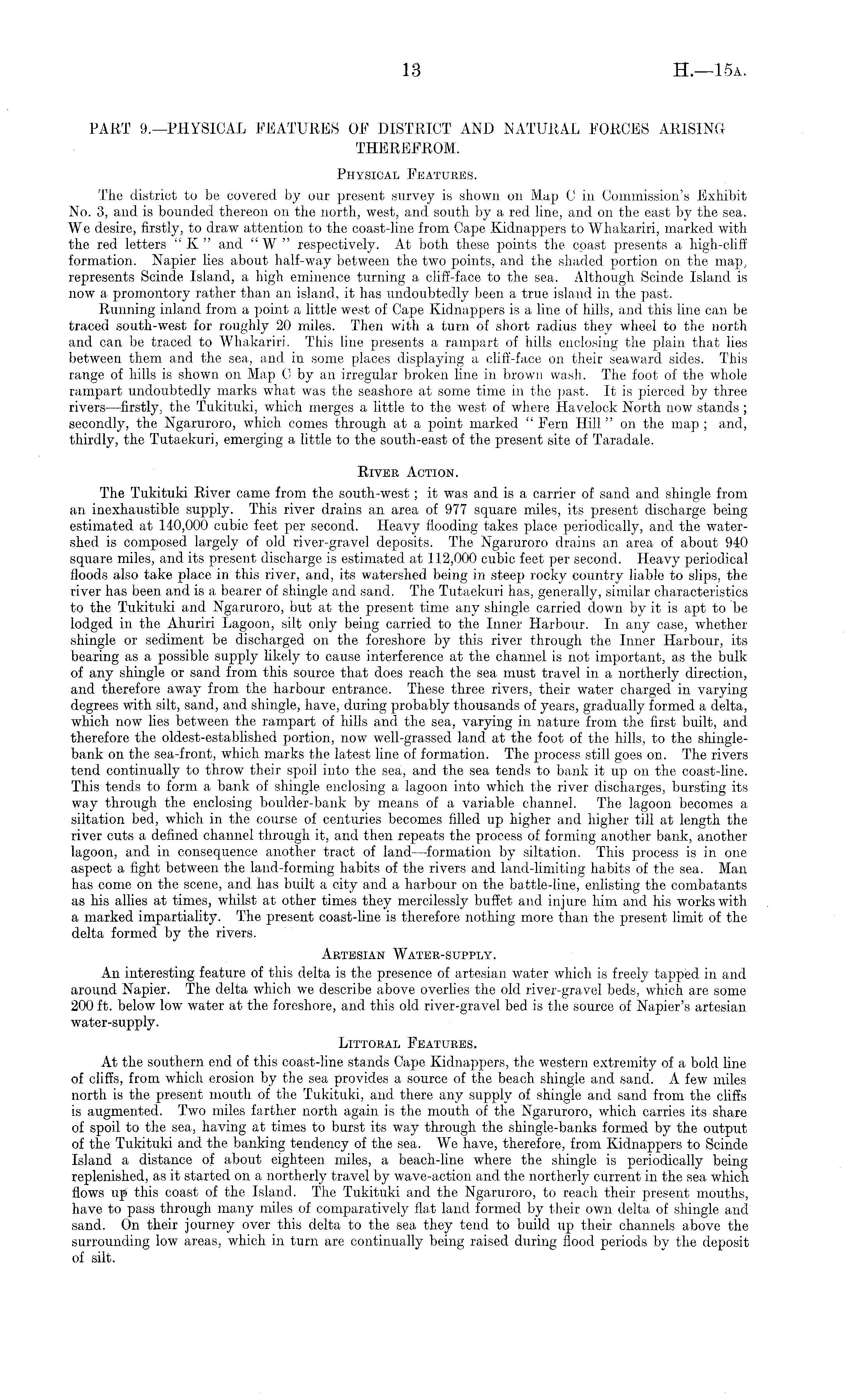 PART 9.—PHYSICAL FEATURES OF DISTRICT AND NATURAL FORCES ARISING THEREFROM. Physical Features. The district to be covered by our present survey is shown on Map C in Commission's Exhibit No. 3, and is bounded thereon on the north, west, and south by a red line, and on the east by the sea. We desire, firstly, to draw attention to the coast-line from Cape Kidnappers to Whakariri, marked with the red letters "K " and "W " respectively. At both these points the coast presents a high-cliff formation. Napier lies about half-way between the two points, and the shaded portion on the map, represents Scinde Island, a high eminence turning a cliff-face to the sea. Although Scinde Island is now a promontory rather than an island, it has undoubtedly been a true island in the past. Running inland from a point a little west of Cape Kidnappers is a line of hills, and this line can be traced south-west for roughly 20 miles. Then with a turn of short radius they wheel to the north and can be traced to Whakariri. This line presents a rampart of hills enclosing the plain that lies between them and the sea, and in some places displaying a clifi-face on their seaward sides. This range of hills is shown on Map Cby an irregular broken line in brown wash. The foot of the whole rampart undoubtedly marks what was the seashore at some time in the past. It is pierced by three rivers—firstly, the Tukituki, which merges a little to the west of where Havelock North now stands ; secondly, the Ngaruroro, which comes through at a point marked " Fern Hill " on the map ; and, thirdly, the Tutaekuri, emerging a little to the south-east of the present site of Taradale. River Action. The Tukituki River came from the south-west ; it was and is a carrier of sand and shingle from an inexhaustible supply. This river drains an area of 977 square miles, its present discharge being estimated at 140,000 cubic feet per second. Heavy flooding takes place periodically, and the watershed is composed largely of old river-gravel deposits. The Ngaruroro drains an area of about 940 square miles, and its present discharge is estimated at 112,000 cubic feet per second. Heavy periodical floods also take place in this river, and, its watershed being in steep rocky country liable to slips, the river has been and is a bearer of shingle and sand. The Tutaekuri has, generally, similar characteristics to the Tukituki and Ngaruroro, but at the present time any shingle carried down by it is apt to be lodged in the Ahuriri Lagoon, silt only being carried to the Inner Harbour. In any case, whether shingle or sediment be discharged on the foreshore by this river through the Inner Harbour, its bearing as a possible supply likely to cause interference at the channel is not important, as the bulk of any shingle or sand from this source that does reach the sea must travel in a northerly direction, and therefore away from the harbour entrance. These three rivers, their water charged in varying degrees with silt, sand, and shingle, have, during probably thousands of years, gradually formed a delta, which now lies between the rampart of hills and the sea, varying in nature from the first built, and therefore the oldest-established portion, now well-grassed land at the foot of the hills, to the shinglebank on the sea-front, which marks the latest line of formation. The jirocess still goes on. The rivers tend continually to throw their spoil into the sea, and the sea tends to bank it up on the coast-line. This tends to form a bank of shingle enclosing a lagoon into which the river discharges, bursting its way through the enclosing boulder-bank by means of a variable channel. The lagoon becomes a siltation bed, which in the course of centuries becomes filled up higher and higher till at length the river cuts a defined channel through it, and then repeats the process of forming another bank, another lagoon, and in consequence another tract of land—formation by siltation. This process is in one aspect a fight between the land-forming habits of the rivers and land-limiting habits of the sea. Man has come on the scene, and has built a city and a harbour on the battle-line, enlisting the combatants as his allies at times, whilst at other times they mercilessly buffet and injure him and his works with a marked impartiality. The present coast-fine is therefore nothing more than the present limit of the delta formed by the rivers. Artesian Water-supply. An interesting feature of this delta is the presence of artesian water which is freely tapped in and around Napier. The delta which we describe above overlies the old river-gravel beds, which are some 200 ft. below low water at the foreshore, and this old river-gravel bed is the source of Napier's artesian water-supply. Littoral Features. At the southern end of this coast-line stands Cape Kidnappers, the western extremity of a bold line of cliffs, from which erosion by the sea provides a source of the beach shingle and sand. A few miles north is the present mouth of the Tukituki, and there any supply of shingle and sand from the cliffs is augmented. Two miles farther north again is the mouth of the Ngaruroro, which carries its share of spoil to the sea, having at times to burst its way through the shingle-banks formed by the output of the Tukituki and the banking tendency of the sea. We have, therefore, from Kidnappers to Scinde Island a distance of about eighteen miles, a beach-line where the shingle is periodically being replenished, as it started on a northerly travel by wave-action and the northerly current in the sea which flows up this coast of the Island. The Tukituki and the Ngaruroro, to reach their present mouths, have to pass through many miles of comparatively flat land formed by their own delta of shingle and sand. On their journey over this delta to the sea they tend to build up their channels above the surrounding low areas, which in turn are continually being raised during flood periods by the deposit of