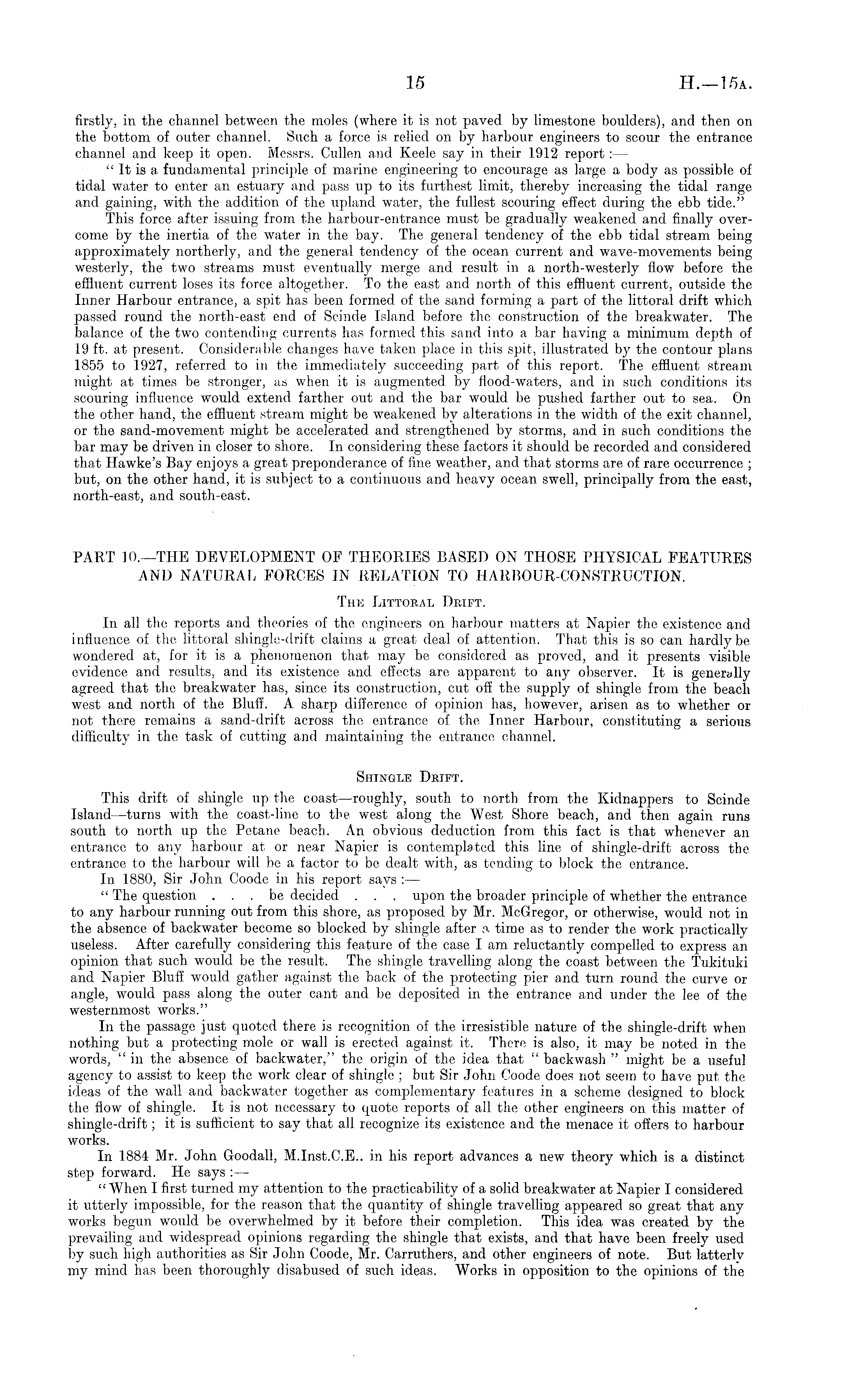 firstly, in the channel between the moles (where it is not paved by limestone boulders), and then on the bottom of outer channel. Such a force is relied on by harbour engineers to scour the entrance channel and keep it open. Messrs. Cullen and Keele say in their 1912 report : — " It is a fundamental principle of marine engineering to encourage as large a body as possible of tidal water to enter an estuary and pass up to its furthest limit, thereby increasing the tidal range and gaining, with the addition of the upland water, the fullest scouring effect during the ebb tide." This force after issuing from the harbour-entrance must be gradually weakened and finally overcome by the inertia of the water in the bay. The general tendency of the ebb tidal stream being approximately northerly, and the general tendency of the ocean current and wave-movements being westerly, the two streams must eventually merge and result in a north-westerly flow before the effluent current loses its force altogether. To the east and north of this effluent current, outside the Inner Harbour entrance, a spit has been formed of the sand forming a part of the littoral drift which passed round the north-east end of Scinde Island before the construction of the breakwater. The balance of the two contending currents has formed this sand into a bar having a minimum depth of 19 ft. at present. Considerable changes have taken place in this spit, illustrated by the contour plans 1855 to 1927, referred to in the immediately succeeding part of this report. The effluent stream might at times be stronger, as when it is augmented by flood-waters, and in such conditions its scouring influence would extend farther out and the bar would be pushed farther out to sea. On the other hand, the effluent stream might be weakened by alterations in the width of the exit channel, or the sand-movement might be accelerated and strengthened by storms, and in such conditions the bar may be driven in closer to shore. In considering these factors it should be recorded and considered that Hawke's Bay enjoys a great preponderance of fine weather, and that storms are of rare occurrence ; but, on the other hand, it is subject to a continuous and heavy ocean swell, principally from the east, north-east, and south-east. PART 10.—THE DEVELOPMENT OF THEORIES BASED ON THOSE PHYSICAL FEATURES AND NATURAL FORCES IN RELATION TO HARBOUR-CONSTRUCTION. The Littoral Drift. In all the reports and theories of the engineers on harbour matters at Napier the existence and influence of the littoral shingle-drift claims a great deal of attention. That this is so can hardly be wondered at, for it is a phenomenon that may be considered as proved, and it presents visible evidence and results, and its existence and effects are apparent to any observer. It is generally agreed that the breakwater has, since its construction, cut off the supply of shingle from the beach west and north of the Bluff. A sharp difference of opinion has, however, arisen as to whether or not there remains a sand-drift across the entrance of the Inner Harbour, constituting a serious difficulty in the task of cutting and maintaining the entrance channel. Shingle Drift. This drift of shingle up the coast —roughly, south to north from the Kidnappers to Scinde Island —turns with the coast-line to the west along the West Shore beach, and then again runs south to north up the Petane beach. An obvious deduction from this fact is that whenever an entrance to any harbour at or near Napier is contemplated this line of shingle-drift across the entrance to the harbour will be a factor to be dealt with, as tending to block the entrance. In 1880, Sir John Coode in his report says : — " The question ... be decided . . . upon the broader principle of whether the entrance to any harbour running out from this shore, as proposed by Mr. McGregor, or otherwise, would not in the absence of backwater become so blocked by shingle after a time as to render the work practically useless. After carefully considering this feature of the case lam reluctantly compelled to express an opinion that such would be the result. The shingle travelling along the coast between the Tukituki and Napier Bluff would gather against the back of the protecting pier and turn round the curve or angle, would pass along the outer cant and be deposited in the entrance and under the lee of the westernmost works." In the passage just quoted there is recognition of the irresistible nature of the shingle-drift when nothing but a protecting mole or wall is erected against it. There is also, it may be noted in the words, " in the absence of backwater," the origin of the idea that " backwash " might be a useful agency to assist to keep the work clear of shingle ; but Sir John Coode does not seem to have put the ideas of the wall and backwater together as complementary features in a scheme designed to block the flow of shingle. It is not necessary to quote reports of all the other engineers on this matter of shingle-drift; it is sufficient to say that all recognize its existence and the menace it offers to harbour works. In 1884 Mr. John Goodall, M.lnst.C.E.. in his report advances a new theory which is a distinct step forward. He says : —■ " When I first turned my attention to the practicability of a solid breakwater at Napier I considered it utterly impossible, for the reason that the quantity of shingle travelling appeared so great that any works begun would be overwhelmed by it before their completion. This idea was created by the prevailing and widespread opinions regarding the shingle that exists, and that have been freely used by such high authorities as Sir John Coode, Mr. Carruthers, and other engineers of note. But latterlv my mind has been thoroughly disabused of such ideas. Works in opposition to the opinions of the