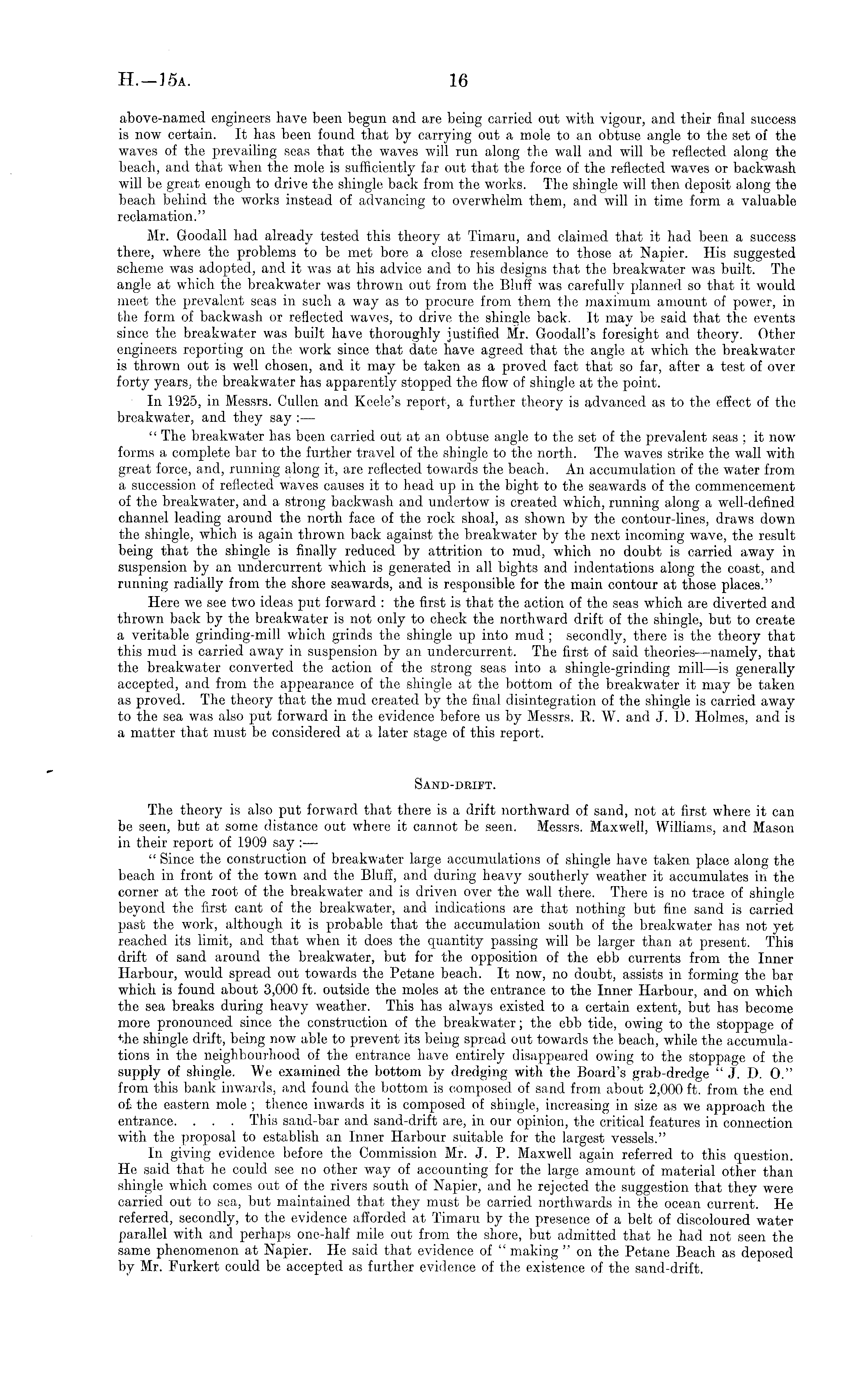 above-named engineers have been begun and are being carried out with vigour, and their final success is now certain. It has been found that by carrying out a mole to an obtuse angle to the set of the waves of the prevailing seas that the waves will run along the wall and will be reflected along the beach, and that when the mole is sufficiently far out that the force of the reflected waves or backwash will be great enough to drive the shingle back from the works. The shingle will then deposit along the beach behind the works instead of advancing to overwhelm them, and will in time form a valuable reclamation." Mr. Goodall had already tested this theory at Timaru, and claimed that it had been a success there, where the problems to be met bore a close resemblance to those at Napier. His suggested scheme was adopted, and it was at his advice and to his designs that the breakwater was built. The angle at which the breakwater was thrown out from the Bluff was carefully planned so that it would meet the prevalent seas in such a way as to procure from them the maximum amount of power, in the form of backwash or reflected waves, to drive the shingle back. It may be said that the events since the breakwater was built have thoroughly justified Mr. Goodall's foresight and theory. Other engineers reporting on the work since that date have agreed that the angle at which the breakwater is thrown out is well chosen, and it may be taken as a proved fact that so far, after a test of over forty years, the breakwater has apparently stopped the flow of shingle at the point. In 1925, in Messrs. Cullen and Keele's report, a further theory is advanced as to the effect of the breakwater, and they say : — " The breakwater has been carried out at an obtuse angle to the set of the prevalent seas ; it now forms a complete bar to the further travel of the shingle to the north. The waves strike the wall with great force, and, running along it, are reflected towards the beach. An accumulation of the water from a succession of reflected waves causes it to head up in the bight to the seawards of the commencement of the breakwater, and a strong backwash and undertow is created which, running along a well-defined channel leading around the north face of the rock shoal, as shown by the contour-lines, draws down the shingle, which is again thrown back against the breakwater by the next incoming wave, the result being that the shingle is finally reduced by attrition to mud, which no doubt is carried away in suspension by an undercurrent which is generated in all bights and indentations along the coast, and running radially from the shore seawards, and is responsible for the main contour at those places." Here we see two ideas put forward : the first is that the action of the seas which are diverted and thrown back by the breakwater is not only to check the northward drift of the shingle, but to create a veritable grinding-mill which grinds the shingle up into mud ; secondly, there is the theory that this mud is carried away in suspension by an undercurrent. The first of said theories—namely, that the breakwater converted the action of the strong seas into a shingle-grinding mill —is generally accepted, and from the appearance of the shingle at the bottom of the breakwater it may be taken as proved. The theory that the mud created by the final disintegration of the shingle is carried away to the sea was also put forward in the evidence before us by Messrs. R. W. and J. D. Holmes, and is a matter that must be considered at a later stage of this report. Sand-drift. The theory is also put forward that there is a drift northward of sand, not at first where it can be seen, but at some distance out where it cannot be seen. Messrs. Maxwell, Williams, and Mason in their report of 1909 say : — " Since the construction of breakwater large accumulations of shingle have taken place along the beach in front of the town and the Blufl, and during heavy southerly weather it accumulates in the corner at the root of the breakwater and is driven over the wall there. There is no trace of shingle beyond the first cant of the breakwater, and indications are that nothing but fine sand is carried past the work, although it is probable that the accumulation south of the breakwater has not yet reached its limit, and that when it does the quantity passing will be larger than at present. This drift of sand around the breakwater, but for the opposition of the ebb currents from the Inner Harbour, would spread out towards the Petane beach. It now, no doubt, assists in forming the bar which is found about 3,000 ft. outside the moles at the entrance to the Inner Harbour, and on which the sea breaks during heavy weather. This has always existed to a certain extent, but has become more pronounced since the construction of the breakwater; the ebb tide, owing to the stoppage of the shingle drift, being now able to prevent its being spread out towards the beach, while the accumulations in the neighbourhood of the entrance have entirely disappeared owing to the stoppage of the supply of shingle. We examined the bottom by dredging with the Board's grab-dredge "J. D. 0." from this bank inwards, and found the bottom is composed of sa.nd from about 2,000 ft. from the end oi the eastern mole ; thence inwards it is composed of shingle, increasing in size as we approach the entrance. . . . This sand-bar and sand-drift are, in our opinion, the critical features in connection with the proposal to establish an Inner Harbour suitable for the largest vessels." In giving evidence before the Commission Mr. J. P. Maxwell again referred to this question. He said that he could see no other way of accounting for the large amount of material other than shingle which comes out of the rivers south of Napier, and he rejected the suggestion that they were carried out to sea, but maintained that they must be carried northwards in the ocean current. He referred, secondly, to the ev