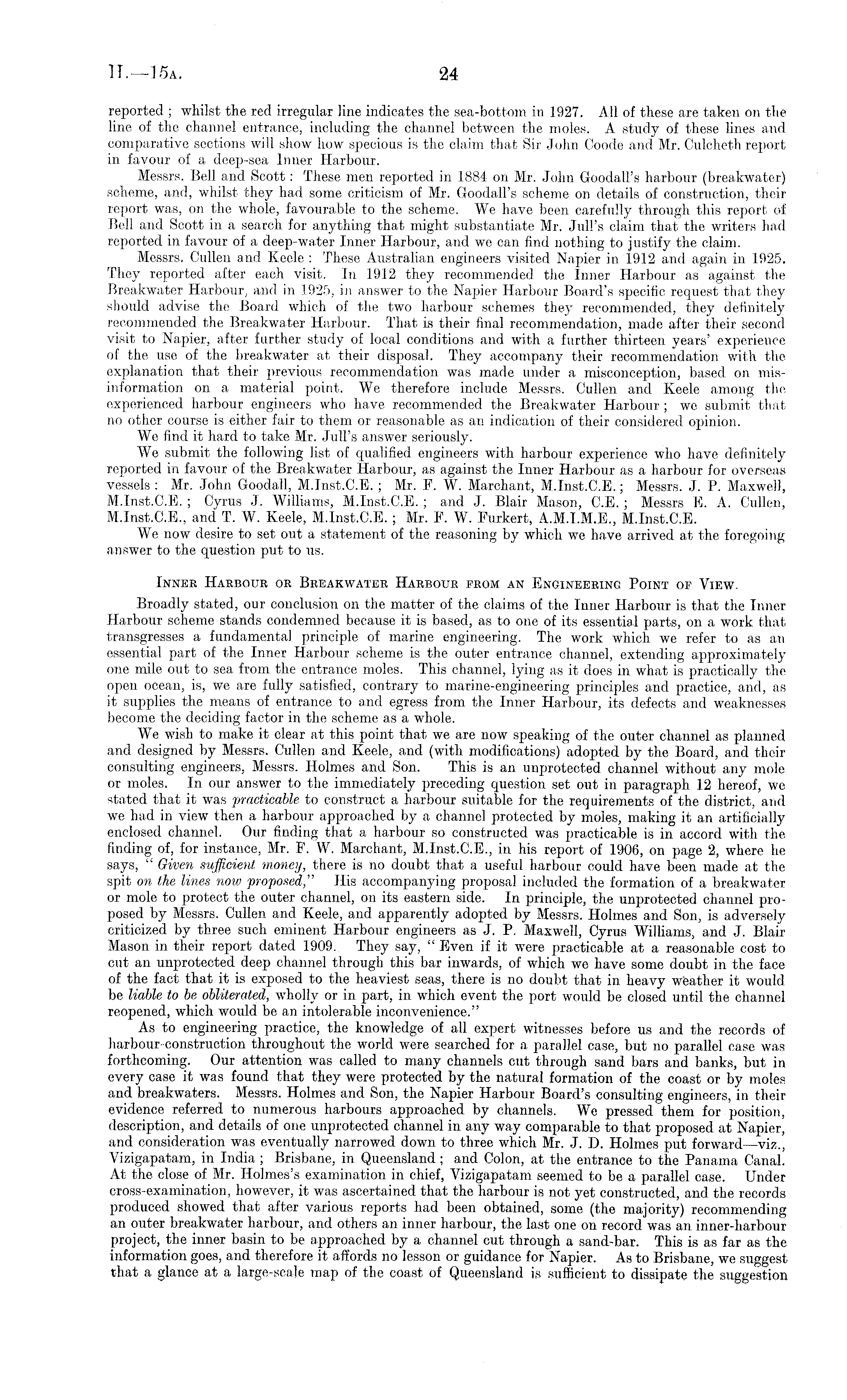 reported ; whilst the red irregular line indicates the sea-bottom in 1927. All of these are taken on the line of the channel entrance, including the channel between the moles. A study of these lines and comparative sections will show how specious is the claim that Sir John Goode and Mr. Culcheth report in favour of a deep-sea Inner Harbour. Messrs. Bell and Scott: These men reported in 1884 on Mr. John Goodall's harbour (breakwater) scheme, and, whilst they had some criticism of Mr. Goodall's scheme on details of construction, their report was, on the whole, favourable to the scheme. We have been carefully through this report of Bell and Scott in a search for anything that might substantiate Mr. Jull's claim that the writers had reported in favour of a deep-water Inner Harbour, and we can find nothing to justify the claim. Messrs. Cullen and Keele : These Australian engineers visited Napier in 1912 and again in 1925. They reported after each visit. In 1912 they recommended the Inner Harbour as against the Breakwater Harbour, and in 1925, in answer to the Napier Harbour Board's specific request that they should advise the Board which of the two harbour schemes they recommended, they definitely recommended the Breakwater Harbour. That is their final recommendation, made after their second visit to Napier, after further study of local conditions and with a further thirteen years' experience of the use of the breakwater at their disposal. They accompany their recommendation with the explanation that their previous recommendation was made under a misconception, based on misinformation on a material point. We therefore include Messrs. Cullen and Keele among the experienced harbour engineers who have recommended the Breakwater Harbour; we submit that no other course is either fair to them or reasonable as an indication of their considered opinion. We find it hard to take Mr. Jull's answer seriously. We submit the following list of qualified engineers with harbour experience who have definitely reported in favour of the Breakwater Harbour, as against the Inner Harbour as a harbour for overseas vessels: Mr. John Goodall, M.lnst.C.E. ; Mr. F. W. Marchant, M.lnst.C.E.; Messrs. J. P. Maxwell, M.lnst.C.E. ; Cyrus J. Williams, M.lnst.C.E. ; and J. Blair Mason, C.E. ; Messrs E. A. Cullen, M.lnst.C.E., and T. W. Keele, M.lnst.C.E. ; Mr. E. W. Eurkert, A.M.1.M.E., M.lnst.C.E. We now desire to set out a statement of the reasoning by which we have arrived at the foregoing answer to the question put to us. Inneb Harbour or Breakwater Harbour from an Engineering Point of View. Broadly stated, our conclusion on the matter of the claims of the Inner Harbour is that the Inner Harbour scheme stands condemned because it is based, as to one of its essential parts, on a work that transgresses a fundamental principle of marine engineering. The work which we refer to as an essential part of the Inner Harbour scheme is the outer entrance channel, extending approximately one mile out to sea from the entrance moles. This channel, lying as it does in what is practically the open ocean, is, we are fully satisfied, contrary to marine-engineering principles and practice, and, as it supplies the means of entrance to and egress from the Inner Harbour, its defects and weaknesses become the deciding factor in the scheme as a whole. We wish to make it clear at this point that we are now speaking of the outer channel as planned and designed by Messrs. Cullen and Keele, and (with modifications) adopted by the Board, and their consulting engineers, Messrs. Holmes and Son. This is an unprotected channel without any mole or moles. In our answer to the immediately preceding question set out in paragraph 12 hereof, we stated that it was -practicable to construct a harbour suitable for the requirements of the district, and we had in view then a harbour approached by a channel protected by moles, making it an artificially enclosed channel. Our finding that a harbour so constructed was practicable is in accord with the finding of, for instance, Mr. F. W. Marchant, M.lnst.C.E., in his report of 1906, on page 2, where he says, " Given sufficient money, there is no doubt that a useful harbour could have been made at the spit on the lines now proposed," His accompanying proposal included the formation of a breakwater or mole to protect the outer channel, on its eastern side. In principle, the unprotected channel proposed by Messrs. Cullen and Keele, and apparently adopted by Messrs. Holmes and Son, is adversely criticized by three such eminent Harbour engineers as J. P. Maxwell, Cyrus Williams, and J. Blair Mason in their report dated 1909. They say, "Even if it were practicable at a reasonable cost to cut an unprotected deep channel through this bar inwards, of which we have some doubt in the face of the fact that it is exposed to the heaviest seas, there is no doubt that in heavy wfeather it would be liable to be obliterated, wholly or in part, in which event the port would be closed until the channel reopened, which would be an intolerable inconvenience." As to engineering practice, the knowledge of all expert witnesses before us and the records of harbour-construction throughout the world were searched for a parallel case, but no parallel case was forthcoming. Our attention was called to many channels cut through sand bars and banks, but in every case it was found that they were protected by the natural formation of the coast or by moles and breakwaters. Messrs. Holmes and Son, the Napier Harbour Board's consulting engineers, in their evidence referred to numerous harbours approached by channels. We pressed them for position, description, and details of one unprotected channel in any way comparable to that proposed at Napier, and consideration was eventually narrowed down to three which Mr. J. D. Holmes put forward —viz., Vizigapatam, in India ; Brisbane, in Queensland ; and Colon, at the entrance to the Panama Canal. At the close of Mr