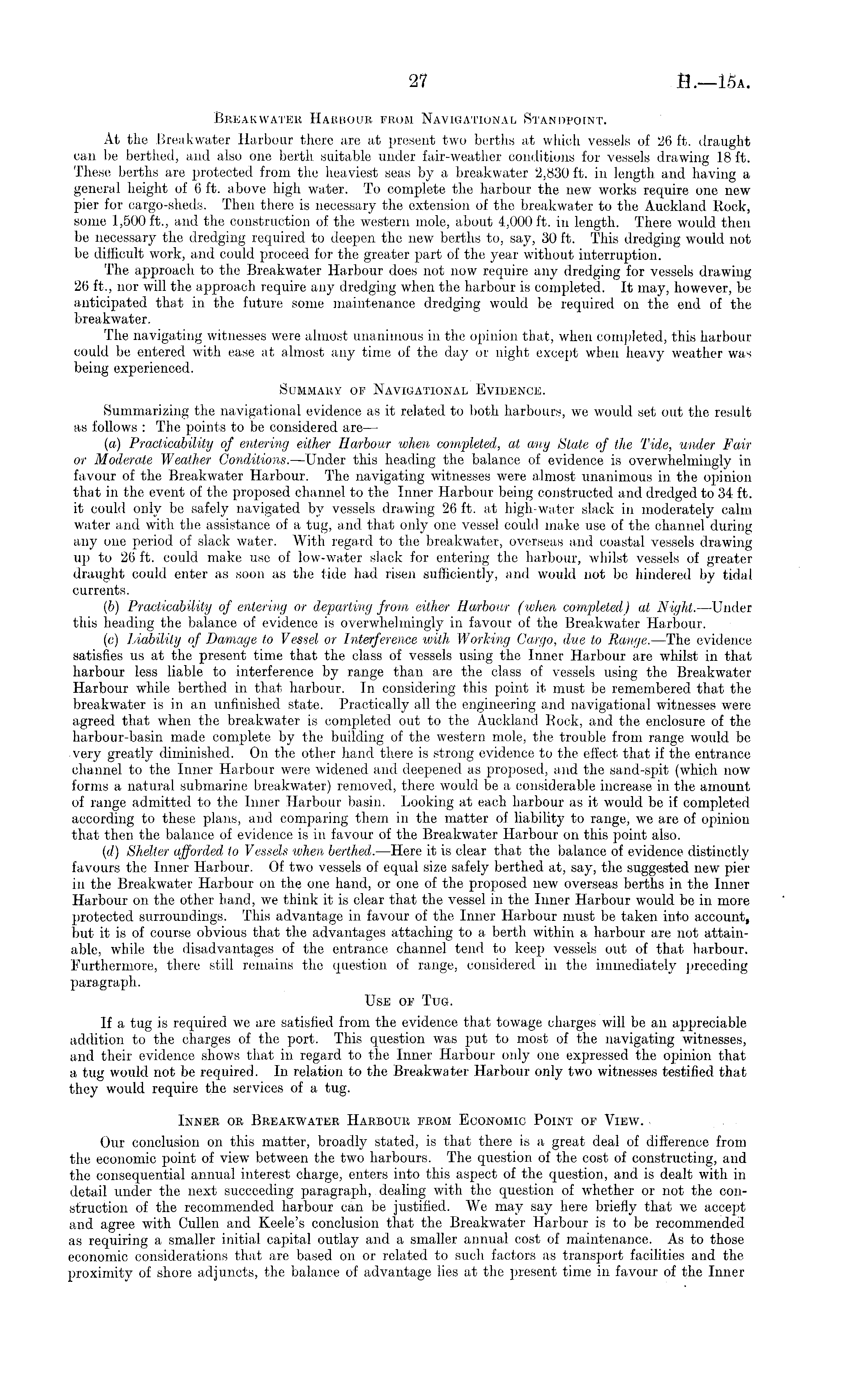 Breakwater Harbour from Navigational Standpoint. At the Breakwater Harbour there ;ire at present two berths at which vessels of 26 ft. draught can be berthed, and also one berth suitable under fair-weather conditions for vessels drawing 18 ft. These berths are protected from the heaviest seas by a breakwater 2,830 ft. in length and having a general height of 6 ft. above high water. To complete the harbour the new works require one new pier for cargo-sheds. Then there is necessary the extension of the breakwater to the Auckland Kock, some 1,500 ft., and the construction of the western mole, about 4,000 ft. in length. There would then be necessary the dredging required to deepen the new berths to, say, 30 ft. This dredging would not be difficult work, and could proceed for the greater part of the year without interruption. The approach to the Breakwater Harbour does not now require any dredging for vessels drawing 26 ft., nor will the approach require any dredging when the harbour is completed. It may, however, be anticipated that in the future some maintenance dredging would be required on the end of the breakwater. The navigating witnesses were almost unanimous in the opinion that, when completed, this harbour could be entered with ease at almost any time of the day or night except when heavy weather was being experienced. Summary of Navigational Evidence. Summarizing the navigational evidence as it related to both harbours, we would set out the result as follows : The points to be considered are — (a) Practicability of entering either Harbour when completed, at any State of the Tide, under Fair or Moderate Weather Conditions.—Under this heading the balance of evidence is overwhelmingly in favour of the Breakwater Harbour. The navigating witnesses were almost unanimous in the opinion that in the event of the proposed channel to the Inner Harbour being constructed and dredged to 34 ft. it could only be safely navigated by vessels drawing 26 ft. at high-water slack in moderately calm water and with the assistance of a tug, and that only one vessel could make use of the channel during any one period of slack water. With regard to the breakwater, overseas and coastal vessels drawing up to 26 ft. could make use of low-water slack for entering the harbour, whilst vessels of greater draught could enter as soon as the tide had risen sufficiently, and would not be hindered by tidal currents. (b) Practicability of entering or departing from either Harbour (when completed) at Night.—Under this heading the balance of evidence is overwhelmingly in favour of the Breakwater Harbour. (c) Liability of Damage to Vessel or Interference with Working Cargo, due to Range.—The evidence satisfies us at the present time that the class of vessels using the Inner Harbour are whilst in that harbour less liable to interference by range than are the class of vessels using the Breakwater Harbour while berthed in that harbour. In considering this point it must be remembered that the breakwater is in an unfinished state. Practically all the engineering and navigational witnesses were agreed that when the breakwater is completed out to the Auckland Rock, and the enclosure of the harbour-basin made complete by the building of the western mole, the trouble from range would be very greatly diminished. On the other hand there is strong evidence to the effect that if the entrance channel to the Inner Harbour were widened and deepened as proposed, and the sand-spit (which now forms a natural submarine breakwater) removed, there would be a considerable increase in the amount of range admitted to the Inner Harbour basin. Looking at each harbour as it would be if completed according to these plans, and comparing them in the matter of liability to range, we are of opinion that then the balance of evidence is in favour of the Breakwater Harbour on this point also. (d) Shelter afforded to Vessels when berthed. —Here it is clear that the balance of evidence distinctly favours the Inner Harbour. Of two vessels of equal size safely berthed at, say, the suggested new pier in the Breakwater Harbour on the one hand, or one of the proposed new overseas berths in the Inner Harbour on the other hand, we think it is clear that the vessel in the Inner Harbour would be in more protected surroundings. This advantage in favour of the Inner Harbour must be taken into account, but it is of course obvious that the advantages attaching to a berth within a harbour are not attainable, while the disadvantages of the entrance channel tend to keep vessels out of that harbour. Furthermore, there still remains the question of range, considered in the immediately preceding paragraph. Use of Tug. If a tug is required we are satisfied from the evidence that towage charges will be an appreciable addition to the charges of the port. This question was put to most of the navigating witnesses, and their evidence shows that in regard to the Inner Harbour only one expressed the opinion that a tug would not be required. In relation to the Breakwater Harbour only two witnesses testified that they would require the services of a tug. Inner or Breakwater Harbour from Economic Point of View. Our conclusion on this matter, broadly stated, is that there is a great deal of difference from the economic point of view between the two harbours. The question of the cost of constructing, and the consequential annual interest charge, enters into this aspect of the question, and is dealt with in detail under the next succeeding paragraph, dealing with the question of whether or not the construction of the recommended harbour can be justified. We may say here briefly that we accept and agree with Cullen and Keele's conclusion that the Breakwater Harbour is to be recommended as requiring a smaller initial capital outlay and a smaller annual cost of maintenance. As to those economic considerations that are based on or related to such factors as transport facilities and the pr