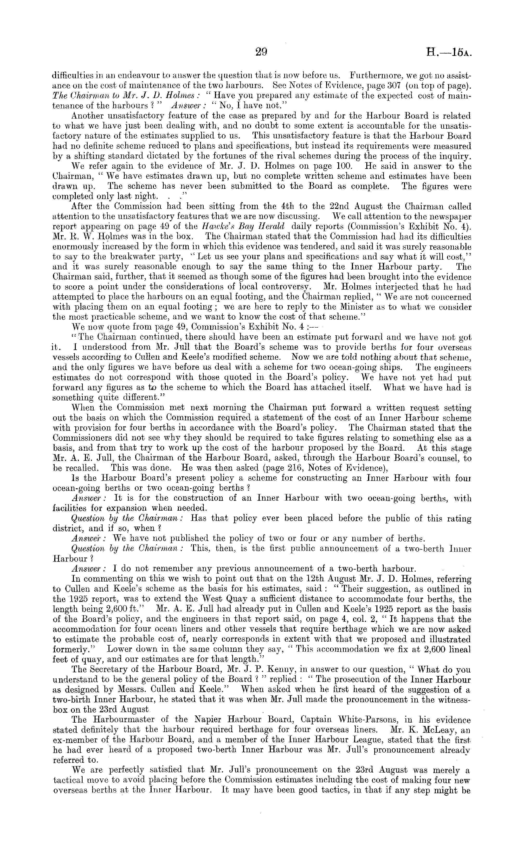 difficulties in an endeavour to answer the question that is now before us. Furthermore, we got 110 assistance on the cost of maintenance of the two harbours. See Notes of Evidence, page 307 (on top of page). The Chairman to Mr. J. D. Holmes : " Have you prepared any estimate of the expected cost of maintenance of the harbours ? " Answer : " No, I have not." Another unsatisfactory feature of the case as prepared by and for the Harbour Board is related to what we have just been dealing with, and no doubt to some extent is accountable for the unsatisfactory nature of the estimates supplied to us. This unsatisfactory feature is that the Harbour Board had no definite scheme reduced to plans and specifications, but instead its requirements were measured by a shifting standard dictated by the fortunes of the rival schemes during the process of the inquiry. We refer again to the evidence of Mr. J. D. Holmes 011 page 100. He said in answer to the Chairman, " We have estimates drawn up, but no complete written scheme and estimates have been drawn up. The scheme has never been submitted to the Board as complete. The figures were completed only last night. . ." After the Commission had been sitting from the 4th to the 22nd August the Chairman called attention to the unsatisfactory features that we are now discussing. We call attention to the newspaper report appearing on page 49 of the Haivke's Bay Herald daily reports (Commission's Exhibit No. 4). Mr. R. W. Holmes was in the box. The Chairman stated that the Commission had had its difficulties enormously increased by the form in which this evidence was tendered, and said it was surely reasonable to say to the breakwater party, " Let us see your plans and specifications and say what it will cost," and it was surely reasonable enough to say the same thing to the Inner Harbour party. The Chairman said, further, that it seemed as though some of the figures had been brought into the evidence to score a point under the considerations of local controversy. Mr. Holmes interjected that he had attempted to place the harbours on an equal footing, and the Chairman replied, " We are not concerned with placing them on an equal footing ; we are here to reply to the Minister as to what we consider the most practicable scheme, and we want to know the cost of that scheme." We now quote from page 49, Commission's Exhibit No. 4 : — The Chairman continued, there should have been an estimate put forward and we have not got it. I understood from Mr. Jull that the Board's scheme was to provide berths for four overseas vessels according to Cullen and Keele's modified scheme. Now we are told nothing about that scheme, and the only figures we have before us deal with a scheme for two ocean-going ships. The engineers estimates do not correspond with those quoted in the Board's policy. We have not vet had put forward any figures as to the scheme to which the Board has attached itself. What we have had is something quite different." When the Commission met next morning the Chairman put forward a written request setting out the basis on which the Commission required a statement of the cost of an Inner Harbour scheme with provision for four berths in accordance with the Board's policy. The Chairman stated that the Commissioners did not see why they should be required to take figures relating to something else as a basis, and from that try to work up the cost of the harbour proposed by the Board. At this stage Mr. A. E. Jull, the Chairman of the Harbour Board, asked, through the Harbour Board's counsel, to be recalled. This was done. He was then asked (page 216, Notes of Evidence), Is the Harbour Board's present policy a scheme for constructing an Inner Harbour with four ocean-going berths or two ocean-going berths ? Answer : It is for the construction of an Inner Harbour with two ocean-going berths, with facilities for expansion when needed. Question by the Chairman: Has that policy ever been placed before the public of this rating district, and if so, when ? Answer : We have not published the policy of two or four or any number of berths. Question by the Chairman : This, then, is the first public announcement of a two-berth Inner Harbour 1 Answer: Ido not remember any previous announcement of a two-berth harbour. In commenting on this we wish to point out that on the 12th August Mr. J. D. Holmes, referring to Cullen and Keele's scheme as the basis for his estimates, said : " Their suggestion, as outlined in the 1925 rej)ort, was to extend the West Quay a sufficient distance to accommodate four berths, the length being 2,600 ft." Mr. A. E. Jull had already put in Cullen and Keele's 1925 report as the basis of the Board's policy, and the engineers in that report said, on page 4, col. 2, " It happens that the accommodation for four ocean liners and other vessels that require berthage which we are now asked to estimate the probable cost of, nearly corresponds in extent with that we proposed and illustrated formerly." Lower down in the same column they say, " This accommodation we fix at 2,600 lineal feet of quay, and our estimates are for that length." The Secretary of the Harbour Board, Mr. J. P. Kenny, in answer to our question, " What do you understand to be the general policy of the Board ? " replied : " The prosecution of the Inner Harbour as designed by Messrs. Cullen and Keele." When asked when he first heard of the suggestion of a two-birth Inner Harbour, he stated that it was when Mr. Jull made the pronouncement in the witnessbox on the 23rd August The Harbourmaster of the Napier Harbour Board, Captain White-Parsons, in his evidence stated definitely that the harbour required berthage for four overseas liners. Mr. K. McLeay, an ex-member of the Harbour Board, and a member of the Inner Harbour League, stated that the first he had ever heard of a proposed two-berth Inner Harbour was Mr. Jull's pronouncement alreadv referred to. We are perfectly satisfied that Mr. Jull's pro