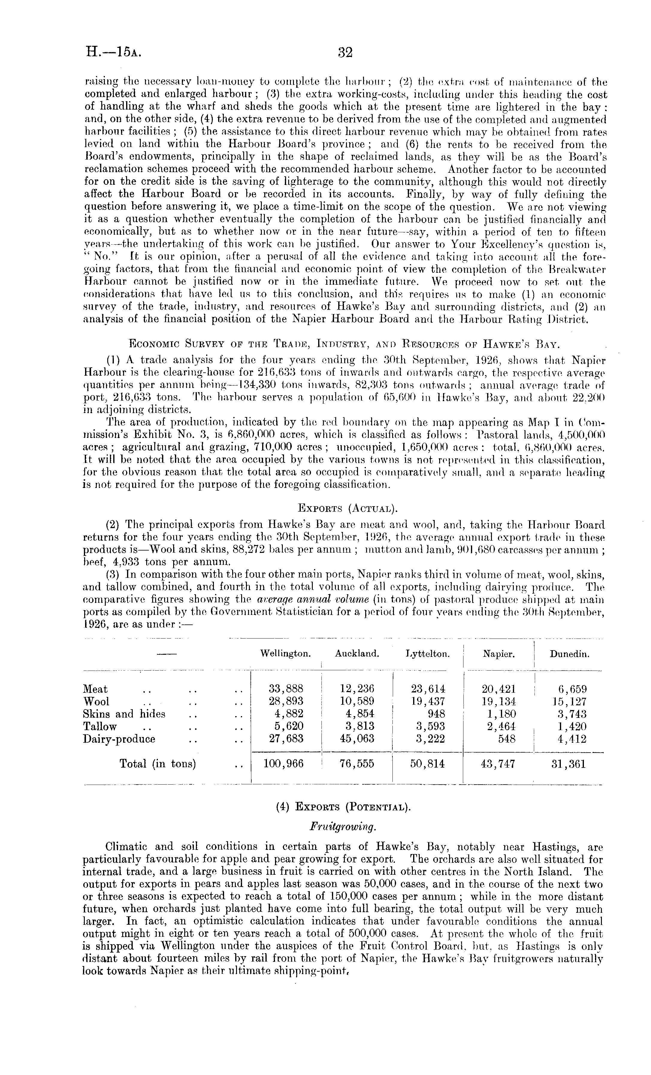 raising the necessary loan-money to complete the harbour ; (2) the extra cost of maintenance of the completed and enlarged harbour ; (3) the extra working-costs, including under this heading the cost of handling at the wharf and sheds the goods which at the present time are lightered in the bay : and, on the other side, (4) the extra revenue to be derived from the use of the completed and augmented harbour facilities ; (5) the assistance to this direct harbour revenue which may be obtained from rates levied on land within the Harbour Board's province ; and (6) the rents to be received from the Board's endowments, principally in the shape of reclaimed lands, as they will be as the Board's reclamation schemes proceed with the recommended harbour scheme. Another factor to be accounted for on the credit side is the saving of lighterage to the community, although this would not directly affect the Harbour Board or be recorded in its accounts. Finally, by way of fully defining the question before answering it, we place a time-limit on the scope of the question. We are not viewing it as a question whether eventually the completion of the harbour can be justified financially and economically, but as to whether now or in the near future —say, within a period of ten to fifteen years —the undertaking of this work can be justified. Our answer to Your Excellency's question is, " No." It is our opinion, after a perusal of all the evidence and taking into account all the foregoing factors, that from the financial and economic point of view the completion of the Breakwater Harbour cannot be justified now or in the immediate future. We proceed now to set out the considerations that have led us to this conclusion, and this requires us to make (1) an economic survey of the trade, industry, and resources of Hawke's Bay and surrounding districts, and (2) an analysis of the financial position of the Napier Harbour Board and the Harbour Rating District. Economic Survey op the Trade, Industry, and E,esources op Hawke's Bay. (1) A trade analysis for the four years ending the 30th September, 1926, shows that Napier Harbour is the clearing-house for 216,633 tons of inwards and outwards cargo, the respective average quantities per annum being —134,330 tons inwards, 82,303 tons outwards ; annual average trade of port, 216,633 tons. The harbour serves a population of 65,600 in Hawke's Bay, and about 22.200 in adjoining districts. The area of production, indicated by the red boundary on the map appearing as Map I in Commission's Exhibit No. 3, is 6,860,000 acres, which is classified as follows : Pastoral lands, 4,500,000 acres ; agricultural and grazing, 710,000 acres; unoccupied, 1,650,000 acres : total, 6,860,000 acres. It will be noted that the area occupied by the various towns is not represented in this classification, for the obvious reason that the total area so occupied is comparatively small, and a separate heading is not required for the purpose of the foregoing classification. Exports (Actual). (2) The principal exports from Hawke's Bay are meat and wool, and, taking the Harbour Board returns for the four years ending the 30th September, 1926, the average annual export trade in these products is—Wool and skins, 88,272 bales per annum ; mutton and lamb, 901,680 carcasses per annum ; beef, 4,933 tons per annum. (3) In comparison with the four other main ports, Napier ranks third in volume of meat, wool, skins, and tallow combined, and fourth in the total volume of all exports, including dairying produce. The comparative figures showing the average annual volume (in tons) of pastoral produce shipped at main ports as compiled by the Government Statistician for a period of four years ending the 30th September, 1926, are as under : —