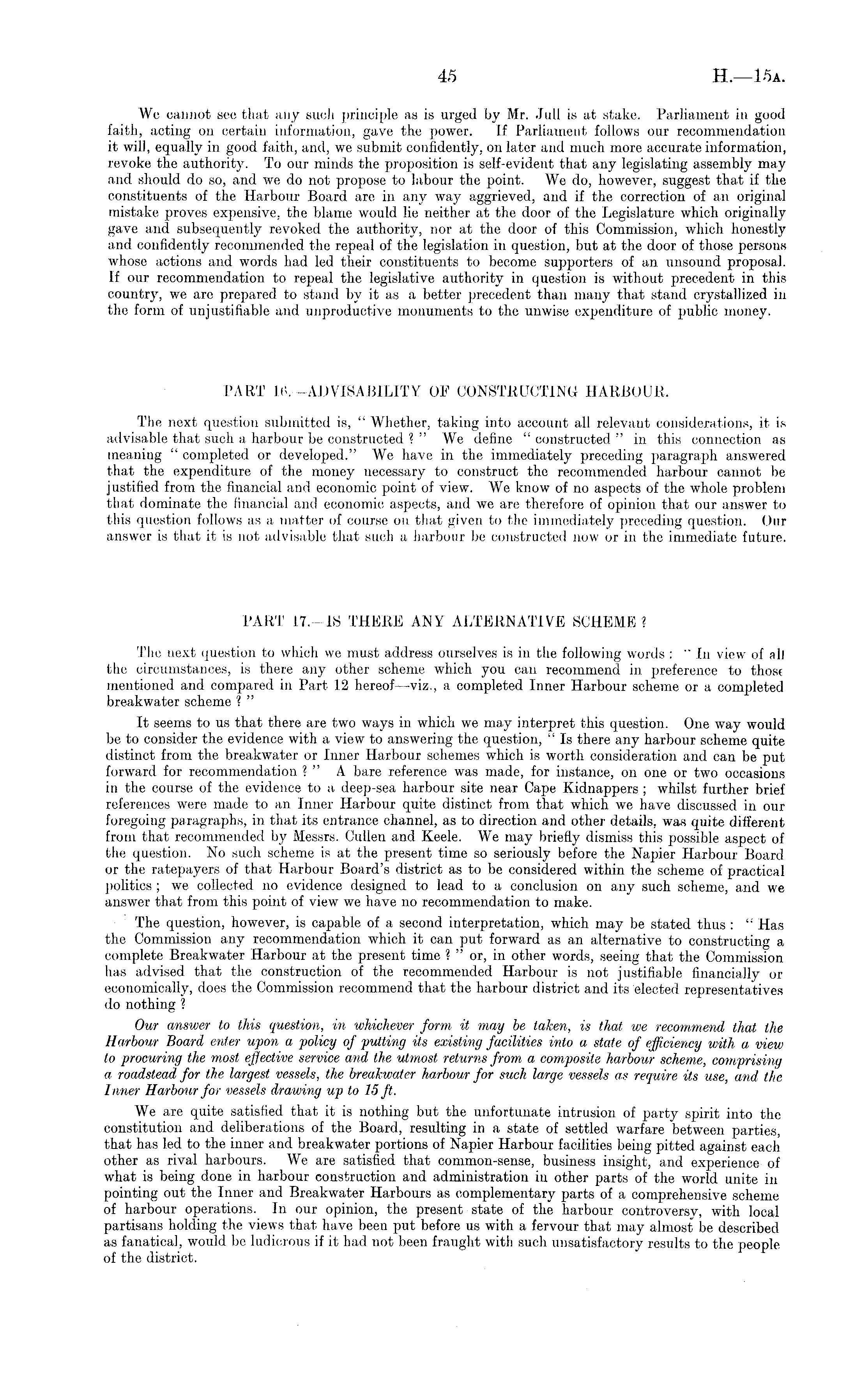 We cannot see that any such principle as is urged by Mr. Jull is at stake. Parliament in good faith, acting on certain information, gave the power. If Parliament follows our recommendation it will, equally in good faith, and, we submit confidently, on later and much more accurate information, revoke the authority. To our minds the proposition is self-evident that any legislating assembly may and should do so, and we do not propose to labour the point. We do, however, suggest that if the constituents of the Harbour Board are in any way aggrieved, and if the correction of an original mistake proves expensive, the blame would lie neither at the door of the Legislature which originally gave and subsequently revoked the authority, nor at the door of this Commission, which honestly and confidently recommended the repeal of the legislation in question, but at the door of those persons whose actions and words had led their constituents to become supporters of an unsound proposal. If our recommendation to repeal the legislative authority in question is without precedent in this country, we are prepared to stand by it as a better precedent than many that stand crystallized in the form of unjustifiable and unproductive monuments to the unwise expenditure of public money. PART 10. —ADVISABILITY OF CONSTRUCTING HARBOUR. The next question submitted is, " Whether, taking into account all relevant considerations, it is advisable that such a harbour be constructed ? " We define " constructed " in this connection as meaning " completed or developed." We have in the immediately preceding paragraph answered that the expenditure of the money necessary to construct the recommended harbour cannot be justified from the financial and economic point of view. We know of no aspects of the whole problem that dominate the financial and economic aspects, and we are therefore of opinion that our answer to this question follows as a matter of course 011 that given to the immediately preceding question. Our answer is that it is not advisable that such a harbour be constructed now or in the immediate future. PART 17.— IS THERE ANY ALTERNATIVE SCHEME? The next question to which we must address ourselves is in the following words : "In view of all the circumstances, is there any other scheme which you can recommend in preference to those mentioned and compared in Part 12 hereof—viz., a completed Inner Harbour scheme or a completed breakwater scheme ? " It seems to us that there are two ways in which we may interpret this question. One way would be to consider the evidence with a view to answering the question, " Is there any harbour scheme quite distinct from the breakwater or Inner Harbour schemes which is worth consideration and can be put forward for recommendation ? " A bare reference was made, for instance, on one or two occasions in the course of the evidence to a deep-sea harbour site near Cape Kidnappers; whilst further brief references were made to an Inner Harbour quite distinct from that which we have discussed in our foregoing paragraphs, in that its entrance channel, as to direction and other details, was quite different from that recommended by Messrs. Cullen and Keele. We may briefly dismiss this possible aspect of the question. No such scheme is at the present time so seriously before the Napier Harbour Board or the ratepayers of that Harbour Board's district as to be considered within the scheme of practical politics ; we collected no evidence designed to lead to a conclusion on any such scheme, and we answer that from this point of view we have no recommendation to make. The question, however, is capable of a second interpretation, which may be stated thus : " Has the Commission any recommendation which it can put forward as an alternative to constructing a complete Breakwater Harbour at the present time \ " or, in other words, seeing that the Commission has advised that the construction of the recommended Harbour is not justifiable financially or economically, does the Commission recommend that the harbour district and its elected representatives do nothing ? Our answer to this question, in whichever form it may be taken, is that we recommend that the Harbour Board enter upon a policy of putting its existing facilities into a state of efficiency with a view to procuring the most effective service and the utmost returns from a composite harbour scheme, comprising a roadstead for the largest vessels, the breakwater harbour for such large vessels as require its use, and the Inner Harbour for vessels drawing up to 15 ft. We are quite satisfied that it is nothing but the unfortunate intrusion of party spirit into the constitution and deliberations of the Board, resulting in a state of settled warfare between parties, that has led to the inner and breakwater portions of Napier Harbour facilities being pitted against each other as rival harbours. We are satisfied that common-sense, business insight, and experience of what is being done in harbour construction and administration in other parts of the world unite in pointing out the Inner and Breakwater Harbours as complementary parts of a comprehensive scheme of harbour operations. In our opinion, the present state of the harbour controversy, with local partisans holding the views that have been put before us with a fervour that may almost be described as fanatical, would be ludicrous if it had not been fraught witli such unsatisfactory results to the people of the district.