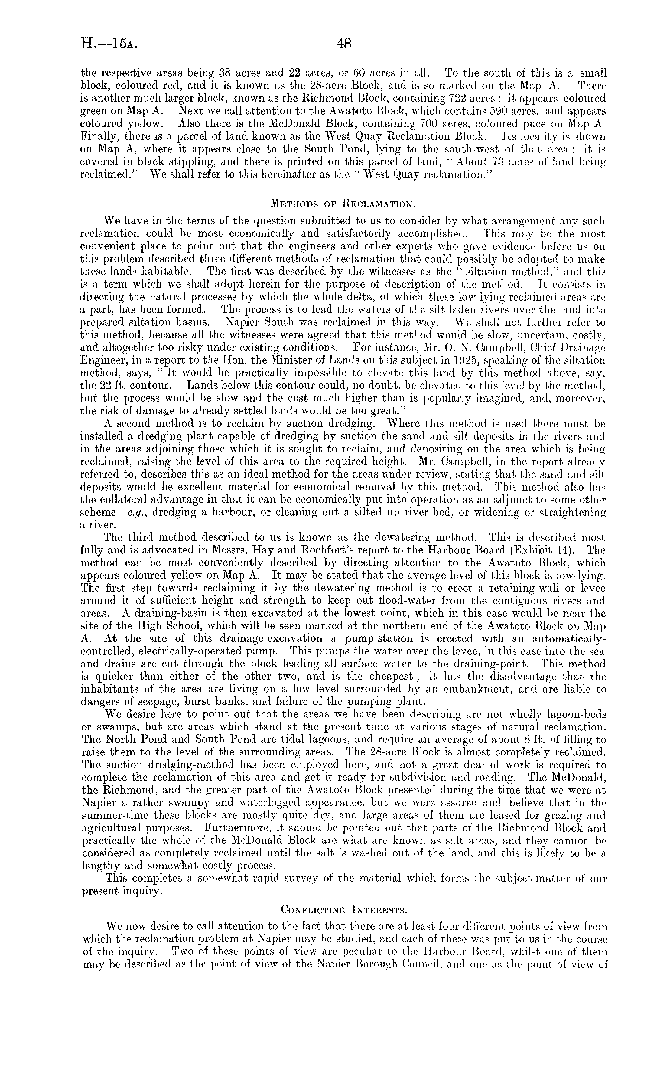 the respective areas being 38 acres and 22 acres, or 60 acres in all. To the south of this is a small block, coloured red, and it is known as the 28-acre Block, and is so marked on the Map A. There is another much larger block, known as the Richmond Block, containing 722 acres ; it appears coloured green on Map A. Next we call attention to the Awatoto Block, which contains 590 acres, and appears coloured yellow. Also there is the McDonald Block, containing 700 acres, coloured puce on Map A Finally, there is a parcel of land known as the West Quay Reclamation Block. Its locality is shown on Map A, where it appears close to the South Pond, lying to the south-west of that area ; it is covered in black stippling, and there is printed on this parcel of land, " About 73 acres of land being reclaimed." We shall refer to this hereinafter as the " West Quay reclamation." Methods of Reclamation. We have in the terms of the question submitted to us to consider by what arrangement any such reclamation could be most economically and satisfactorily accomplished. This may be the most convenient place to point out that the engineers and other experts who gave evidence before us on this problem described three different methods of reclamation that could possibly be adopted to make these lands habitable. The first was described by the witnesses as the " siltation method," and this is a term which we shall adopt herein for the purpose of description of the method. It consists in directing the natural processes by which the whole delta, of which these low-lying reclaimed areas are a part, has been formed. The process is to lead the waters of the silt-laden rivers over the land into prepared siltation basins. Napier South was reclaimed in this way. We shall not further refer to this method, because all the witnesses were agreed that this method would be slow, uncertain, costly, and altogether too risky under existing conditions. For instance, Mr. 0. N. Campbell, Chief Drainage Engineer, in a report to the Hon. the Minister of Lands on this subject in 1925, speaking of the siltation method, says, " It would be practically impossible to elevate this land by this method above, say, the 22 ft. contour. Lands below this contour could, no doubt, be elevated to this level by the method, but the process would be slow and the cost much higher than is popularly imagined, and, moreover, the risk of damage to already settled lands would be too great." A second method is to reclaim by suction dredging. Where this method is used there must be installed a dredging plant capable of dredging by suction the sand and silt deposits in the rivers and in the areas adjoining those which it is sought to reclaim, and depositing on the area which is being reclaimed, raising the level of this area to the required height. Mr. Campbell, in the report already referred to, describes this as an ideal method for the areas under review, stating that the sand and siltdeposits would be excellent material for economical removal by this method. This method also has the collateral advantage in that it can be economically put into operation as an adjunct to some other scheme—e.g., dredging a harbour, or cleaning out a silted up river-bed, or widening or straightening a river. The third method described to us is known as the dewatering method. This is described most fully and is advocated in Messrs. Hay and Rochfort's report to the Harbour Board (Exhibit 44). The method can be most conveniently described by directing attention to the Awatoto Block, which appears coloured yellow on Map A. It may be stated that the average level of this block is low-lying. The first step towards reclaiming it by the dewatering method is to erect a retaining-wall or levee around it of sufficient height and strength to keep out flood-water from the contiguous rivers and areas. A draining-basin is then excavated at the lowest point, which in this case would be near the site of the High School, which will be seen marked at the northern end of the Awatoto Block on Map A. At the site of this drainage-excavation a pump-station is erected with an automaticallycontrolled, electrically-operated pump. This pumps the water over the levee, in this case into the sea and drains are cut through the block leading all surface water to the draining-point. This method is quicker than either of the other two, and is the cheapest; it has the disadvantage that the inhabitants of the area are living on a low level surrounded by an embankment, and are liable to dangers of seepage, burst banks, and failure of the pumping plant. We desire here to point out that the areas we have been describing are not wholly lagoon-beds or swamps, but are areas which stand at the present time at various stages of natural reclamation. The North Pond and South Pond are tidal lagoons, and require an average of about 8 ft. of filling to raise them to the level of the surrounding areas. The 28-acre Block is almost completely reclaimed. The suction dredging-method has been employed here, and not a great deal of work is required to complete the reclamation of this area and get it ready for subdivision and roading. The McDonald, the Richmond, and the greater part of the Awatoto Block presented during the time that we were at Napier a rather swampy and waterlogged appearance, but we were assured and believe that in the summer-time these blocks are mostly quite dry, and large areas of them are leased for grazing and agricultural purposes. Furthermore, it should be pointed out that parts of the Richmond Block and practically the whole of the McDonald Block are what are known as salt areas, and they cannot be considered as completely reclaimed until the salt is washed out of the land, and this is likely to be a lengthy and somewhat costly process. This completes a somewhat rapid survey of the material which forms the subject-matter of our present inquiry. Con fijcting Interests. We now desire to call attention to the f