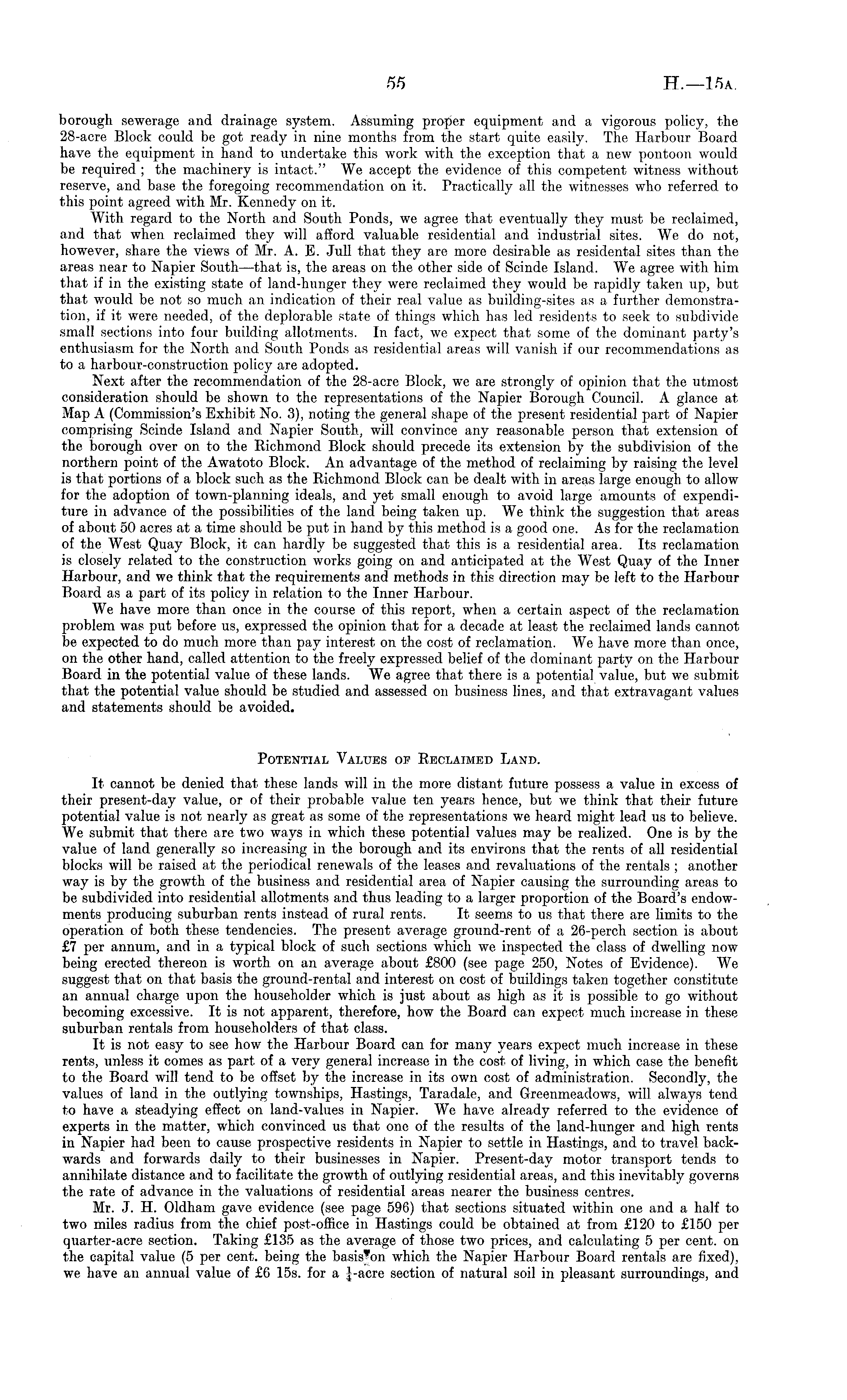 borough sewerage and drainage system. Assuming proper equipment and a vigorous policy, the 28-acre Block could be got ready in nine months from the start quite easily. The Harbour Board have the equipment in hand to undertake this work with the exception that a new pontoon would be required ; the machinery is intact." We accept the evidence of this competent witness without reserve, and base the foregoing recommendation on it. Practically all the witnesses who referred to this point agreed with Mr. Kennedy on it. With regard to the North and South Ponds, we agree that eventually they must be reclaimed, and that when reclaimed they will afford valuable residential and industrial sites. We do not, however, share the views of Mr. A. E. Jull that they are more desirable as residental sites than the areas near to Napier South—that is, the areas on the other side of Scinde Island. We agree with him that if in the existing state of land-hunger they were reclaimed they would be rapidly taken up, but that would be not so much an indication of their real value as building-sites as a further demonstration, if it were needed, of the deplorable state of things which has led residents to seek to subdivide small sections into four building allotments. In fact, we expect that some of the dominant party's enthusiasm for the North and South Ponds as residential areas will vanish if our recommendations as to a harbour-construction policy are adopted. Next after the recommendation of the 28-acre Block, we are strongly of opinion that the utmost consideration should be shown to the representations of the Napier Borough Council. A glance at Map A (Commission's Exhibit No. 3), noting the general shape of the present residential part of Napier comprising Scinde Island and Napier South, will convince any reasonable person that extension of the borough over on to the Richmond Block should precede its extension by the subdivision of the northern point of the Awatoto Block. An advantage of the method of reclaiming by raising the level is that portions of a block such as the Richmond Block can be dealt with in areas large enough to allow for the adoption of town-planning ideals, and yet small enough to avoid large amounts of expenditure in advance of the possibilities of the land being taken up. We think the suggestion that areas of about 50 acres at a time should be put in hand by this method is a good one. As for the reclamation of the West Quay Block, it can hardly be suggested that this is a residential area. Its reclamation is closely related to the construction works going on and anticipated at the West Quay of the Inner Harbour, and we think that the requirements and methods in this direction may be left to the Harbour Board as a part of its policy in relation to the Inner Harbour. We have more than once in the course of this report, when a certain aspect of the reclamation problem was put before us, expressed the opinion that for a decade at least the reclaimed lands cannot be expected to do much more than pay interest on the cost of reclamation. We have more than once, on the other hand, called attention to the freely expressed belief of the dominant party on the Harbour Board in the potential value of these lands. We agree that there is a potential value, but we submit that the potential value should be studied and assessed on business lines, and that extravagant values and statements should be avoided. Potential Values op Reclaimed Land. It cannot be denied that these lands will in the more distant future possess a value in excess of their present-day value, or of their probable value ten years hence, but we think that their future potential value is not nearly as great as some of the representations we heard might lead us to believe. We submit that there are two ways in which these potential values may be realized. One is by the value of land generally so increasing in the borough and its environs that the rents of all residential blocks will be raised at the periodical renewals of the leases and revaluations of the rentals ; another way is by the growth of the business and residential area of Napier causing the surrounding areas to be subdivided into residential allotments and thus leading to a larger proportion of the Board's endowments producing suburban rents instead of rural rents. It seems to us that there are limits to the operation of both these tendencies. The present average ground-rent of a 26-perch section is about £7 per annum, and in a typical block of such sections which we inspected the class of dwelling now being erected thereon is worth on an average about £800 (see page 250, Notes of Evidence). We suggest that on that basis the ground-rental and interest on cost of buildings taken together constitute an annual charge upon the householder which is just about as high as it is possible to go without becoming excessive. It is not apparent, therefore, how the Board can expect much increase in these suburban rentals from householders of that class. It is not easy to see how the Harbour Board can for many years expect much increase in these rents, unless it comes as part of a very general increase in the cost of living, in which case the benefit to the Board will tend to be offset by the increase in its own cost of administration. Secondly, the values of land in the outlying townships, Hastings, Taradale, and Greenmeadows, will always tend to have a steadying effect on land-values in Napier. We have already referred to the evidence of experts in the matter, which convinced us that one of the results of the land-hunger and high rents in Napier had been to cause prospective residents in Napier to settle in Hastings, and to travel backwards and forwards daily to their businesses in Napier. Present-day motor transport tends to annihilate distance and to facilitate the growth of outlying residential areas, and this inevitably governs the rate of advance in the valuations of residential areas n