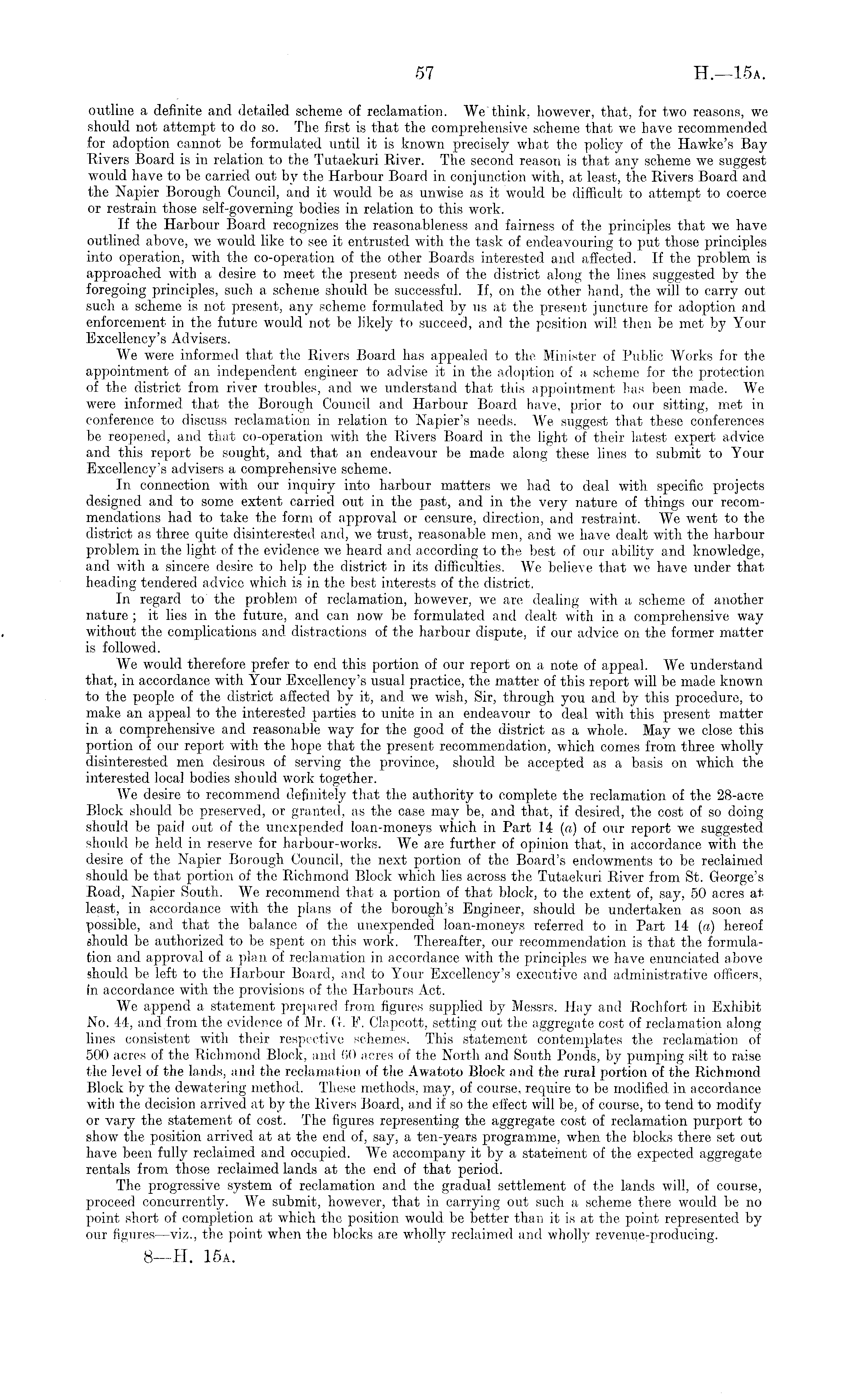 outline a definite and detailed scheme of reclamation. We think, however, that, for two reasons, we should not attempt to do so. The first is that the comprehensive scheme that we have recommended for adoption cannot be formulated until it is known precisely what the policy of the Hawke's Bay Rivers Board is in relation to the Tutaekuri River. The second reason is that any scheme we suggest would have to be carried out by the Harbour Board in conjunction with, at least, the Rivers Board and the Napier Borough Council, and it would be as unwise as it would be difficult to attempt to coerce or restrain those self-governing bodies in relation to this work. If the Harbour Board recognizes the reasonableness and fairness of the principles that we have outlined above, we would like to see it entrusted with the task of endeavouring to put those principles into operation, with the co-operation of the other Boards interested and affected. If the problem is approached with a desire to meet the present needs of the district along the lines suggested by the foregoing principles, such a scheme should be successful. If, on the other hand, the will to carry out such a scheme is not present, any scheme formulated by us at the present juncture for adoption and enforcement in the future would not be likely to succeed, and the position will then be met by Your Excellency's Advisers. We were informed that the Rivers Board has appealed to the Minister of Public Works for the appointment of an independent engineer to advise it in the adoption of a scheme for the protection of the district from river troubles, and we understand that this appointment has been made. We were informed that the Borough Council and Harbour Board have, prior to our sitting, met in conference to discuss reclamation in relation to Napier's needs. We suggest that these conferences be reopened, and that co-operation with the Rivers Board in the light of their latest expert advice and this report be sought, and that an endeavour be made along these lines to submit to Your Excellency's advisers a comprehensive scheme. In connection with our inquiry into harbour matters we had to deal with specific projects designed and to some extent carried out in the past, and in the very nature of things our recommendations had to take the form of approval or censure, direction, and restraint. We went to the district as three quite disinterested and, we trust, reasonable men, and we have dealt with the harbour problem in the light of the evidence we heard and according to the best of our ability and knowledge, and with a sincere desire to help the district in its difficulties. We believe that we have under that heading tendered advice which is in the best interests of the district. In regard to the problem of reclamation, however, we are dealing with a scheme of another nature ; it lies in the future, and can now be formulated and dealt with in a comprehensive way without the complications and distractions of the harbour dispute, if our advice on the former matter is followed. We would therefore prefer to end this portion of our report on a note of appeal. We understand that, in accordance with Your Excellency's usual practice, the matter of this report will be made known to the people of the district affected by it, and we wish, Sir, through you and. by this procedure, to make an appeal to the interested parties to unite in an endeavour to deal with this present matter in a comprehensive and reasonable way for the good of the district as a whole. May we close this portion of our report with the hope that the present recommendation, which comes from three wholly disinterested men desirous of serving the province, should be accepted as a basis on which the interested local bodies should work together. We desire to recommend definitely that the authority to complete the reclamation of the 28-acre Block should be preserved, or granted, as the case may be, and that, if desired, the cost of so doing should be paid out of the unexpended loan-moneys which in Part 14 (a) of our report we suggested should be held in reserve for harbour-works. We are further of opinion that, in accordance with the desire of the Napier Borough Council, the next portion of the Board's endowments to be reclaimed should be that portion of the Richmond Block which lies across the Tutaekuri River from St. George's Road, Napier South. We recommend that a portion of that block, to the extent of, say, 50 acres at least, in accordance with the plans of the borough's Engineer, should be undertaken as soon as possible, and that the balance of the unexpended loan-moneys referred to in Part 14 (a) hereof should be authorized to be spent on this work. Thereafter, our recommendation is that the formulation and approval of a plan of reclamation in accordance with the principles we have enunciated above should be left to the Harbour Board, and to Your Excellency's executive and administrative officers, in accordance with the provisions of the Harbours Act. We append a statement prepared from figures supplied by Messrs. Hay and Rochfort in Exhibit No. 44, and from the evidence of Mr. G. F. Clapcott, setting out the aggregate cost of reclamation along lines consistent with their respective schemes. This statement contemplates the reclamation of 500 acres of the Richmond Block, and 60 acres of the North and South Ponds, by pumping silt to raise the level of the lands, and the reclamation of the Awatoto Block and the rural portion of the Richmond Block by the dewatering method. These methods, may, of course, require to be modified in accordance with the decision arrived at by the Rivers Board, and if so the effect will be, of course, to tend to modify or vary the statement of cost. The figures representing the aggregate cost of reclamation purport to show the position arrived at at the end of, say, a ten-years programme, when the blocks there set out have been fully reclaimed and occupied. We accompan