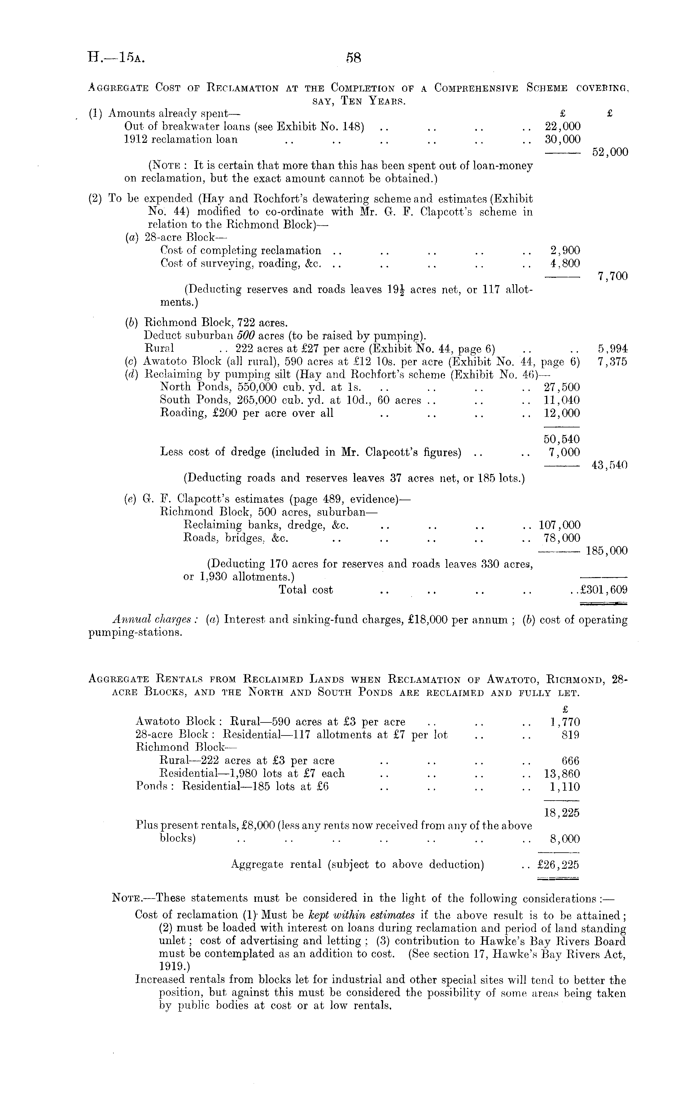 Aggregate Cost of Reclamation at the Completion of a Comprehensive Scheme covering, say, Ten Years. (1) Amounts already spent— £ £ Out of breakwater loans (see Exhibit No. 148) .. .. .. .. 22,000 1912 reclamation loan .. .. .. .. .. .. 30,000 52,000 (Note : It is certain that more than this has been spent out of loan-money on reclamation, but the exact amount cannot be obtained.) (2) To be expended (Hay and Rochfort's dewatering scheme and estimates (Exhibit No. 44) modified to co-ordinate with Mr. G. F. Clapcott's scheme in relation to the Richmond Block) — (a) 28-acre Block— Cost of completing reclamation .. .. .. .. .. 2,900 Cost of surveying, roading, &c. .. .. .. .. .. 4,800 7,700 (Deducting reserves and roads leaves 19J acres net, or 117 allotments.) (b) Richmond Block, 722 acres. Deduct suburban 500 acres (to be raised by pumping). Rural .. 222 acres at £27 per acre (Exhibit No. 44, page 6) .. .. 5,994 (c) Awatoto Block (all rural), 590 acres at £12 10s. per acre (Exhibit No. 44, page 6) 7,375 (d) Reclaiming by pumping silt (Hay and Rochfort's scheme (Exhibit No. 46) — North Ponds, 550,000 cub. yd. at Is. .. .. .. .. 27,500 South Ponds, 265,000 cub. yd. at 10d., 60 acres .. .. .. 11,040 Roading, £200 per acre over all .. .. .. .. 12,000 50,540 Less cost of dredge (included in Mr. Clapcott's figures) .. .. 7,000 43,540 (Deducting roads and reserves leaves 37 acres net, or 185 lots.) (e) G-. F. Clapcott's estimates (page 489, evidence) — Richmond Block, 500 acres, suburbanReclaiming banks, dredge, &c. .. .. .. .. 107,000 Roads, bridges. &c. .. .. .. .. .. 78,000 185,000 (Deducting 170 acres for reserves and roads leaves 330 acres, or 1,930 allotments.) Total cost .. .. .. .. .. £301,609 Annual charges : (a) Interest and sinking-fund charges, £18,000 per annum ; (b) cost of operating pumping-stations. Aggregate Rentals from Reclaimed Lands when Reclamation of Awatoto, Richmond, 28acre Blocks, and the North and South Ponds are reclaimed and fully let. £ Awatoto Block: Rural —590 acres at £3 per acre .. .. .. 1,770 28-acre Block : Residential—ll7 allotments at £7 per lot .. .. 819 Richmond Block— Rural—222 acres at £3 per acre .. .. .. .. 666 Residential—l,9Bo lots at £7 each .. .. .. .. 13,860 Ponds: Residential —185 lots at £6 .. .. .. .. 1,110 18,225 Plus present rentals, £8,000 (less any rents now received from any of the above blocks) .. . . .. .. .. .. .. 8,000 Aggregate rental (subject to above deduction) .. £26,225 Note. —These statements must be considered in the light of the following considerations :— Cost of reclamation (l)-Must be kept within estimates if the above result is to be attained; (2) must be loaded with interest on loans during reclamation and period of land standing unlet; cost of advertising and letting ; (3) contribution to Hawke's Bay Rivers Board must be contemplated as an addition to cost. (See section 17, Hawke's Bay Rivers Act, 1919.) Increased rentals from blocks let for industrial and other special sites will tend to better the position, but against this must be considered the possibility of some areas being taken by public bodies at cost or at low rentals.