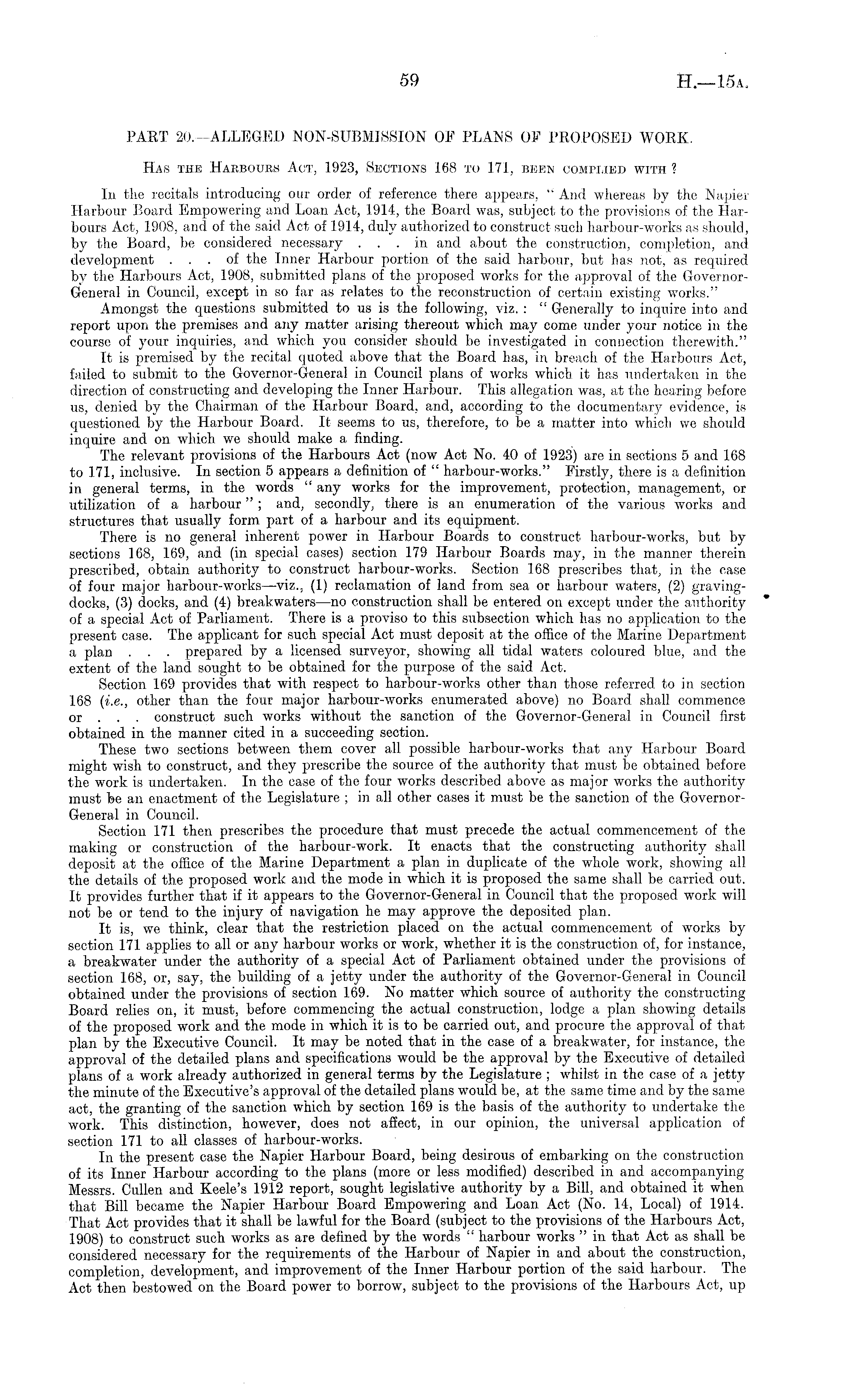 PART 20.—ALLEGED NON-SUBMISSION OF PLANS OP PROPOSED WORK. Has the Harbours Act, 1923, Sections 168 to 171, been complied with? In the recitals introducing our order of reference there appears, " And whereas by the Napier Harbour Board Empowering and Loan Act, 1914, the Board was, subject to the provisions of the Harbours Act, 1908, and of the said Act of 1914, duly authorized to construct such harbour-works as should, by the Board, be considered necessary ... in and about the construction, completion, and development ... of the Inner Harbour portion of the said harbour, but has not, as required by the Harbours Act, 1908, submitted plans of the proposed works for the approval of the GovernorGeneral in Council, except in so far as relates to the reconstruction of certain existing works." Amongst the questions submitted to us is the following, viz. : " Generally to inquire into and report upon the premises and any matter arising thereout which may come under your notice in the course of your inquiries, and which you consider should be investigated in connection therewith." It is premised by the recital quoted above that the Board has, in breach of the Harbours Act, failed to submit to the Governor-General in Council plans of works which it has undertaken in the direction of constructing and developing the Inner Harbour. This allegation was, at the hearing before us, denied by the Chairman of the Harbour Board, and, according to the documentary evidence, is questioned by the Harbour Board. It seems to us, therefore, to be a matter into which we should inquire and on which we should make a finding. The relevant provisions of the Harbours Act (now Act No. 40 of 1923) are in sections 5 and "168 to 171, inclusive. In section 5 appears a definition of " harbour-works." Firstly, there is a definition in general terms, in the words " any works for the improvement, protection, management, or utilization of a harbour" ; and, secondly, there is an enumeration of the various works and structures that usually form part of a harbour and its equipment. There is no general inherent power in Harbour Boards to construct harbour-works, but by sections 168, 169, and (in special cases) section 179 Harbour Boards may, in the manner therein prescribed, obtain authority to construct harbour-works. Section 168 prescribes that, in the case of four major harbour-works —-viz., (1) reclamation of land from sea or harbour waters, (2) gravingdocks, (3) docks, and (4) breakwaters —no construction shall be entered on except under the authority of a special Act of Parliament. There is a proviso to this subsection which has no application to the present case. The applicant for such special Act must deposit at the office of the Marine Department a plan . . . prepared by a licensed surveyor, showing all tidal waters coloured blue, and the extent of the land sought to be obtained for the purpose of the said Act. Section 169 provides that with respect to harbour-works other than those referred to in section 168 (i.e., other than the four major harbour-works enumerated above) no Board shall commence or . . . construct such works without the sanction of the Governor-General in Council first obtained in the manner cited in a succeeding section. These two sections between them cover all possible harbour-works that any Harbour Board might wish to construct, and they prescribe the source of the authority that must be obtained before the work is undertaken. In the case of the four works described above as major works the authority must be an enactment of the Legislature ; in all other cases it must be the sanction of the GovernorGeneral in Council. Section 171 then prescribes the procedure that must precede the actual commencement of the making or construction of the harbour-work. It enacts that the constructing authority shall deposit at the office of the Marine Department a plan in duplicate of the whole work, showing all the details of the proposed work and the mode in which it is proposed the same shall be carried out. It provides further that if it appears to the Governor-General in Council that the proposed work will not be or tend to the injury of navigation he may approve the deposited plan. It is, we think, clear that the restriction placed on the actual commencement of works by section 171 applies to all or any harbour works or work, whether it is the construction of, for instance, a breakwater under the authority of a special Act of Parliament obtained under the provisions of section 168, or, say, the building of a jetty under the authority of the Governor-General in Council obtained under the provisions of section 169. No matter which source of authority the constructing Board relies on, it must, before commencing the actual construction, lodge a plan showing details of the proposed work and the mode in which it is to be carried out, and procure the approval of that plan by the Executive Council. It may be noted that in the case of a breakwater, for instance, the approval of the detailed plans and specifications would be the approval by the Executive of detailed plans of a work already authorized in general terms by the Legislature ; whilst in the case of a jetty the minute of the Executive's approval of the detailed plans would be, at the same time and by the same act, the granting of the sanction which by section 169 is the basis of the authority to undertake the work. This distinction, however, does not affect, in our opinion, the universal application of section 171 to all classes of harbour-works. In the present case the Napier Harbour Board, being desirous of embarking on the construction of its Inner Harbour according to the plans (more or less modified) described in and accompanying Messrs. Cullen and Keele's 1912 report, sought legislative authority by a Bill, and obtained it when that Bill became the Napier Harbour Board Empowering and Loan Act (No. 14, Local) of 1914. That Act provides that it shall be law