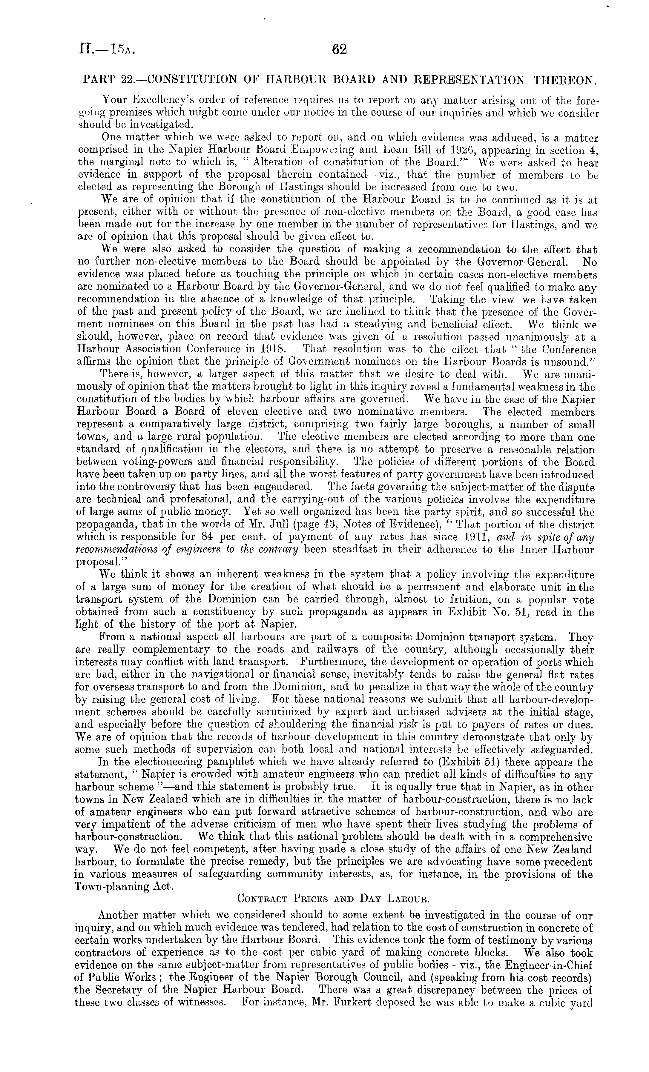 PART 22.—CONSTITUTION OF HARBOUR BOARD AND REPRESENTATION THEREON. Your Excellency's order of reference requires us to report on any matter arising out of the foregoing premises which might come under our notice in the course of our inquiries and which we consider should be investigated. One matter which we were asked to report on, and on which evidence was adduced, is a matter comprised in the Napier Harbour Board Empowering and Loan Bill of 1926, appearing in section 4, the marginal note to which is, " Alteration of constitution of the Board."* We were asked to hear evidence in support of the proposal therein contained—viz., that the number of members to be elected as representing the Borough of Hastings should be increased from one to two. We are of opinion that if the constitution of the Harbour Board is to be continued as it is at present, either with or without the presence of non-elective members on the Board, a good case has been made out for the increase by one member in the number of representatives for Hastings, and we are of opinion that this proposal should be given effect to. We were also asked to consider the question of making a recommendation to the effect that no further non-elective members to the Board should be appointed by the Governor-General. No evidence was placed before us touching the principle on which in certain cases non-elective members are nominated to a Harbour Board by the Governor-General, and we do not feel qualified to make any recommendation in the absence of a knowledge of that principle. Taking the view we have taken of the past and present policy of the Board, we are inclined to think that the presence of the Goverment nominees on this Board in the past has had a steadying and beneficial effect. We think we should, however, place on record that evidence was given of a resolution passed unanimously at a Harbour Association Conference in 1918. That resolution was to the effect that " the Conference affirms the opinion that the principle of Government nominees on the Harbour Boards is unsound." There is, however, a larger aspect of this matter that we desire to deal with. We are unanimously of opinion that the matters brought to light in this inquiry reveal a fundamental weakness in the constitution of the bodies by which harbour affairs are governed. We have in the case of the Napier Harbour Board a Board of eleven elective and two nominative members. The elected members represent a comparatively large district, comprising two fairly large boroughs, a number of small towns, and a large rural population. The elective members are elected according to more than one standard of qualification in the electors, and there is no attempt to preserve a reasonable relation between voting-powers and financial responsibility. The policies of different portions of the Board have been taken up on party lines, and all the worst features of party government have been introduced into the controversy that has been engendered. The facts governing the subject-matter of the dispute are technical and professional, and the carrying-out of the various policies involves the expenditure of large sums of public money. Yet so well organized has been the party spirit, and so successful the propaganda, that in the words of Mr. Jull (page 43, Notes of Evidence), " That portion of the district which is responsible for 84 per cent, of payment of any rates has since 1911, and in spite of any recommendations of engineers to the contrary been steadfast in their adherence to the Inner Harbour proposal." We think it shows an inherent weakness in the system that a policy involving the expenditure of a large sum of money for the creation of what should be a permanent and elaborate unit in the transport system of the Dominion can be carried through, almost to fruition, on a popular vote obtained from such a constituency by such propaganda as appears in Exhibit No. 51, read in the light of the history of the port at Napier. From a national aspect all harbours are part of a composite Dominion transport system. They are really complementary to the roads and railways of the country, although occasionally their interests may conflict with land transport. Furthermore, the development or operation of ports which are bad, either in the navigational or financial sense, inevitably tends to raise the general flat rates for overseas transport to and from the Dominion, and to penalize in that way the whole of the country by raising the general cost of living. For these national reasons we submit that all harbour-develop-ment schemes should be carefully scrutinized by expert and unbiased advisers at the initial stage, and especially before the question of shouldering the financial risk is put to payers of rates or dues. We are of opinion that the records of harbour development in this country demonstrate that only by some such methods of supervision can both local and national interests be effectively safeguarded. In the electioneering pamphlet which we have already referred to (Exhibit 51) there appears the statement, " Napier is crowded with amateur engineers who can predict all kinds of difficulties to any harbour scheme "—and this statement is probably true. It is equally true that in Napier, as in other towns in New Zealand which are in difficulties in the matter of harbour-construction, there is no lack of amateur engineers who can put forward attractive schemes of harbour-construction, and who are very impatient of the adverse criticism of men who have spent their lives studying the problems of harbour-construction. We think that this national problem should be dealt with in a comprehensive way. We do not feel competent, after having made a close study of the affairs of one New Zealand harbour, to formulate the precise remedy, but the principles we are advocating have some precedent in various measures of safeguarding community interests, as, for instance, in the provisions of the Town-planni