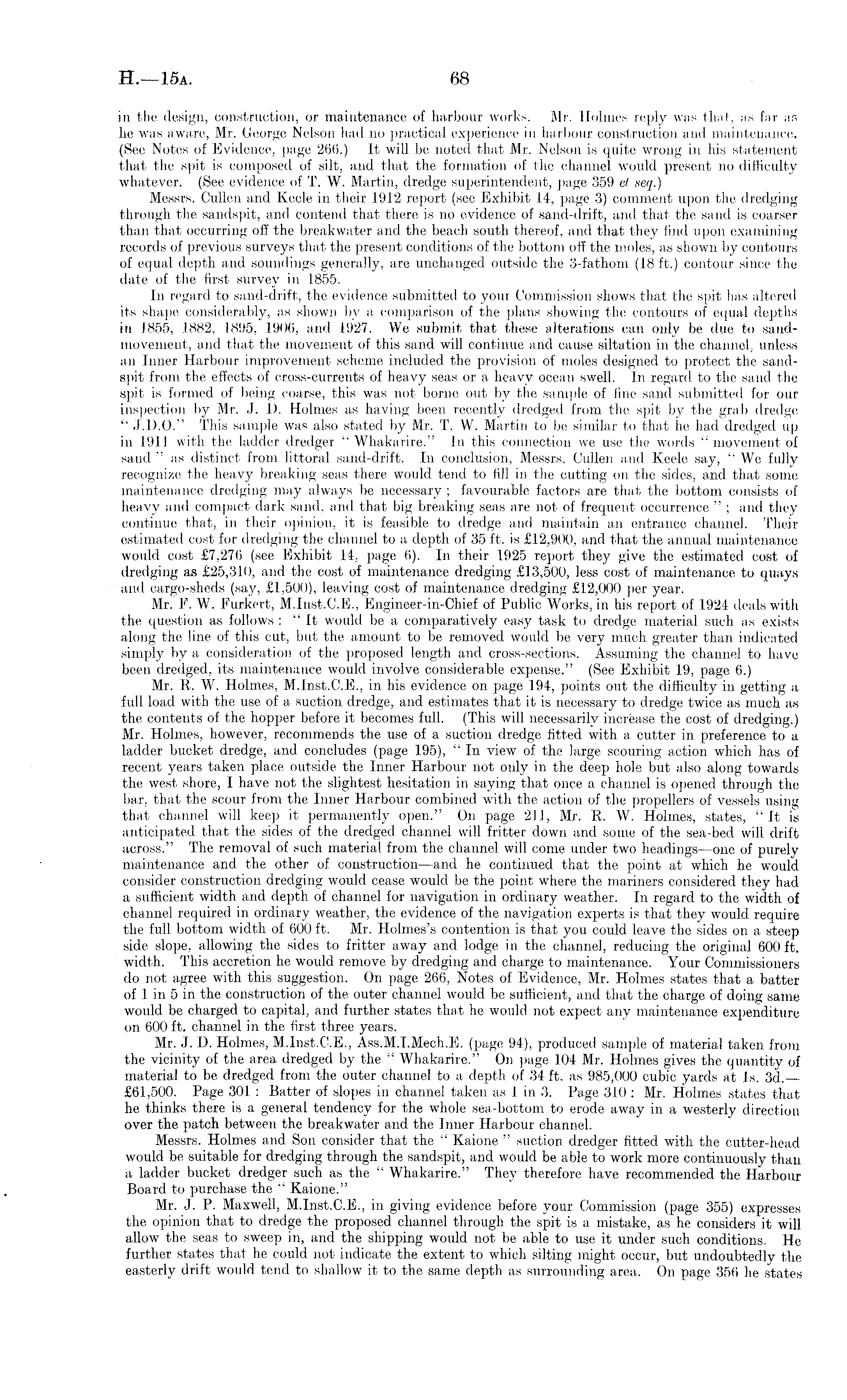 in the design, construction, or maintenance of harbour works. Mr. Holmes reply was that, as far as he was aware, Mr. George Nelson had no practical experience in harbour construction and maintenance. (See Notes of Evidence, page 26(5.) It. will be noted that Mr. Nelson is quite wrong in his statement that the spit is composed of silt, and that the formation of the channel would present 110 difficulty whatever. (See evidence of T. W. Martin, dredge superintendent, pa.ge 359 et seq.) Messrs. Cullen and Keele in their 1912 report (see Exhibit 14, page 3) comment upon the dredging through the sandspit, and contend that there is 110 evidence of sand-drift, and that the sand is coarser than that occurring off the breakwater and the beach south thereof, and that they find upon examining records of previous surveys that the present conditions of the bottom off the moles, as shown by contours of equal depth and soundings generally, are unchanged outside the 3-fathom (18 ft.) contour since the date of the first survey in 1855. In regard to sand-drift, the evidence submitted to your Commission shows that the spit has altered its shape considerably, as shown by a comparison of the plans showing the contours of equal depths in 1855, 1882, 1895, 1906, and 1927. We submit that these alterations can only be due to sandmovement, and that the movement of this sand will continue and cause siltation in the channel, unless an Inner Harbour improvement scheme included the provision of moles designed to protect the sandspit from the effects of cross-currents of heavy seas or a heavy ocean swell. In regard to the sand the spit is formed of being coarse, this was not borne out by the sample of fine sand submitted for our inspection by Mr. J. I). Holmes as having been recently dredged from the spit by the grab dredge " J.D.0." This sample was also stated by Mr. T. W. Martin to be similar to that he had dredged up in 1911 with the ladder dredger " Whakarire." In this connection we use the words " movement of sand " as distinct from littoral sand-drift. In conclusion, Messrs. Cullen and Keele say, "We fully recognize the heavy breaking seas there would tend to fill in the cutting on the sides, and that some maintenance dredging may always be necessary ; favourable factors are that the bottom consists of heavy and compact dark sand, and that big breaking seas are not of frequent occurrence " ; and they continue that, in their opinion, it is feasible to dredge and maintain an entrance channel. Their estimated cost for dredging the channel to a depth of 35 ft. is £12,900, and that the annual maintenance would cost £7,276 (see Exhibit 14, page 6). In their 1925 report they give the estimated cost of dredging as £25,310, and the cost of maintenance dredging £13,500, less cost of maintenance to quays and cargo-sheds (say, £1,500), leaving cost of maintenance dredging £12,000 per year. Mr. F. W. Furkert, M.lnst.C.E., Engineer-in-Chief of Public Works, in his report of 1924 deals witli the question as follows : "It would be a comparatively easy task to dredge material such as exists along the line of this cut, but the amount to be removed would be very much greater than indicated simply by a consideration of the proposed length and cross-sections. Assuming the channel to have been dredged, its maintenance would involve considerable expense." (See Exhibit 19, page 6.) Mr. R. W. Holmes, M.lnst.C.E., in his evidence on page 194, points out the difficulty in getting a full load with the use of a suction dredge, and estimates that it is necessary to dredge twice as much as the contents of the hopper before it becomes full. (This will necessarily increase the cost of dredging.) Mr. Holmes, however, recommends the use of a suction dredge fitted with a cutter in preference to a ladder bucket dredge, and concludes (page 195), " In view of the large scouring action which has of recent years taken place outside the Inner Harbour not only in the deep hole but also along towards the west shore, I have not the slightest hesitation in saying that once a channel is opened through the bar, that the scour from the Inner Harbour combined with the action of the propellers of vessels using that channel will keep it permanently open." On page 211, Mr. R. W. Holmes, states, "It is anticipated that the sides of the dredged channel will fritter down and some of the sea-bed will drift across." The removal of such material from the channel will come under two headings—one of purely maintenance and the other of construction —and he continued that the point at which he would consider construction dredging would cease would be the point where the mariners considered they had a sufficient width and depth of channel for navigation in ordinary weather. In regard to the width of channel required in ordinary weather, the evidence of the navigation experts is that they would require the full bottom width of 600 ft. Mr. Holmes's contention is that you could leave the sides on a steep side slope, allowing the sides to fritter away and lodge in the channel, reducing the original 600 ft. width. This accretion he would remove by dredging and charge to maintenance. Your Commissioners do not agree with this suggestion. On page 266, Notes of Evidence, Mr. Holmes states that a batter of 1 in 5 in the construction of the outer channel would be sufficient, and that the charge of doing same would be charged to capital, and further states that he would not expect any maintenance expenditure on 600 ft. channel in the first three years. Mr. J. D. Holmes, M.lnst.C.E., Ass.M.l.Mech.E. (page 94), produced sample of material taken from the vicinity of the area dredged by the " Whakarire." On page 104 Mr. Holmes gives the quantity of material to be dredged from the outer channel to a depth of 34 ft. as 985,000 cubic yards at Is. 3d.— £61,500. Page 301 : Batter of slopes in channel taken as lin 3. Page 310 : Mr. Holmes states that he thinks there is a general tenden