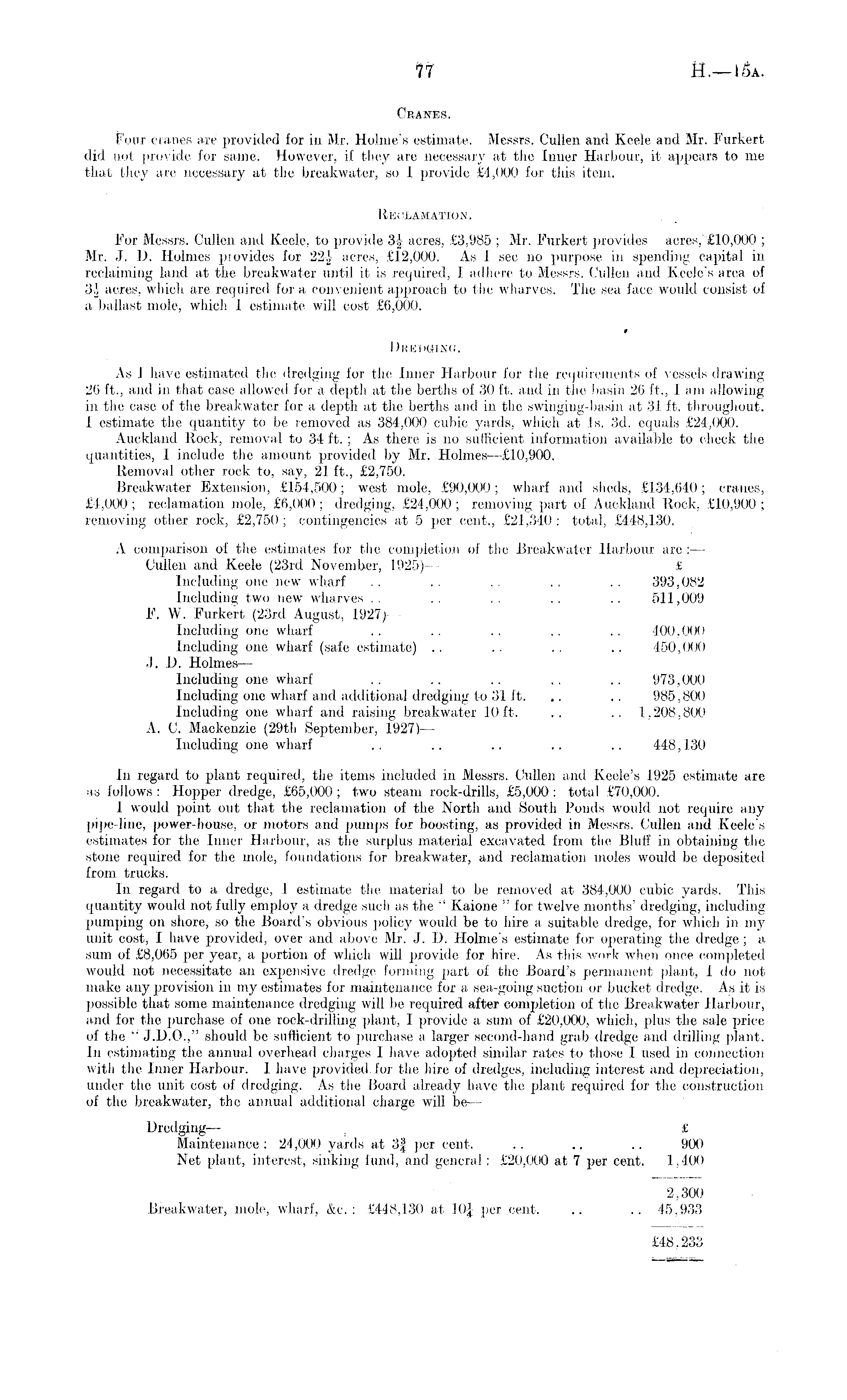 Cranes. Four cranes are provided for in Mr. Holme's estimate. Messrs. Cullen and Keele and Mr. Furkert did not provide for same. However, if they are necessary at the Inner Harbour, it appears to me that they are necessary at the breakwater, so I provide £4,000 for this item. Reclamation. For Messrs. Cullen and Keele, to provide 3-| acres, £3,985 ; Mr. Furkert provides acres, v £lo,ooo ; Mr. J. D. Holmes provides for 22|- acres, £12,000. As I see no purpose in spending capital in reclaiming land at the breakwater until it is required, I adhere to Messrs. Cullen and Keele's area of acres, which are required for a convenient approach to the wharves. The sea face would consist of a ballast mole, which 1 estimate will cost £6,000. Dredging. As I have estimated the dredging for the Inner Harbour for the requirements of vessels drawing 26 ft., and in that case allowed for a depth at the berths of 30 ft. and in the basin 26 ft., I am allowing in the case of the breakwater for a depth at the berths and in the swinging-basin at 31 ft. throughout. 1 estimate the quantity to be removed as 384,000 cubic yards, which at Is. 3d. equals £24,000. Auckland Rock, removal to 34 ft. ; As there is no sufficient information available to check the quantities, I include the amount provided by Mr. Holmes —£10,900. Removal other rock to, say, 21 ft., £2,750. Breakwater Extension, £154,500; west mole, £90,000; wharf and slieds, £134,640; cranes, £4,000 ; reclamation mole, £6,000 ; dredging, £24,000 ; removing part of Auckland Rock, £10,900 ; removing other rock, £2,750; contingencies at 5 per cent., £21,340 : total, £448,130. A comparison of the estimates for the completion of the Breakwater Harbour are : — Cullen and Keele (23rd November, 1925) — £ Including one new wharf . . . . . . . . .. 393,082 Including two new wharves .. .. .. .. .. 511,009 F. W. Furkert (23rd August, 1927) Including one wharf .. .. .. .. 400,000 Including one wharf (safe estimate) .. .. .. .. 450,000 J. D. HolmesIncluding one wharf .. .. .. .. .. 973,000 Including one wharf and additional dredging to 31 ft. .. .. 985,800 Including one wharf and raising breakwater 10 ft. .. .. 1,208,800 A. C. Mackenzie (29th September, 1927) — Including one wharf .. .. .. .. .. 448,130 In regard to plant required, the items included in Messrs. Cullen and Keele's 1925 estimate are as follows : Hopper dredge, £65,000 ; two steam rock-drills, £5,000 : total £70,000. I would point out that the reclamation of the North and South Ponds would not require any pipe-line, power-house, or motors and pumps for boosting, as provided in Messrs. Cullen and Keele's estimates for the Inner Harbour, as the surplus material excavated from the Bluff in obtaining the stone required for the mole, foundations for breakwater, and reclamation moles would be deposited from trucks. In regard to a dredge, I estimate the material to be removed at 384,000 cubic yards. This quantity would not fully employ a dredge such as the " Kaione " for twelve months' dredging, including pumping on shore, so the Board's obvious policy would be to hire a suitable dredge, for which in my unit cost, I have provided, over and above Mr. J. I). Holme's estimate for operating the dredge; a sum of £8,065 per year, a portion of which will provide for hire. As this work when once completed would not necessitate an expensive dredge forming part of the Board's permanent plant, 1 do not make any provision in my estimates for maintenance for a sea-going suction or bucket dredge. As it is possible that some maintenance dredging will be required after completion of the Breakwater Harbour, and for the purchase of one rock-drilling plant, I provide a sum of £20,000, which, plus the sale price of the " J.D.0.," should be sufficient to purchase a larger second-hand grab dredge and drilling plant. In estimating the annual overhead charges I have adopted similar rates to those I used in connection with the Inner Harbour. I have provided for the hire of dredges, including interest and depreciation, under the unit cost of dredging. As the Board already have the plant required for the construction of the breakwater, the annual additional charge will be— Dredging— £ Maintenance : 24,000 yards at 3| per cent. .. .. .. 900 Net plant, interest, sinking fund, and general: £20,000 at 7 per cent. 1.400 2,300 Breakwater, mole, wharf, &c.: £448,130 at 10J per cent. .. .. 45,933 £48,233