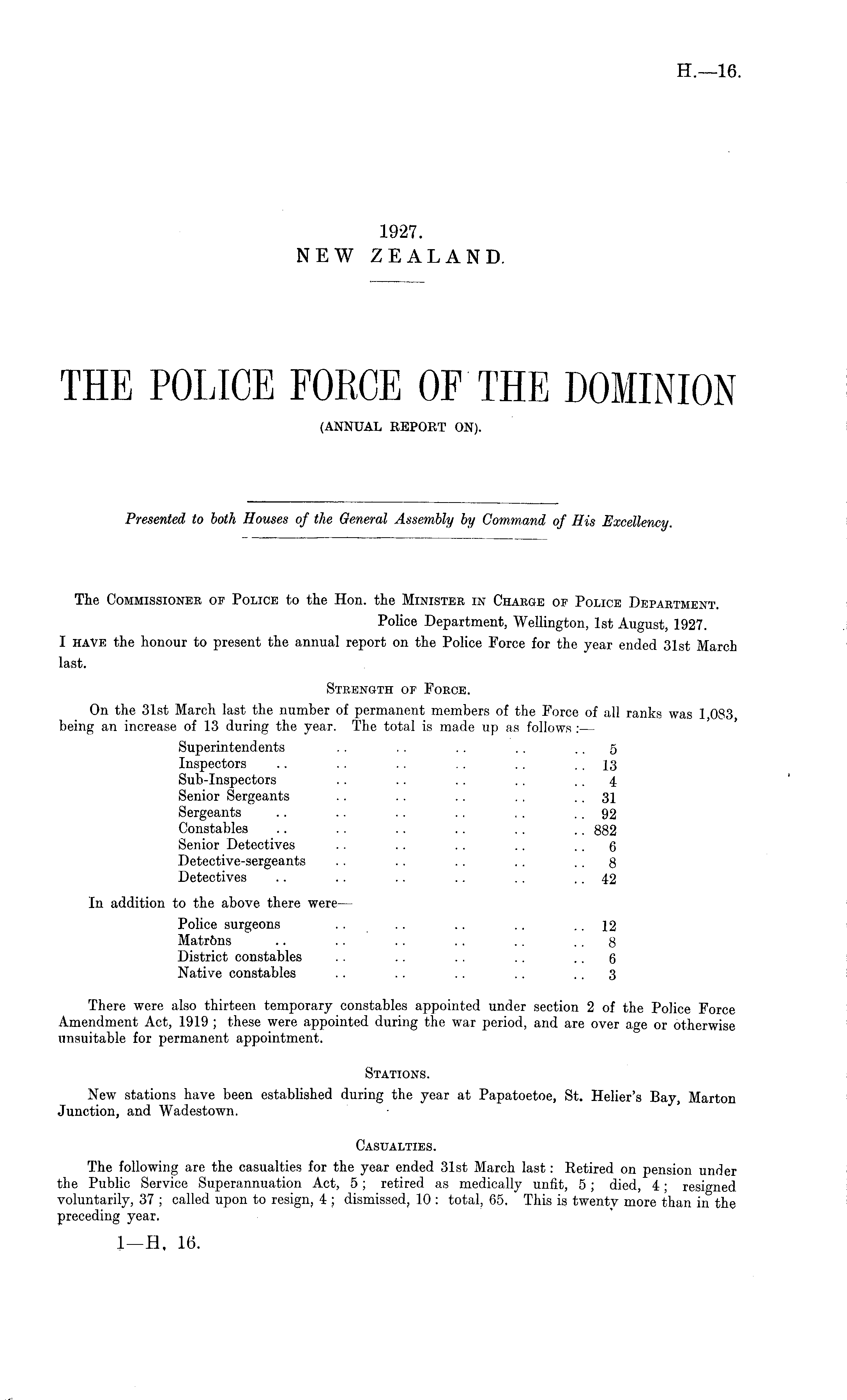 The Commissioner of Police to the Hon. the Minister in Charge of Police Department. Police Department, Wellington, Ist August, 1927. I have the honour to present the annual report on the Police Force for the year ended 31st March last. Strength of Force. On the 31st March last the number of permanent members of the Force of all ranks was 1 083 being an increase of 13 during the year. The total is made up as follows :— Superintendents .. .. .. .. .. 5 Inspectors .. .. .. .. .. .. 13 Sub-Inspectors .. .. .. .. .. 4 Senior Sergeants .. .. .. .. .. 31 Sergeants .. .. .. .. . . .. 92 Constables .. .. .. .. .. .. 882 Senior Detectives .. .. .. .. .. 6 Detective-sergeants .. .. .. .. .. 8 Detectives .. .. .. .. .. 42 In addition to the above there were — Police surgeons .. .. .. .. .. 12 Matr&ns .. .. .. .. .. .. 8 District constables .. .. .. .. .. 6 Native constables .. .. .. .. .. 3 There were also thirteen temporary constables appointed under section 2 of the Police Force Amendment Act, 1919 ; these were appointed during the war period, and are over age or otherwise unsuitable for permanent appointment. Stations. New stations have been established during the year at Papatoetoe, St. Helier's Bay, Marton Junction, and Wadestown. Casualties. The following are the casualties for the year ended 31st March last: Retired on pension under the Public Service Superannuation Act, 5; retired as medically unfit, 5; died, 4; resigned voluntarily, 37 ; called upon to resign, 4 ; dismissed, 10 : total, 65. This is twenty more than in the preceding year.