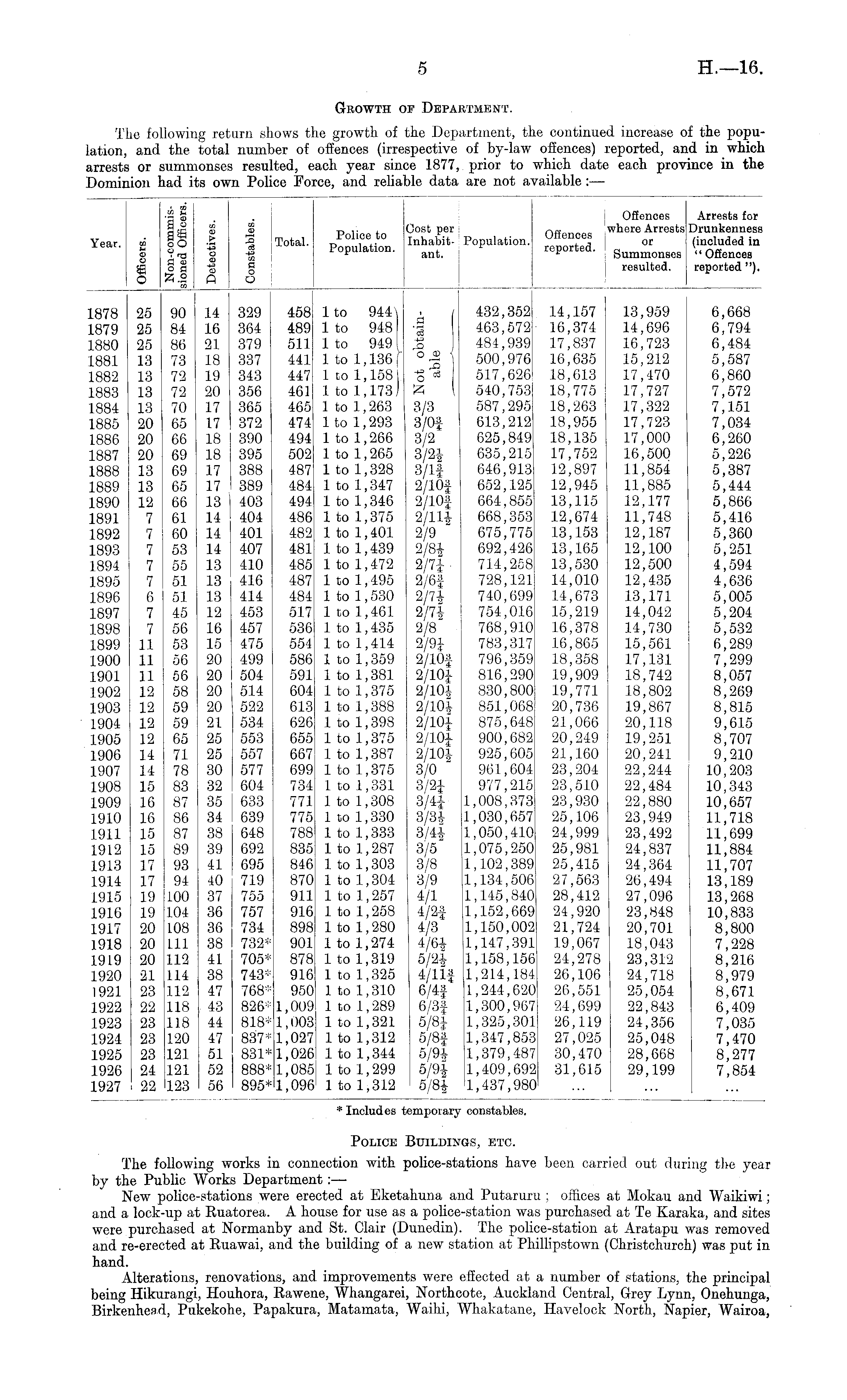 Growth of Department. The following return shows the growth of the Department, the continued increase of the population, and the total number of offences (irrespective of by-law offences) reported, and in which arrests or summonses resulted, each year since 1877, prior to which date each province in the Dominion had its own Police Force, and reliable data are not available: —