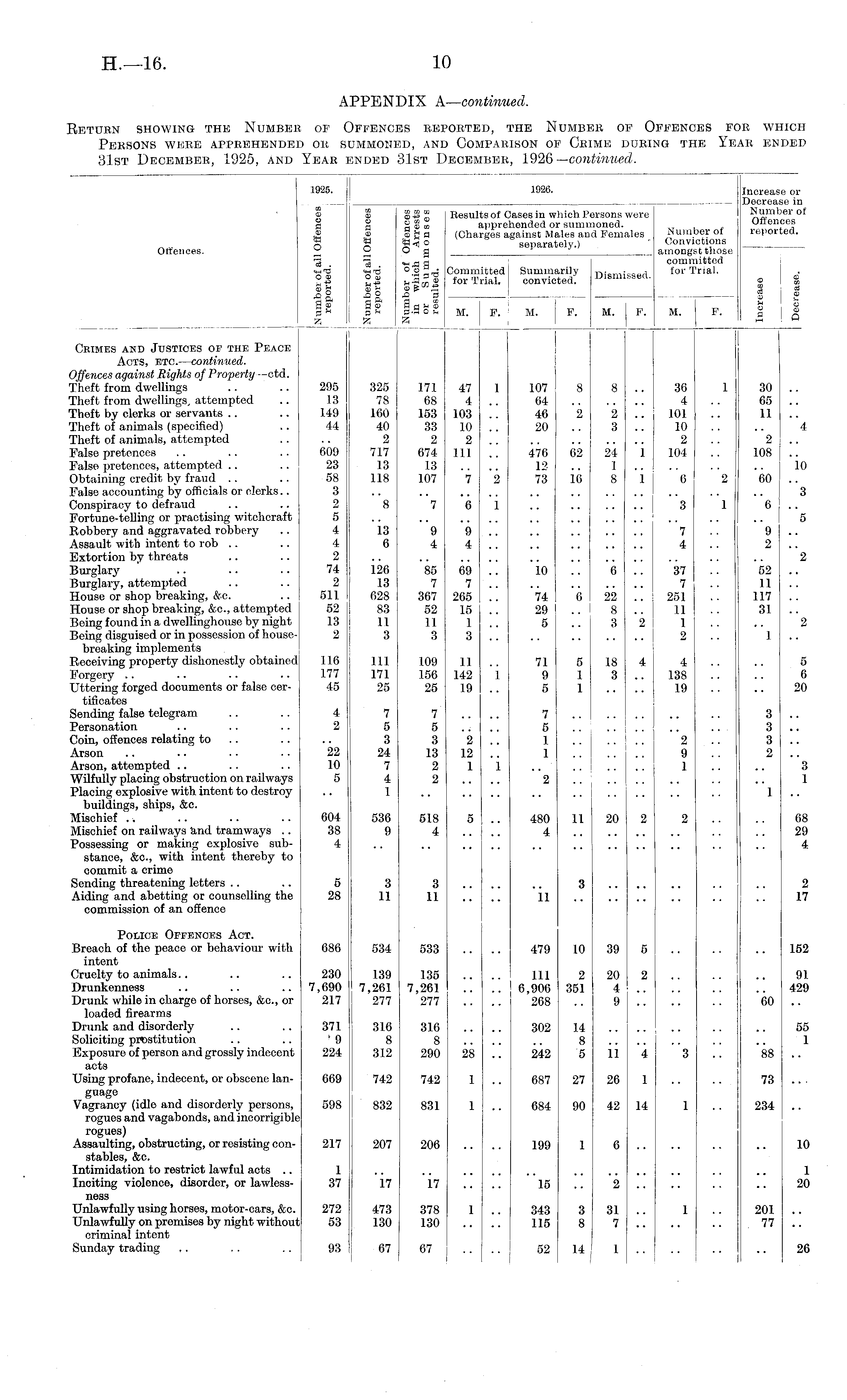 APPENDIX A—continued. Return showing the Number of Offences reported, the Number of Offences for which Persons were apprehended or summoned, and Comparison of Crime during the Year ended 31st December, 1925, and Year ended 31st December, 1926—continued.