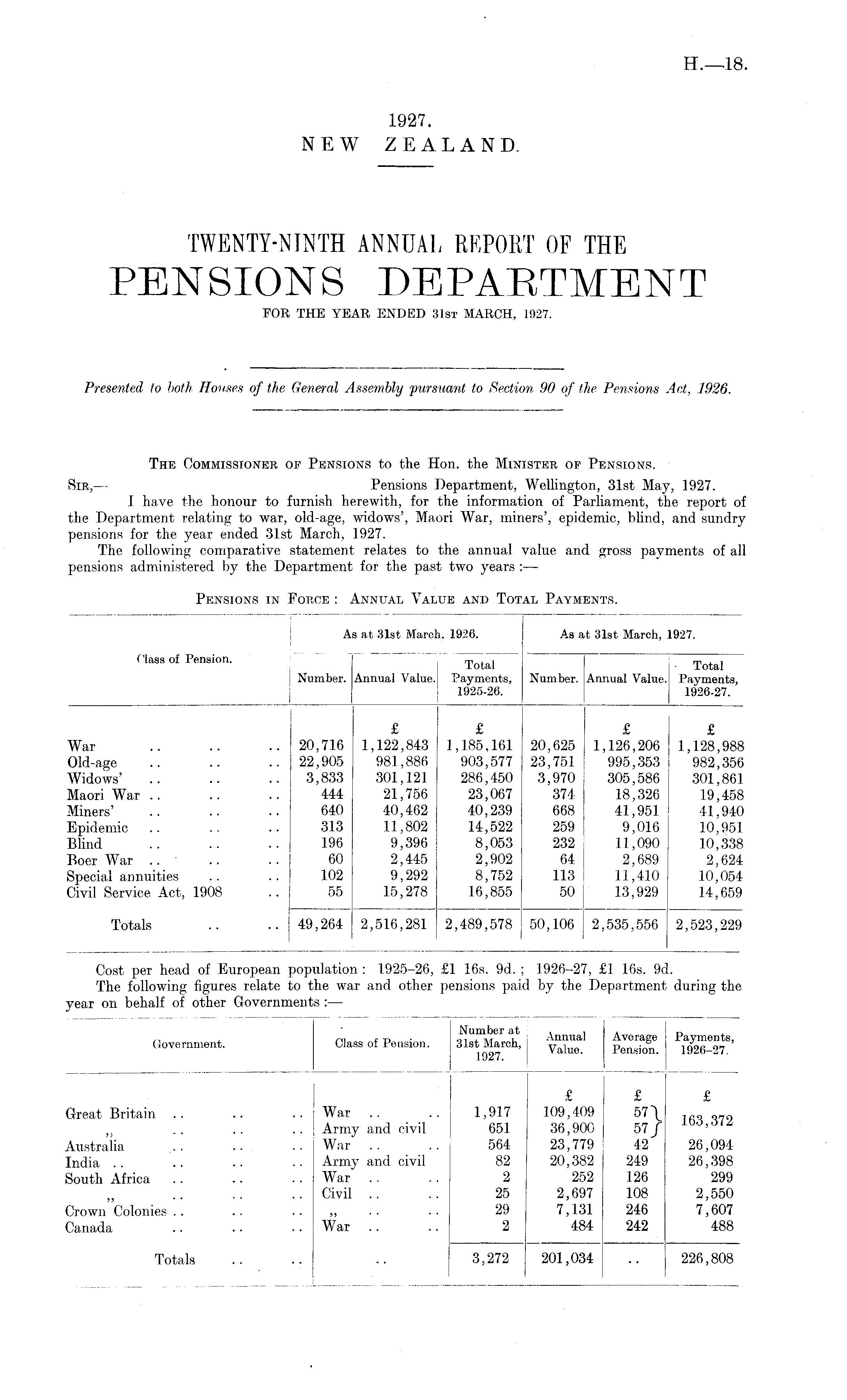 The Commissioner, op Pensions to the Hon. the Minister of Pensions. Sir, — Pensions Department, Wellington, 31st May, 1927. I have the honour to furnish herewith, for the information of Parliament, the report of the Department relating to war, old-age, widows', Maori War, miners', epidemic, blind, and sundry pensions for the year ended 31st March, 1927. The following comparative statement relates to the annual value and gross payments of all pensions administered by the Department for the past two years : —