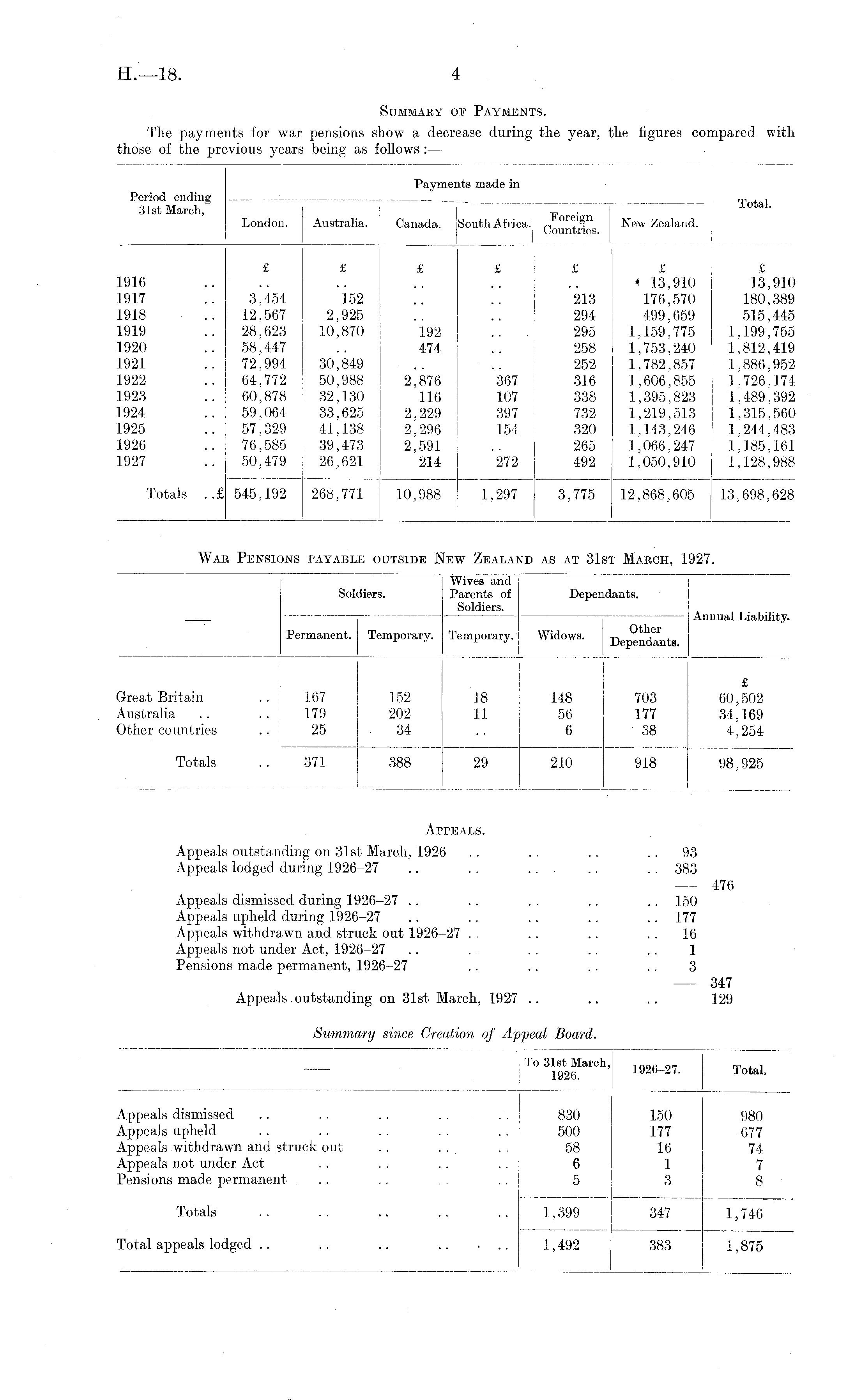 Appeals. Appeals outstanding on 31st March, 1926 .. . . .. 93 Appeals lodged during 1926-27 .. . . ... .. . . 383 476 Appeals dismissed during 1926-27 .. . . . . .. . . 150 Appeals upheld during 1926-27 .. . . . . .. .. 177 Appeals withdrawn and struck out 1926-27 . .. .. 16 Appeals not under Act, 1926-27 .. . . . .. .. 1 Pensions made permanent, 1926-27 . . . . . . . . 3 347 Appeals .outstanding on 31st March, 1927 .. .. .. 129